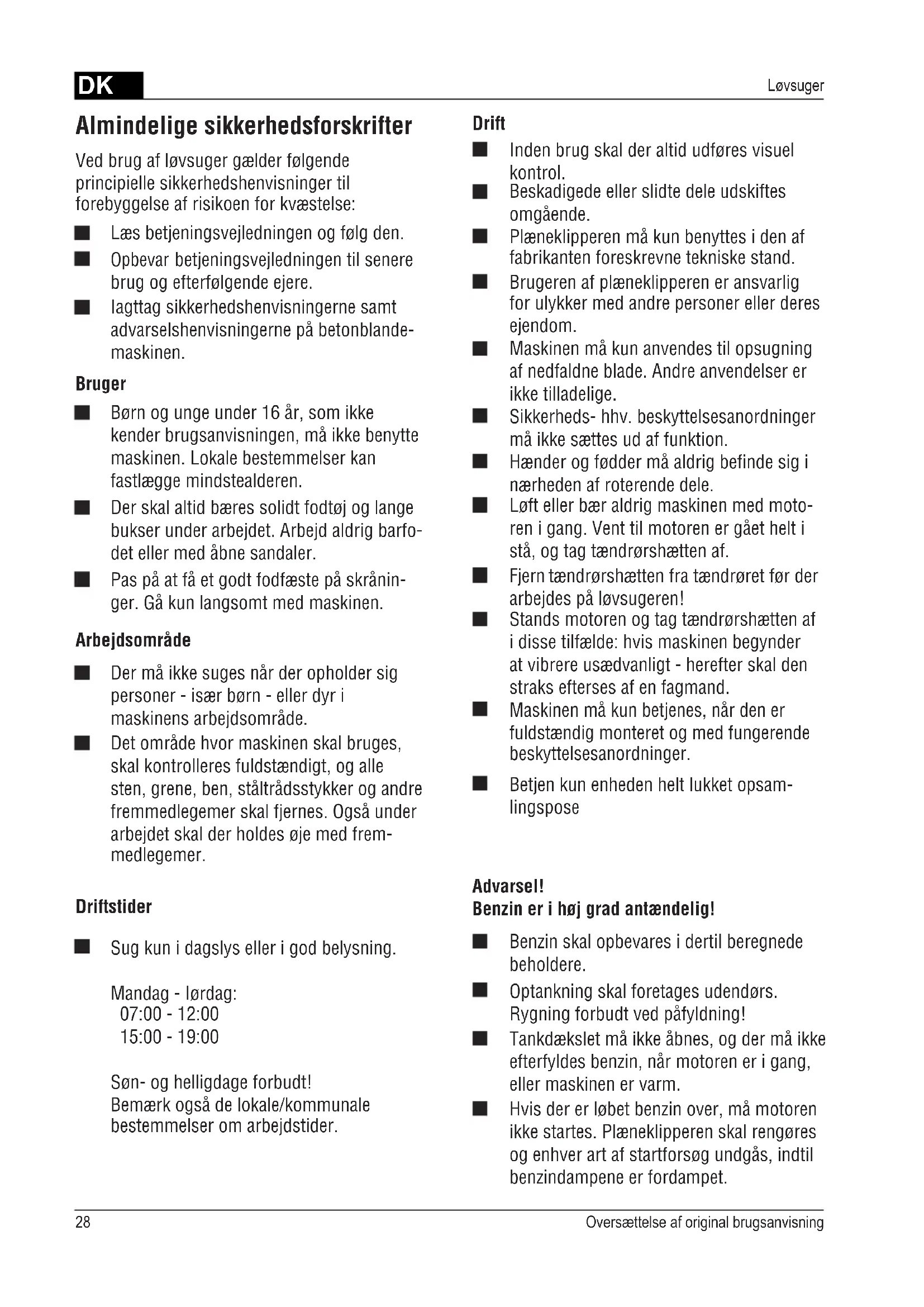 Løvsuger Ved brug af løvsuger gælder følgende principielle sikkerhedshenvisninger til forebyggelse af risikoen for kvæstelse: Almindelige sikkerhedsforskrifter Læs betjeningsvejledningen og følg den. Opbevar betjeningsvejledningen til senere brug og efterfølgende ejere. Iagttag sikkerhedshenvisningerne samt advarselshenvisningerne på betonblande- maskinen. Bruger Børn og unge under 16 år, som ikke kender brugsanvisningen, må ikke benytte maskinen. Lokale bestemmelser kan fastlægge mindstealderen. Der skal altid bæres solidt fodtøj og lange bukser under arbejdet. Arbejd aldrig barfo- det eller med åbne sandaler. Arbejdsområde Der må ikke suges når der opholder sig personer - især børn - eller dyr i maskinens arbejdsområde. Det område hvor maskinen skal bruges, skal kontrolleres fuldstændigt, og alle sten, grene, ben, ståltrådsstykker og andre fremmedlegemer skal fjernes. Også under arbejdet skal der holdes øje med frem- medlegemer. Driftstider Sug kun i dagslys eller i god belysning. Mandag - Iørdag: 07:00 - 12:00 15:00 - 19:00 Søn- og helligdage forbudt! Bemærk også de lokale/kommunale bestemmelser om arbejdstider. Pas på at få et godt fodfæste på skrånin- ger. Gå kun langsomt med maskinen. Drift Inden brug skal der altid udføres visuel kontrol. Beskadigede eller slidte dele udskiftes omgående. Plæneklipperen må kun benyttes i den af fabrikanten foreskrevne tekniske stand. Brugeren af plæneklipperen er ansvarlig for ulykker med andre personer eller deres ejendom. Maskinen må kun anvendes til opsugning af nedfaldne blade. Andre anvendelser er ikke tilladelige. Sikkerheds- hhv. beskyttelsesanordninger må ikke sættes ud af funktion. Hænder og fødder må aldrig befinde sig i nærheden af roterende dele. Løft eller bær aldrig maskinen med moto- ren i gang. Vent til motoren er gået helt i stå, og tag tændrørshætten af. Fjern tændrørshætten fra tændrøret før der arbejdes på løvsugeren! Stands motoren og tag tændrørshætten af i disse tilfælde: hvis maskinen begynder at vibrere usædvanligt - herefter skal den straks efterses af en fagmand. Advarsel! Benzin er i høj grad antændelig! Benzin skal opbevares i dertil beregnede beholdere. Optankning skal foretages udendørs. Rygning forbudt ved påfyldning! Tankdækslet må ikke åbnes, og der må ikke efterfyldes benzin, når motoren er i gang, eller maskinen er varm. Hvis der er løbet benzin over, må motoren ikke startes. Plæneklipperen skal rengøres og enhver art af startforsøg undgås, indtil benzindampene er fordampet. Maskinen må kun betjenes, når den er fuldstændig monteret og med fungerende beskyttelsesanordninger. Betjen kun enheden helt lukket opsam- lingsposeDK 29528123_i Beskadiget benzintank og tankdæksel skal af sikkerhedsmæssige årsager udskiftes. Benyt en tragt eller et påfyldningsrør til optankning for at undgå at der løber brændstof ud på motoren, huset hhv. plænen. Risiko for forbrænding! Udstødnin- gen samt området omkring udstødningen kan opvarmes indtil 80 °C. Udskift beskadigede lydpotter. Regulatorindstillinger på motoren må ikke ændres. Forbrændingsmotoren må aldrig være i gang i lukkede rum: - Risiko for forgiftning! - Reservedele og tilbehør Brug kun originale reservedele og originalt tilbehør. Konstruktions- og udførelsesændringer forbeholdt. I denne betjeningsvejledning Fare! Kvæstelsesfare ved tilsi- desættelse af anvisningen. Montering Lagttag den separate vedlagte monte- ringsvejledning i forbindelse med montering af plæneklipperen. Sikkerhedsanordninger Sikkerhedsbøjle Slip sikkerhedsbøjlen hvis der skulle opstå en farlig situation. Motor og skæreværk stoppes. Sikkerhedsbøjlens funktion må ikke sættes ud af funktion. Betydningen af symbolerne på klipperen Læs betjeningsvejledningen før klipperen tages i brug! Hold tredjemand borte fra fareområdet! Fjern tændrørshætten fra tændrøret før der arbejdes på løvsugeren! Advarsel, fare! Hold hænder og fødder borte fra sugeåbningen! Tal til venstre for teksten (f.eks.. ) henviser til illustrationerne. Udtjente maskiner må ikke bortskaffes sammen med normalt husholdningsaf- fand! Emballagen , maskinen og tilbehøret er fremstilles af genbrugelige materialer og skal bortskaffes tilsvarende. Ibrugtagning Plæneklipperen må først tages i brug, når monteringen er udført komplet.