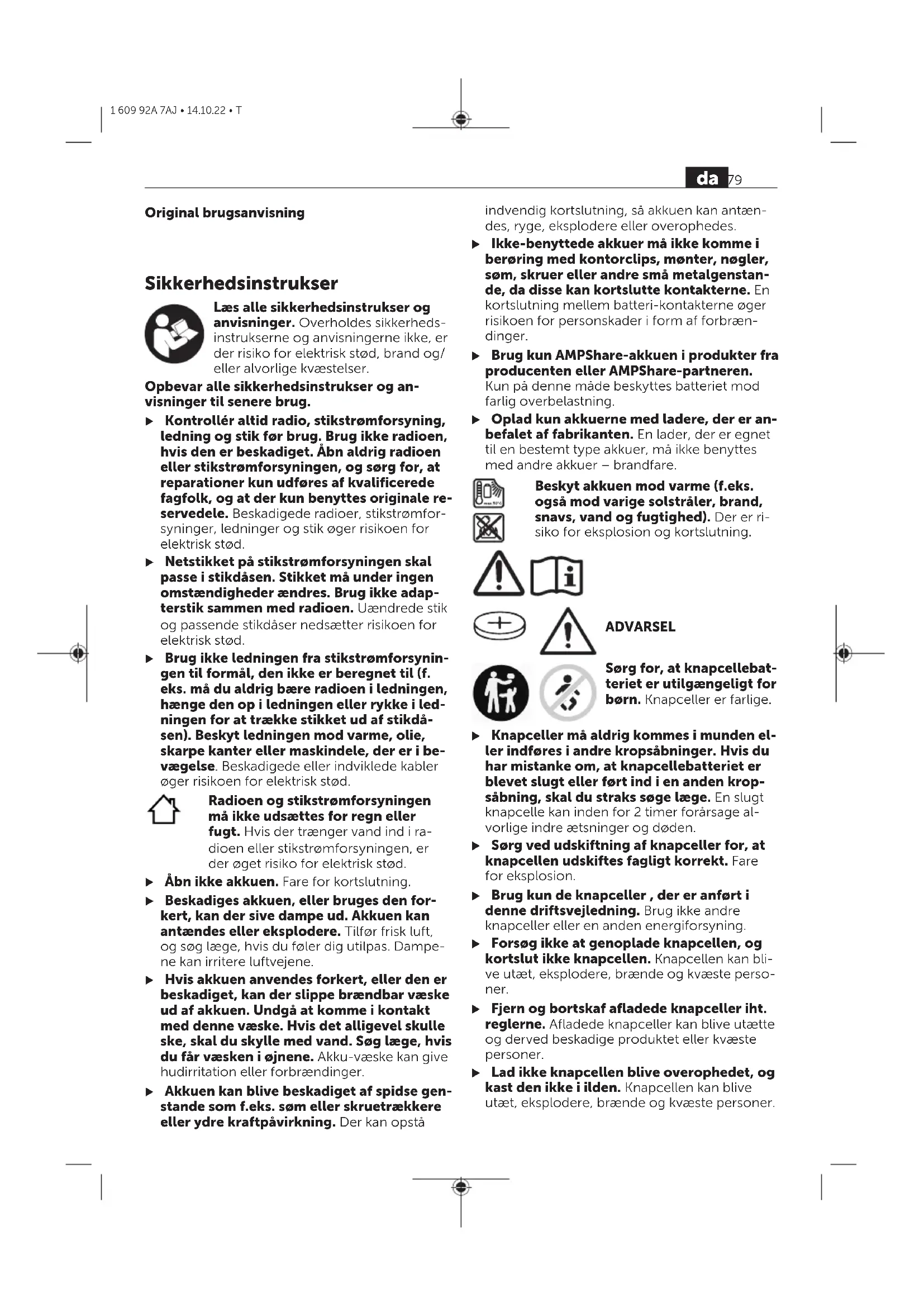 Μόνο για χώρες τηςΕΕ:Ελληνικά Σύμφωνα με την Ευρωπαϊκή οδηγία 2012/19/ΕΕ σχετικά με τις παλιές ηλεκτρικές και ηλεκτρονικές συσκευές και τη μεταφορά της οδηγίας αυτής σε εθνικό δίκαιο οι άχρηστες ηλεκτρικές συσκευές και σύμφωνα με την Ευρωπαϊκή οδηγία 2006/66/ ΕΚ οι χαλασμένες ή χρησιμοποιημένες μπαταρίες πρέπει να συλλέγονται ξεχωριστά, για να ανακυ- κλωθούν με τρόπο φιλικό προς το περιβάλλον. Σε περίπτωση μη ενδεδειγμένης απόσυρσης οι ηλεκτρικές και ηλεκτρονικές συσκευές λόγω εν- δεχομένης παρουσίας επικίνδυνων ουσιών μπο- ρούν να έχουν επιβλαβείς επιπτώσεις στο περι- βάλλον και στην ανθρώπινη υγεία. Επαναφορτιζόμενες μπαταρίες/Μπαταρίες:Ελληνικά Li-Ion: Προσέξτε παρακαλώ τις υποδείξεις στην ενότητα Μεταφορά (βλέπε «Μεταφορά», Σελίδα78). 78 el 1 609 92A 7AJ • 14.10.22 • TOriginal brugsanvisning SikkerhedsinstrukserDansk Læs alle sikkerhedsinstrukser og anvisninger. Overholdes sikkerheds- instrukserne og anvisningerne ikke, er der risiko for elektrisk stød, brand og/ eller alvorlige kvæstelser. Opbevar alle sikkerhedsinstrukser og an- visninger til senere brug. u Kontrollér altid radio, stikstrømforsyning, ledning og stik før brug. Brug ikke radioen, hvis den er beskadiget. Åbn aldrig radioen eller stikstrømforsyningen, og sørg for, at reparationer kun udføres af kvalificerede fagfolk, og at der kun benyttes originale re- servedele. Beskadigede radioer, stikstrømfor- syninger, ledninger og stik øger risikoen for elektrisk stød. u Netstikket på stikstrømforsyningen skal passe i stikdåsen. Stikket må under ingen omstændigheder ændres. Brug ikke adap- terstik sammen med radioen. Uændrede stik og passende stikdåser nedsætter risikoen for elektrisk stød. u Brug ikke ledningen fra stikstrømforsynin- gen til formål, den ikke er beregnet til (f. eks. må du aldrig bære radioen i ledningen, hænge den op i ledningen eller rykke i led- ningen for at trække stikket ud af stikdå- sen). Beskyt ledningen mod varme, olie, skarpe kanter eller maskindele, der er i be- vægelse. Beskadigede eller indviklede kabler øger risikoen for elektrisk stød. Radioen og stikstrømforsyningen må ikke udsættes for regn eller fugt. Hvis der trænger vand ind i ra- dioen eller stikstrømforsyningen, er der øget risiko for elektrisk stød. u Åbn ikke akkuen. Fare for kortslutning. u Beskadiges akkuen, eller bruges den for- kert, kan der sive dampe ud. Akkuen kan antændes eller eksplodere. Tilfør frisk luft, og søg læge, hvis du føler dig utilpas. Dampe- ne kan irritere luftvejene. u Hvis akkuen anvendes forkert, eller den er beskadiget, kan der slippe brændbar væske ud af akkuen. Undgå at komme i kontakt med denne væske. Hvis det alligevel skulle ske, skal du skylle med vand. Søg læge, hvis du får væsken i øjnene. Akku-væske kan give hudirritation eller forbrændinger. u Akkuen kan blive beskadiget af spidse gen- stande som f.eks. søm eller skruetrækkere eller ydre kraftpåvirkning. Der kan opstå indvendig kortslutning, så akkuen kan antæn- des, ryge, eksplodere eller overophedes. u Ikke-benyttede akkuer må ikke komme i berøring med kontorclips, mønter, nøgler, søm, skruer eller andre små metalgenstan- de, da disse kan kortslutte kontakterne. En kortslutning mellem batteri-kontakterne øger risikoen for personskader i form af forbræn- dinger. u Brug kun AMPShare-akkuen i produkter fra producenten eller AMPShare-partneren. Kun på denne måde beskyttes batteriet mod farlig overbelastning. u Oplad kun akkuerne med ladere, der er an- befalet af fabrikanten. En lader, der er egnet til en bestemt type akkuer, må ikke benyttes med andre akkuer – brandfare. Beskyt akkuen mod varme (f.eks. også mod varige solstråler, brand, snavs, vand og fugtighed). Der er ri- siko for eksplosion og kortslutning. ADVARSEL Sørg for, at knapcellebat- teriet er utilgængeligt for børn. Knapceller er farlige. u Knapceller må aldrig kommes i munden el- ler indføres i andre kropsåbninger. Hvis du har mistanke om, at knapcellebatteriet er blevet slugt eller ført ind i en anden krop- såbning, skal du straks søge læge. En slugt knapcelle kan inden for 2timer forårsage al- vorlige indre ætsninger og døden. u Sørg ved udskiftning af knapceller for, at knapcellen udskiftes fagligt korrekt. Fare for eksplosion. u Brug kun de knapceller , der er anført i denne driftsvejledning. Brug ikke andre knapceller eller en anden energiforsyning. u Forsøg ikke at genoplade knapcellen, og kortslut ikke knapcellen. Knapcellen kan bli- ve utæt, eksplodere, brænde og kvæste perso- ner. u Fjern og bortskaf afladede knapceller iht. reglerne. Afladede knapceller kan blive utætte og derved beskadige produktet eller kvæste personer. u Lad ikke knapcellen blive overophedet, og kast den ikke i ilden. Knapcellen kan blive utæt, eksplodere, brænde og kvæste personer. da 79 1 609 92A 7AJ • 14.10.22 • Tu Knapcellen må ikke beskadiges eller skilles ad. Knapcellen kan blive utæt, eksplodere, brænde og kvæste personer. u En beskadiget knapcelle må ikke komme i kontakt med vand. Udslippende litium i for- bindelse med vand kan danne brint og derved forårsage en brand, en eksplosion eller kvæ- stelse af personer. Navnet Bluetooth ® og logoerne er registrere- de varemærker tilhørende Bluetooth SIG, Inc. Enhver brug af dette navn/disse logoer, som C. & E. Fein GmbH foretager, sker på lice