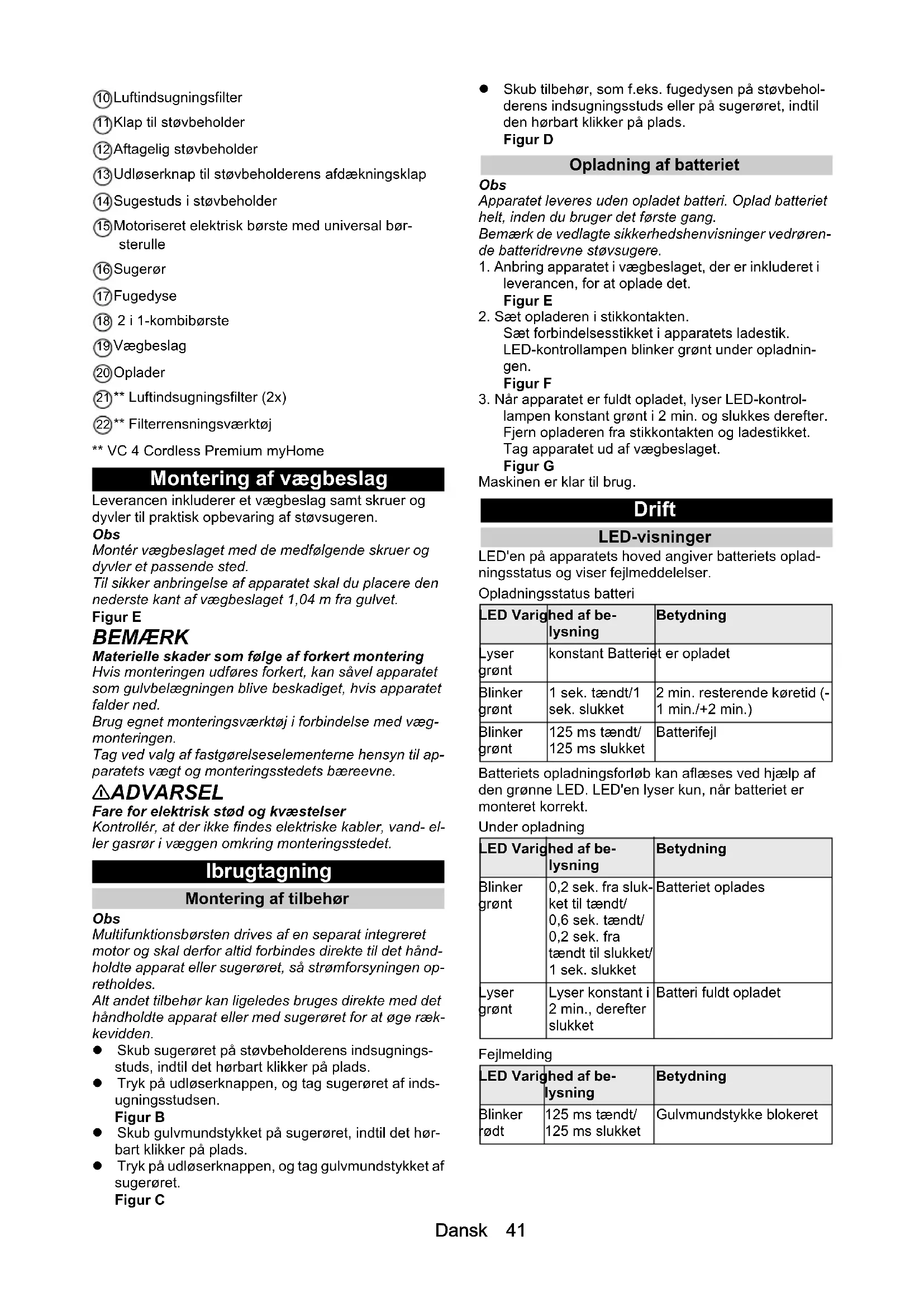 - Tekniske data Dansk 41 10 Luftindsugningsfilter 11 Klap til støvbeholder 12 Aftagelig støvbeholder 13 Udløserknap til støvbeholderens afdækningsklap 14 Sugestuds i støvbeholder 15 Motoriseret elektrisk børste med universal bør- sterulle 16 Sugerør 17 Fugedyse 18 2 i 1-kombibørste 19 Vægbeslag 20 Oplader 21 ** Luftindsugningsfilter (2x) 22 ** Filterrensningsværktøj ** VC 4 Cordless Premium myHome Montering af vægbeslag Leverancen inkluderer et vægbeslag samt skruer og dyvler til praktisk opbevaring af støvsugeren. Obs Montér vægbeslaget med de medfølgende skruer og dyvler et passende sted. Til sikker anbringelse af apparatet skal du placere den nederste kant af vægbeslaget 1,04 m fra gulvet. Figur E BEMÆRK Materielle skader som følge af forkert montering Hvis monteringen udføres forkert, kan såvel apparatet som gulvbelægningen blive beskadiget, hvis apparatet falder ned. Brug egnet monteringsværktøj i forbindelse med væg- monteringen. Tag ved valg af fastgørelseselementerne hensyn til ap- paratets vægt og monteringsstedets bæreevne. 몇 ADVARSEL Fare for elektrisk stød og kvæstelser Kontrollér, at der ikke findes elektriske kabler, vand- el- ler gasrør i væggen omkring monteringsstedet. Ibrugtagning Montering af tilbehør Obs Multifunktionsbørsten drives af en separat integreret motor og skal derfor altid forbindes direkte til det hånd- holdte apparat eller sugerøret, så strømforsyningen op- retholdes. Alt andet tilbehør kan ligeledes bruges direkte med det håndholdte apparat eller med sugerøret for at øge ræk- kevidden. Skub sugerøret på støvbeholderens indsugnings- studs, indtil det hørbart klikker på plads. Tryk på udløserknappen, og tag sugerøret af inds- ugningsstudsen. Figur B Skub gulvmundstykket på sugerøret, indtil det hør- bart klikker på plads. Tryk på udløserknappen, og tag gulvmundstykket af sugerøret. Figur C Skub tilbehør, som f.eks. fugedysen på støvbehol- derens indsugningsstuds eller på sugerøret, indtil den hørbart klikker på plads. Figur D Opladning af batteriet Obs Apparatet leveres uden opladet batteri. Oplad batteriet helt, inden du bruger det første gang. Bemærk de vedlagte sikkerhedshenvisninger vedrøren- de batteridrevne støvsugere. p. 44