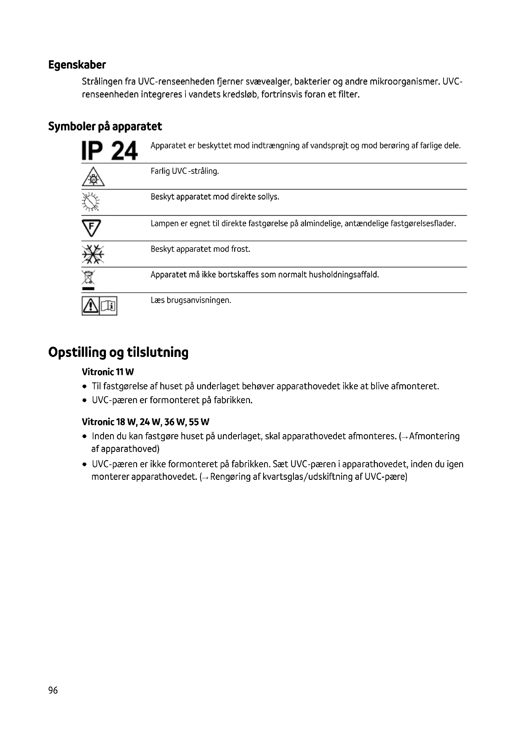 Egenskaber Strålingen fra UVC-renseenheden fjerner svævealger, bakterier og andre mikroorganismer. UVC- renseenheden integreres i vandets kredsløb, fortrinsvis foran et filter. Symboler på apparatet
