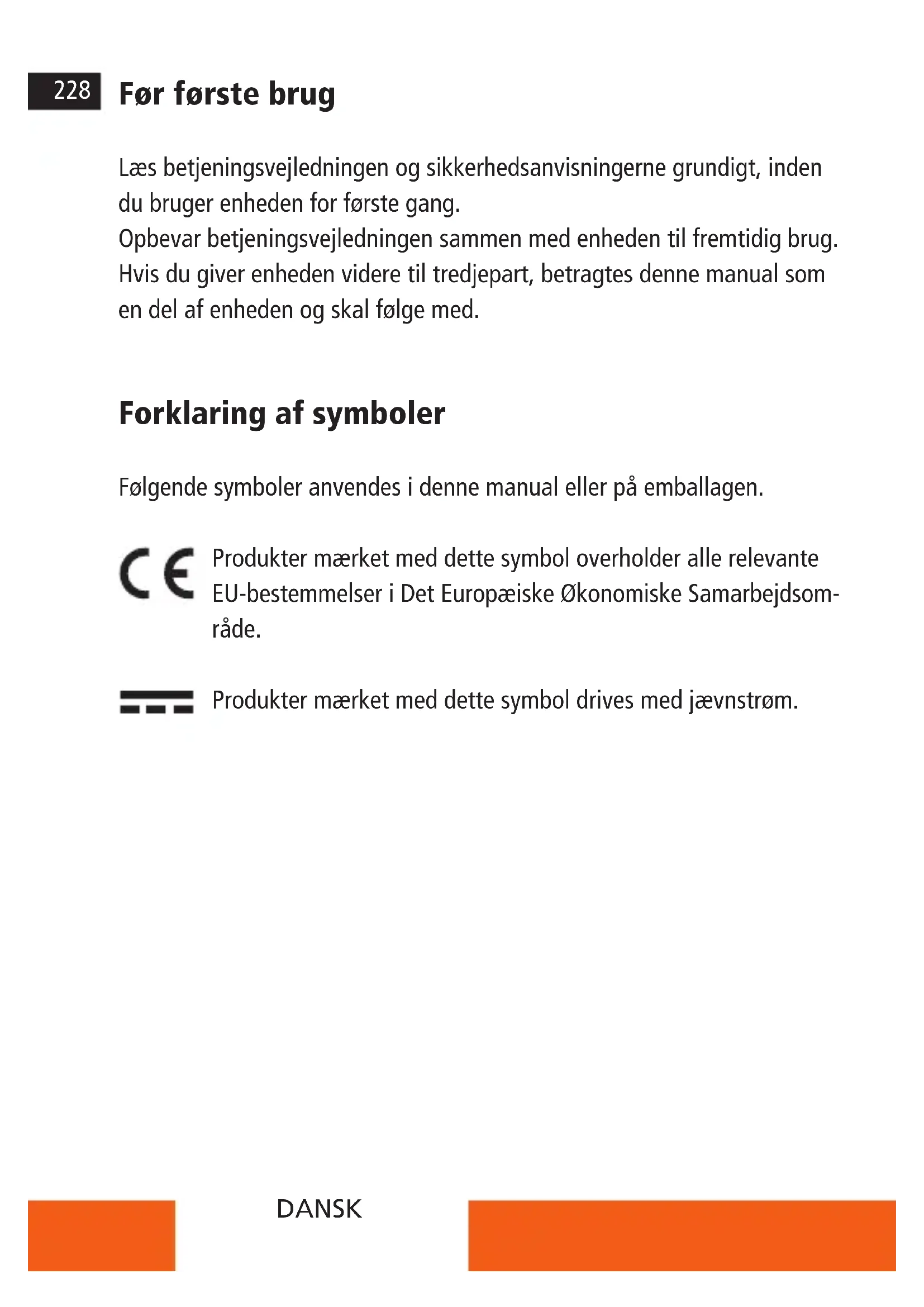 DANSK Brug af batteriet Isætning af batteriet – Sluk kameraet, og åbn dækslet til batterirummet. Isæt batteriet ved at skubbe låsen til siden sammen med batteriet og skub batteriet ind i rummet, indtil det klikker på plads. Sørg for, at batteriets kontakter passer med kontakterne i kameraet. – For at fjerne batteriet skal du skubbe låsen til siden og forsigtigt trække batteriet ud. Opladning af batteriet – Brug det medfølgende USB-C-kabel til at oplade dit kamera enten via en adapter (5,0 V 2,0 A) eller ved at forbinde kameraet direkte til en PC. – Opladeindikatoren lyser rødt, når batteriet oplades. – Opladeindikatoren slukker automatisk, når batteriet er fuldt opladet.235 Første trin Tænd / Sluk Tryk på tænd/sluk-knappen i tre sekunder. Kameraindstillinger Tryk på menuknappen for at åbne kameramenuen: Indstillinger for fototilstand Indstillinger for videotilstand Systemindstillinger Vælg sprog – Tænd kameraet, og tryk på me- nuknappen for at åbne menuen. – Tryk to gange på højre knap for at gå til systemindstillingerne. – Vælg indstillingen „Sprog“, og tryk på OK-knappen for at bekræfte dit valg.236 DANSK Første trin Indstilling af dato og klokkeslæt – Tænd kameraet, og åbn menuen for systemindstillinger ved at trykke på Menu og derefter trykke to gange på højre knap. – Vælg indstillingen „Indstil dato“ for at angive dato og klokkeslæt, og bekræft valget med OK-knappen. – Brug Op / Ned-knapperne til at ændre værdierne, og Venstre eller Højre til at skifte mellem de forskellige felter. Bemærk, at datoen vises i følgende format: År / Måned / Dag. – Tryk på OK, når du har indtastet de korrekte oplysninger. Isætning og formatering af hukommelseskort Til normal brug anbefales et microSD-hukommelseskort med maks. 64 GB og hastighedsklasse U1 eller højere. – Åbn dækslet på venstre side, og skub microSD-kortet ind, indtil du hører et ”klik“. – For at fjerne kortet skal du åbne dækslet og trykke microSD-kortet ind – det springer automatisk ud.237 Første trin Formatering af hukommelseskort Ved første gangs brug af dette digitalkamera er det vigtigt at formatere hukommelseskortet. Alle data – inklusive beskyttede filer – vil blive slettet. Sørg for at gemme vigtige filer på computeren, inden du formaterer. – Tænd kameraet, og åbn menuen for systemindstillinger. – Vælg indstillingen „Formater“ i indstillingsmenuen, og bekræft valget med OK-knappen. Systemindstillinger I systemindstillingerne kan du foretage grundlæggende indstillinger på kameraet. Automatisk slukning – Du kan indstille, efter hvor lang tid kameraet automatisk skal slukke, hvis det ikke bruges. Du kan vælge mellem 3 minutter, 5 minutter, 10 minutter eller Fra.238 DANSK Første trin Sprog – Du kan vælge mellem følgende systemsprog: Engelsk, Tysk, Fransk, Spansk, Italiensk, Hollandsk, Tjekkisk og Slovakisk. – Se afsnittet ”Vælg sprog“ for yderligere information. Frekvens – Du kan indstille frekvensen til 50 Hz eller 60 Hz. Lydindstillinger – Her kan du indstille opstartslyd, udløserlyd og lydstyrke. Indstil dato – Indstil dato og klokkeslæt. Se også afsnittet ”Indstilling af dato og klokkeslæt“ for yderligere information. Formater – Formater det indsatte microSD-kort. – Se også afsnittet ”Formatering af hukommelseskort“ for yderligere information. Advarsel: Ved formatering slettes al information på microSD-kortet. Sørg for, at dataene er gemt et andet sted. Fabriksindstillinger – Nulstil kameraet til fabriksindstillinger. Version – Her kan du se, hvilken firmwareversion der er installeret på kameraet.239 Indstillinger Indstillinger for fototilstande Følgende indstillinger kan foretages for fototilstandene: Opløsning – Indstil billedopløsningen. Du kan vælge mellem: 64 MP* (9200 x 6900), 32 MP* (6480 x 4860), 16 MP* (4608 x 3456) og 8 MP (3264 x 2448). – I serieoptagelsestilstand er opløsningen 8 MP (3264 x 2448). Kvalitet – Du kan vælge mellem Ekstra fin, Fin og Normal. – Denne indstilling er ikke tilgængelig i filtertilstand. AWB – Indstil automatisk hvidbalance. Du kan vælge mellem: Auto, Dagslys, Overskyet, Glødepære, Fluorescerende. – Denne indstilling er ikke tilgængelig i Scene-, Serie-, Filter- og Fuldt automatisk-tilstande. *interpoleret240 DANSK Indstillinger ISO – Indstil ISO-følsomheden til Auto, 100, 200, 400, 800, 1600 eller 3200. – Denne indstilling er ikke tilgængelig i Scene-, Serie-, Filter- og Auto- tilstande. Lysmåling – Vælg lysmåling: Centralt vægtet, Multi eller Spot. – Denne indstilling er ikke tilgængelig i Serie-, Filter- og Fuldt automatisk- tilstande. AE-L & AF-L – Definér funktionen for AE/AF-lås for at undgå gentagen fokusering. Du kan vælge mellem AE-L, AF-L eller AE-L&AF-L. – Denne indstilling er ikke tilgængelig i Scene-, Serie-, Filter- og Auto- tilstande. – AE-L: Eksponeringen fastlåses, når AE/AF-lås-knappen trykkes ned, efter én måling. – AF-L: Fokuseringen fastlåses, når AE/AF-lås-knappen trykkes ned, efter én måling. – AE-L&AF-L: Både eksponering og fokus fastlåses, når AE/AF-lås-knap- pen trykkes ned, efter én måling. Hjælpelinjer – Aktiver hjælpelinjer i visningen for at lette billedkompositionen.241 Indstillinger Billedstabilisering – Aktiver eller deaktiver billedstabilisering for at minimere slør i billeder- ne. Datostempel – Aktiver eller deaktiver datostempel på dine billeder. – Bemærk: Datostemplet kan ikke fjernes fra billedet bagefter. Forhåndsvisning – Det optagede billede vises i 2 eller 5 sekunder. Forhåndsvisning kan også deaktiveres. Farve – I filtertilstand kan du fremhæve farvetoner eller farvelægge dine billeder. Følgende 13 muligheder er tilgængelige: Standard, Fremhæv Rød, Fremhæv Grøn, Fremhæv Blå, Fremhæv Oran- ge, Fremhæv Gul, Fremhæv Lilla, Sepia, Monokrom, Blyant, Levende. – Denne indstilling er kun tilgænge