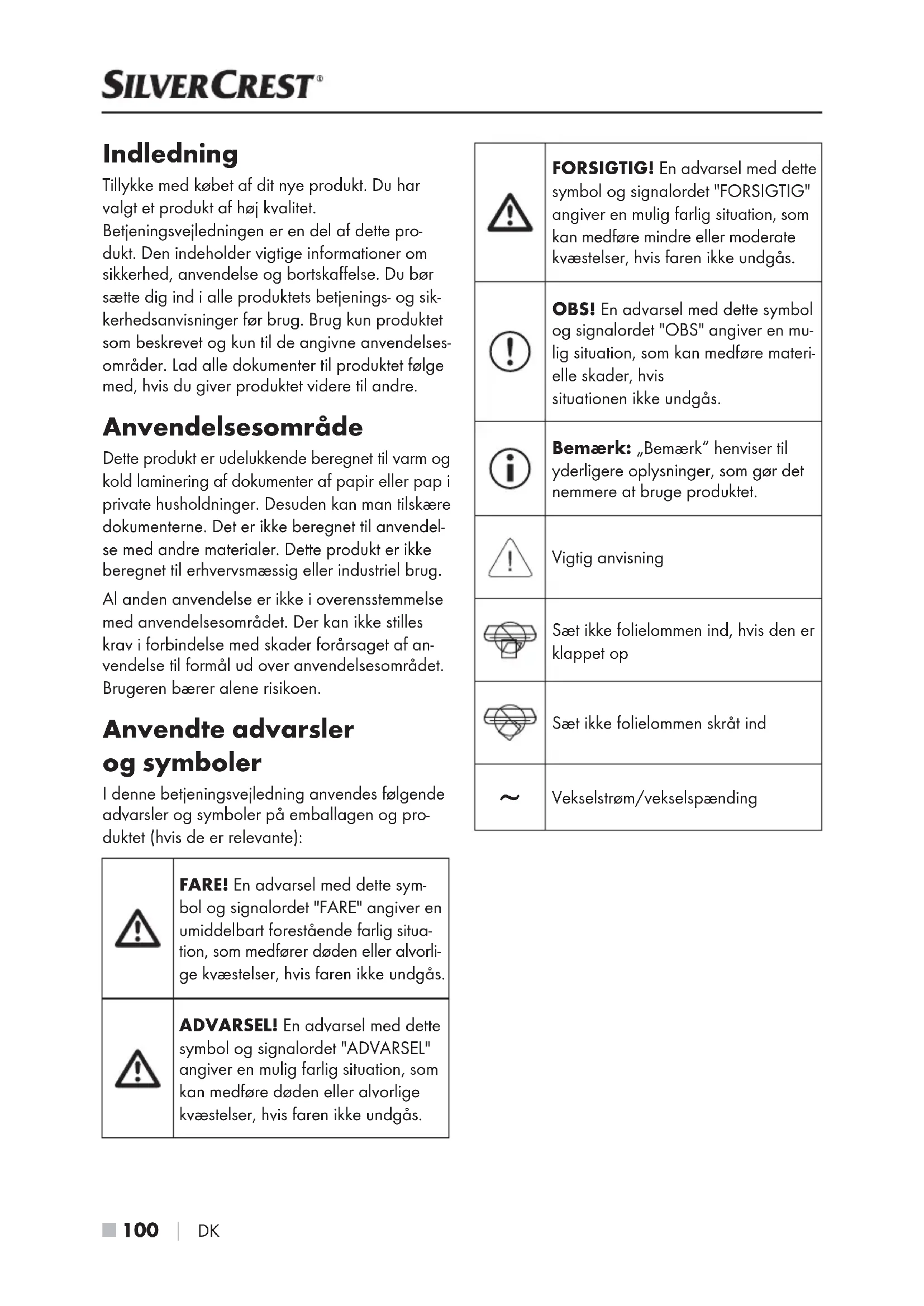 DK Indledning Tillykke med købet af dit nye produkt. Du har valgt et produkt af høj kvalitet. Betjeningsvejledningen er en del af dette pro- dukt. Den indeholder vigtige informationer om sikkerhed, anvendelse og bortskaffelse. Du bør sætte dig ind i alle produktets betjenings- og sik- kerhedsanvisninger før brug. Brug kun produktet som beskrevet og kun til de angivne anvendelses- områder. Lad alle dokumenter til produktet følge med, hvis du giver produktet videre til andre. Anvendelsesområde Dette produkt er udelukkende beregnet til varm og kold laminering af dokumenter af papir eller pap i private husholdninger. Desuden kan man tilskære dokumenterne. Det er ikke beregnet til anvendel- se med andre materialer. Dette produkt er ikke beregnet til erhvervsmæssig eller industriel brug. Al anden anvendelse er ikke i overensstemmelse med anvendelsesområdet. Der kan ikke stilles krav i forbindelse med skader forårsaget af an- vendelse til formål ud over anvendelsesområdet. Brugeren bærer alene risikoen. Anvendte advarsler ogsymboler I denne betjeningsvejledning anvendes følgende advarsler og symboler på emballagen og pro- duktet (hvis de er relevante): FARE! En advarsel med dette sym- bol og signalordet "FARE" angiver en umiddelbart forestående farlig situa- tion, som medfører døden eller alvorli- ge kvæstelser, hvis faren ikke undgås. ADVARSEL! En advarsel med dette symbol og signalordet "ADVARSEL" angiver en mulig farlig situation, som kan medføre døden eller alvorlige kvæstelser, hvis faren ikke undgås. FORSIGTIG! En advarsel med dette symbol og signalordet "FORSIGTIG" angiver en mulig farlig situation, som kan medføre mindre eller moderate kvæstelser, hvis faren ikke undgås. OBS! En advarsel med dette symbol og signalordet "OBS" angiver en mu- lig situation, som kan medføre materi- elle skader, hvis situationen ikke undgås. Bemærk: „Bemærk“ henviser til yderligere oplysninger, som gør det nemmere at bruge produktet. Vigtig anvisning Sæt ikke folielommen ind, hvis den er klappet op Sæt ikke folielommen skråt ind