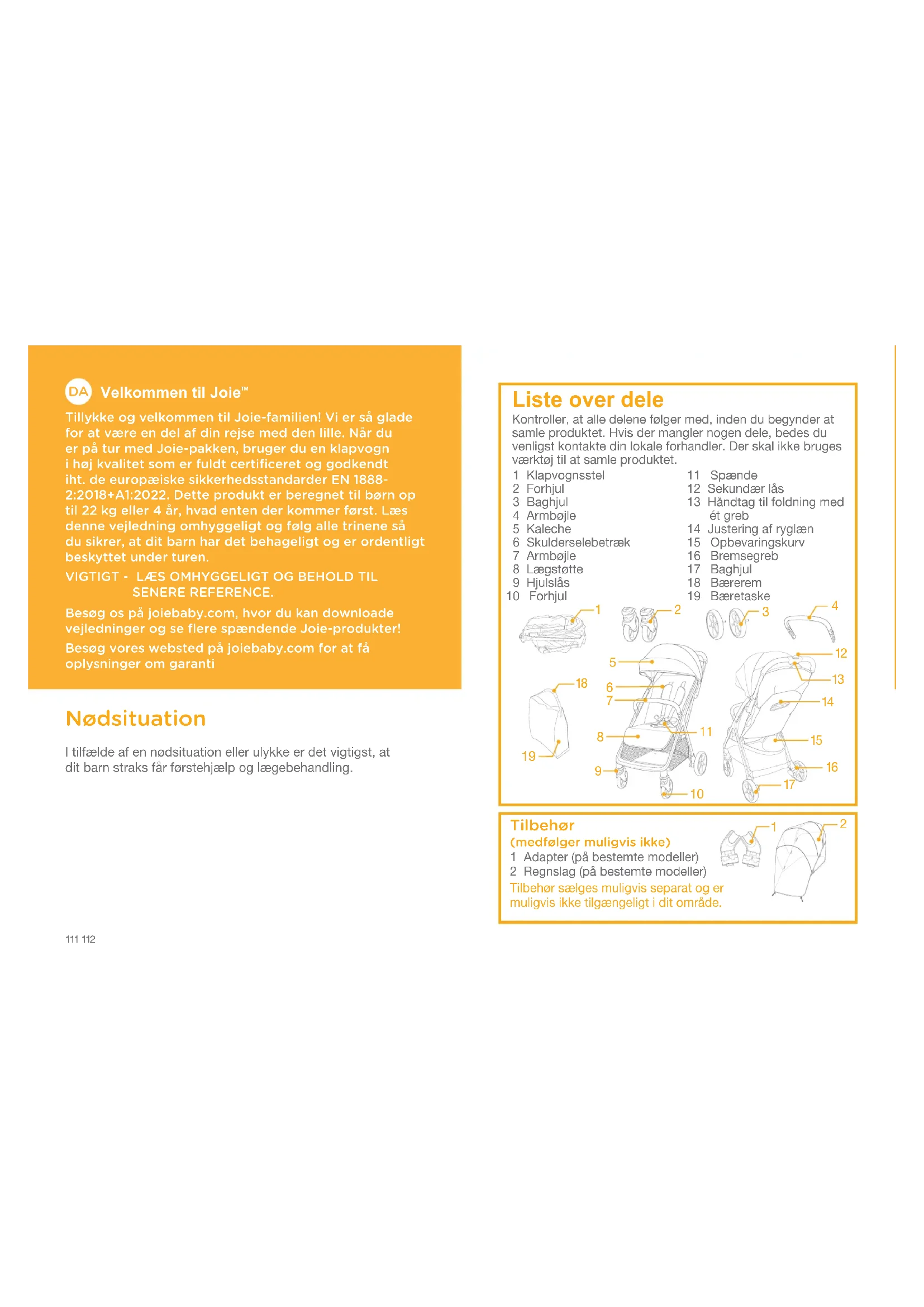 Tillykke og velkommen til Joie-familien! Vi er så glade for at være en del af din rejse med den lille. Når du er på tur med Joie-pakken, bruger du en klapvogn i høj kvalitet som er fuldt certificeret og godkendt iht. de europæiske sikkerhedsstandarder EN 1888-2:2018+A1:2022. Dette produkt er beregnet til børn op til 22 kg eller 4 år, hvad enten der kommer først. Læs denne vejledning omhyggeligt og følg alle trinene så du sikrer, at dit barn har det behageligt og er ordentligt beskyttet under turen.VIGTIGT - LÆS OMHYGGELIGT OG BEHOLD TIL SENERE REFERENCE.Besøg os på joiebaby.com, hvor du kan downloade vejledninger og se flere spændende Joie-produkter!Besøg vores websted på joiebaby.com for at få oplysninger om garanti 1 Klapvognsstel 2 Forhjul 3 Baghjul 4 Armbøjle 5 Kaleche 6 Skulderselebetræk 7 Armbøjle 8 Lægstøtte 9 Hjulslås10 Forhjul11 Spænde12 Sekundær lås13 Håndtag til foldning med ét greb14 Justering af ryglæn15 Opbevaringskurv16 Bremsegreb17 Baghjul18 Bærerem19 Bæretaske Tilbehør (medfølger muligvis ikke)1 Adapter (på bestemte modeller)2 Regnslag (på bestemte modeller)Tilbehør sælges muligvis separat og er muligvis ikke tilgængeligt i dit område. Liste over dele Kontroller, at alle delene følger med, inden du begynder at samle produktet. Hvis der mangler nogen dele, bedes du venligst kontakte din lokale forhandler. Der skal ikke bruges værktøj til at samle produktet.