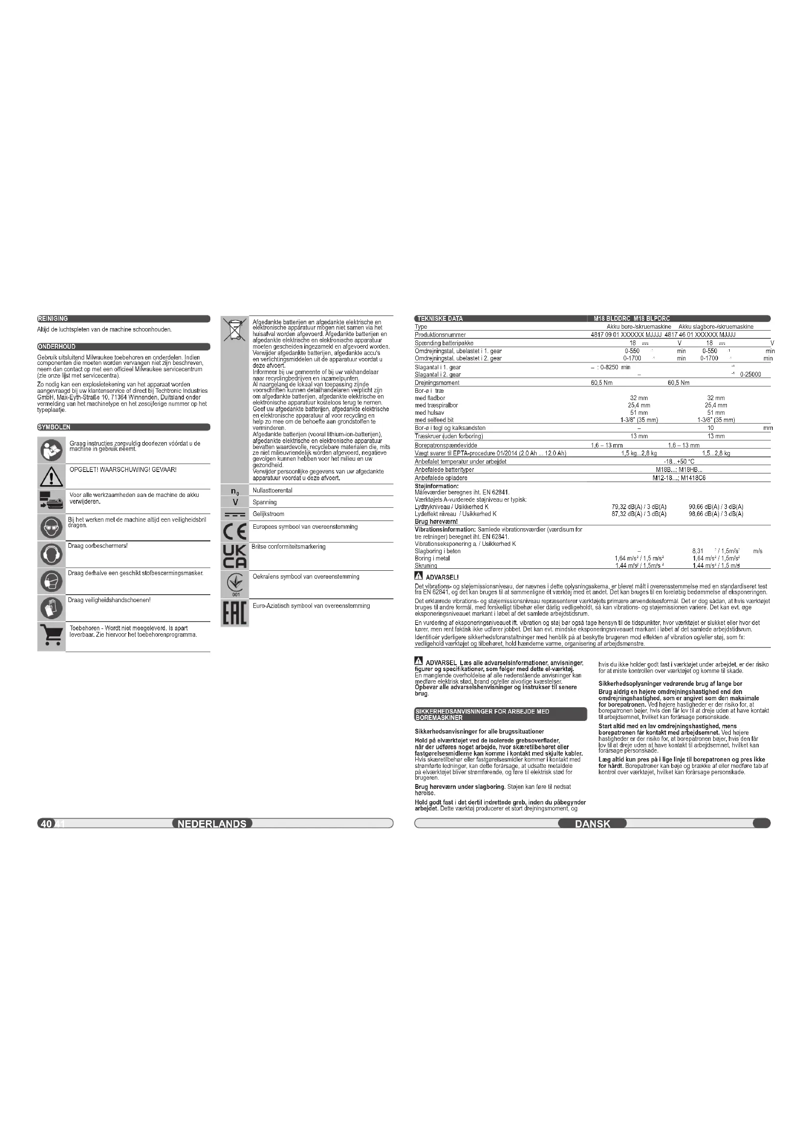 BOREMASKINER Sikkerhedsanvisninger for alle brugssituationer Hold på elværktøjet ved de isolerede grebsoverfl ader, når der udføres noget arbejde, hvor skæretilbehøret eller fastgørelsesmidlerne kan komme i kontakt med skjulte kabler. Hvis skæretilbehør eller fastgørelsesmidler kommer i kontakt med strømførte ledninger, kan dette forårsage, at udsatte metaldele på elværktøjet bliver strømførende, og føre til elektrisk stød for brugeren. Brug høreværn under slagboring. Støjen kan føre til nedsat hørelse. Hold godt fast i det dertil indrettede greb, inden du påbegynder arbejdet. Dette værktøj producerer et stort drejningsmoment, og hvis du ikke holder godt fast i værktøjet under arbejdet, er der risiko for at miste kontrollen over værktøjet og komme til skade. Sikkerhedsoplysninger vedrørende brug af lange bor Brug aldrig en højere omdrejningshastighed end den omdrejningshastighed, som er angivet som den maksimale for borepatronen. Ved højere hastigheder er der risiko for, at borepatronen bøjer, hvis den får lov til at dreje uden at have kontakt til arbejdsemnet, hvilket kan forårsage personskade. Start altid med en lav omdrejningshastighed, mens borepatronen får kontakt med arbejdsemnet. Ved højere hastigheder er der risiko for, at borepatronen bøjer, hvis den får lov til at dreje uden at have kontakt til arbejdsemnet, hvilket kan forårsage personskade. Læg altid kun pres på i lige linje til borepatronen og pres ikke for hårdt. Borepatroner kan bøje og brække af eller medføre tab af kontrol over værktøjet, hvilket kan forårsage personskade. ADVARSEL! Det vibrations- og støjemissionsniveau, der nævnes i dette oplysningsskema, er blevet målt i overensstemmelse med en standardiseret test fra EN 62841, og det kan bruges til at sammenligne ét værktøj med et andet. Det kan bruges til en foreløbig bedømmelse af eksponeringen. Det erklærede vibrations- og støjemissionsniveau repræsenterer værktøjets primære anvendelsesformål. Det er dog sådan, at hvis værktøjet bruges til andre formål, med forskelligt tilbehør eller dårlig vedligeholdt, så kan vibrations- og støjemissionen variere. Det kan evt. øge eksponeringsniveauet markant i løbet af det samlede arbejdstidsrum. En vurdering af eksponeringsniveauet ift. vibration og støj bør også tage hensyn til de tidspunkter, hvor værktøjet er slukket eller hvor det kører, men rent faktisk ikke udfører jobbet. Det kan evt. mindske eksponeringsniveauet markant i løbet af det samlede arbejdstidsrum. Identifi cér yderligere sikkerhedsforanstaltninger med henblik på at beskytte brugeren mod eff ekten af vibration og/eller støj, som fx: vedligehold værktøjet og tilbehøret, hold hænderne varme, organisering af arbejdsmønstre. REINIGING Altijd de luchtspleten van de machine schoonhouden. ONDERHOUD Gebruik uitsluitend Milwaukee toebehoren en onderdelen. Indien componenten die moeten worden vervangen niet zijn beschreven, neem dan contact op met een offi cieel Milwaukee servicecentrum (zie onze lijst met servicecentra). Zo nodig kan een explosietekening van het apparaat worden aangevraagd bij uw klantenservice of direct bij Techtronic Industries GmbH, Max-Eyth-Straße 10, 71364 Winnenden, Duitsland onder vermelding van het machinetype en het zescijferige nummer op het typeplaatje. SYMBOLEN Graag instructies zorgvuldig doorlezen vóórdat u de machine in gebruik neemt. OPGELET! WAARSCHUWING! GEVAAR! Voor alle werkzaamheden aan de machine de akku verwijderen. Bij het werken met de machine altijd een veiligheidsbril dragen. Draag oorbeschermers! Draag derhalve een geschikt stofbescermingsmasker. Draag veiligheidshandschoenen! Toebehoren - Wordt niet meegeleverd. Is apart leverbaar. Zie hiervoor het toebehorenprogramma. Afgedankte batterijen en afgedankte elektrische en elektronische apparatuur mogen niet samen via het huisafval worden afgevoerd. Afgedankte batterijen en afgedankte elektrische en elektronische apparatuur moeten gescheiden ingezameld en afgevoerd worden. Verwijder afgedankte batterijen, afgedankte accu‘s en verlichtingsmiddelen uit de apparatuur voordat u deze afvoert. Informeer bij uw gemeente of bij uw vakhandelaar naar recyclingbedrijven en inzamelpunten. Al naargelang de lokaal van toepassing zijnde voorschriften kunnen detailhandelaren verplicht zijn om afgedankte batterijen, afgedankte elektrische en elektronische apparatuur kosteloos terug te nemen. Geef uw afgedankte batterijen, afgedankte elektrische en elektronische apparatuur af voor recycling en help zo mee om de behoefte aan grondstoff en te verminderen. Afgedankte batterijen (vooral lithium-ion-batterijen), afgedankte elektrische en elektronische apparatuur bevatten waardevolle, recyclebare materialen die, mits ze niet milieuvriendelijk worden afgevoerd, negatieve gevolgen kunnen hebben voor het milieu en uw gezondheid. Verwijder persoonlijke gegevens van uw afgedankte apparatuur voordat u deze afvoert.