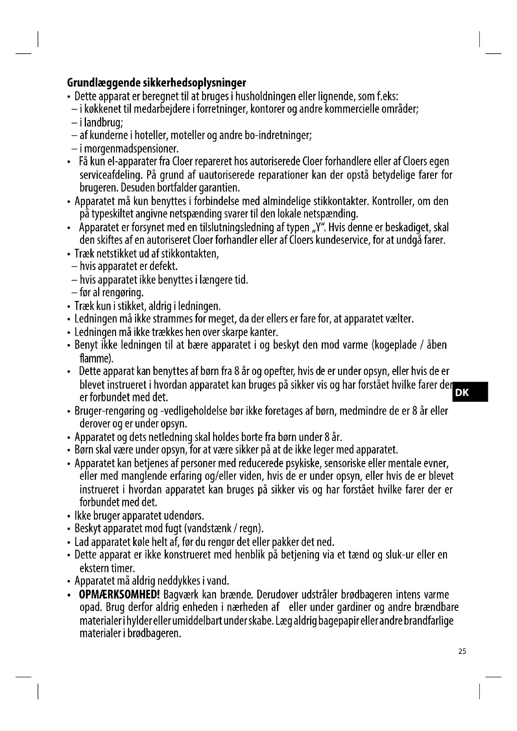 - OPMÆRKSOMHED! Bagværk kan brænde. Derudover udstråler brødbageren intens varme opad. Brug derfor aldrig enheden i nærheden af eller under gardiner og andre brændbare materialer i hylder eller umiddelbart under skabe. Læg aldrig bagepapir eller andre brandfarlige materialer i brødbageren.26