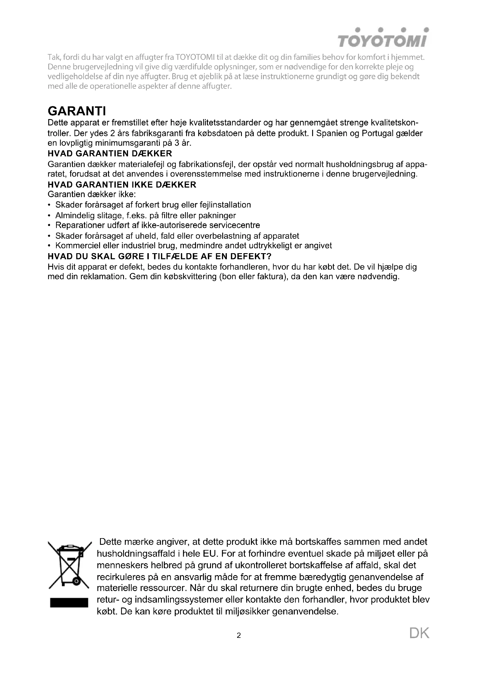 Tak, fordi du har valgt en augter fra TOYOTOMI til at dække dit og din families behov for komfort i hjemmet. Denne brugervejledning vil give dig værdifulde oplysninger, som er nødvendige for den korrekte pleje og vedligeholdelse af din nye augter. Brug et øjeblik på at læse instruktionerne grundigt og gøre dig bekendt med alle de operationelle aspekter af denne augter. GARANTI Dette apparat er fremstillet efter høje kvalitetsstandarder og har gennemgået strenge kvalitetskon-troller. Der ydes 2 års fabriksgaranti fra købsdatoen på dette produkt. I Spanien og Portugal gælder en lovpligtig minimumsgaranti på 3 år.HVAD GARANTIEN DÆKKERGarantien dækker materialefejl og fabrikationsfejl, der opstår ved normalt husholdningsbrug af appa-ratet, forudsat at det anvendes i overensstemmelse med instruktionerne i denne brugervejledning.HVAD GARANTIEN IKKE DÆKKERGarantien dækker ikke:• Skader forårsaget af forkert brug eller fejlinstallation• Almindelig slitage, f.eks. på filtre eller pakninger• Reparationer udført af ikke-autoriserede servicecentre• Skader forårsaget af uheld, fald eller overbelastning af apparatet• Kommerciel eller industriel brug, medmindre andet udtrykkeligt er angivetHVAD DU SKAL GØRE I TILFÆLDE AF EN DEFEKT?Hvis dit apparat er defekt, bedes du kontakte forhandleren, hvor du har købt det. De vil hjælpe dig med din reklamation. Gem din købskvittering (bon eller faktura), da den kan være nødvendig.