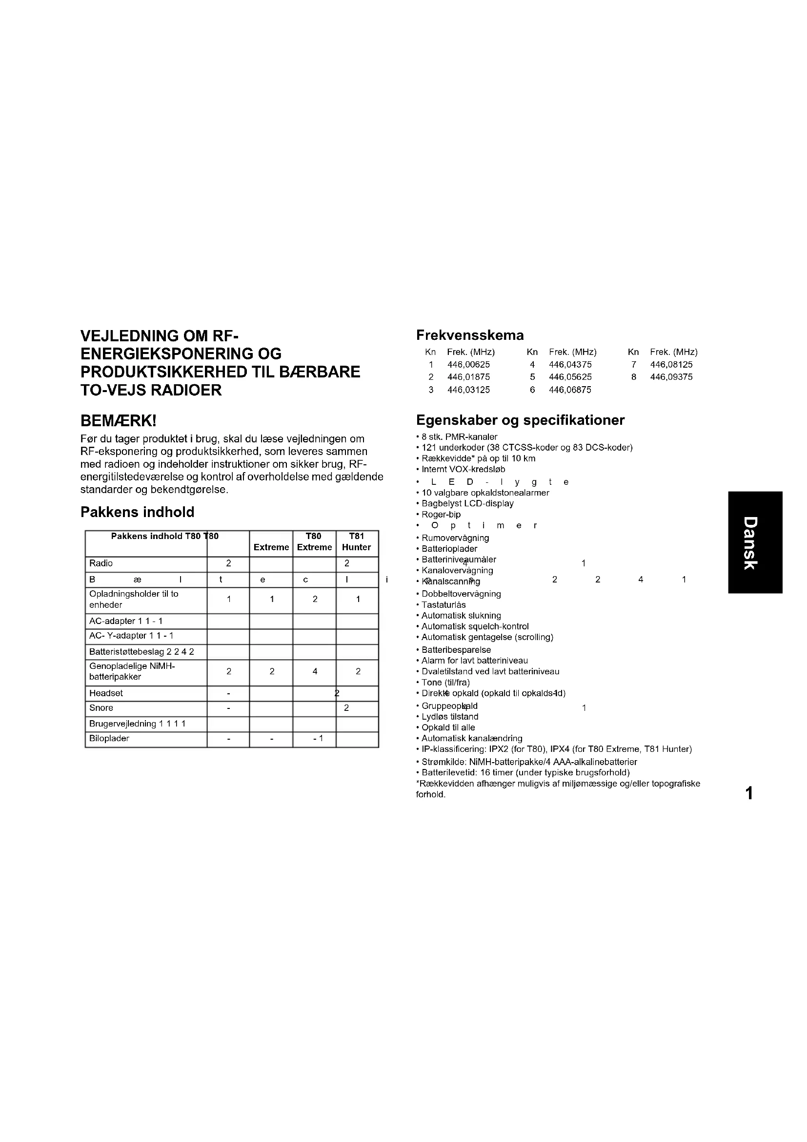 TO-VEJS RADIOER BEMÆRK! Før du tager produktet i brug, skal du læse vejledningen om RF-eksponering og produktsikkerhed, som leveres sammen med radioen og indeholder instruktioner om sikker brug, RF- energitilstedeværelse og kontrol af overholdelse med gældende standarder og bekendtgørelse. Pakkens indhold Frekvensskema Egenskaber og specifikationer