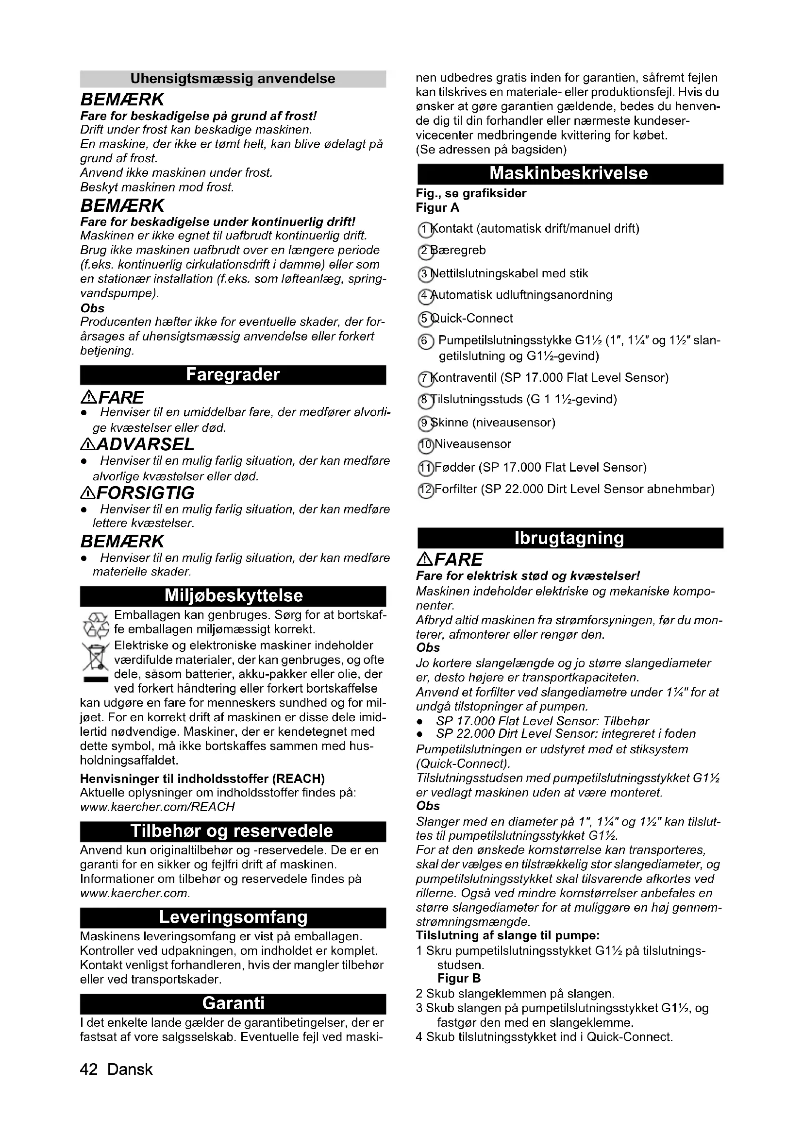 Pleje og vedligeholdelse FARE Fare for elektrisk stød og kvæstelser! Maskinen indeholder elektriske og mekaniske kompo- nenter. Rengøring og brugervedligeholdelse må ikke udføres af børn. Skylning og rengøring BEMÆRK Fare for beskadigelse! Fare for beskadigelse på grund af indtørrede tilsmuds- ninger eller tilsætningsstoffer. Skyl og rengør maskinen umiddelbart efter hver brug. 1 Hvis der er blevet transporteret væske, der er tils- mudset eller tilsat tilsætningsstoffer, skal maskinen derefter skylles: Pumpe ferskvand uden tilsætnings- stoffer med maskinen, indtil alle tilsmudsninger eller tilsætningsstoffer er skyllet ud af maskinen. FARE Fare for elektrisk stød og kvæstelser! Maskinen indeholder elektriske og mekaniske kompo- nenter. Afbryd altid maskinen fra strømforsyningen, før du mon- terer, afmonterer eller rengør den. 2 Træk netstikket ud af stikkontakten. 3 Tryk på knappen for Quick-Connect, og træk tilslut- ningsstudsen af. Figur C 4 Fjern eventuelle rester fra slangen på Quick-Conne- ct. 5 Rengør maskinen udvendigt med en blød, ren klud og rent ferskvand. 6 Tøm maskinen og tilbehøret, og lad dem tørre. Vedligeholdelse Maskinen er vedligeholdelsesfrit. Transport Manuel transport 몇 FORSIGTIG Fare for kvæstelser, fordi man snubler! Ved løse kabler og slanger er der fare for kvæstelser, fordi man snubler! Vær opmærksom på kabler og slanger, når du flytter maskinen.