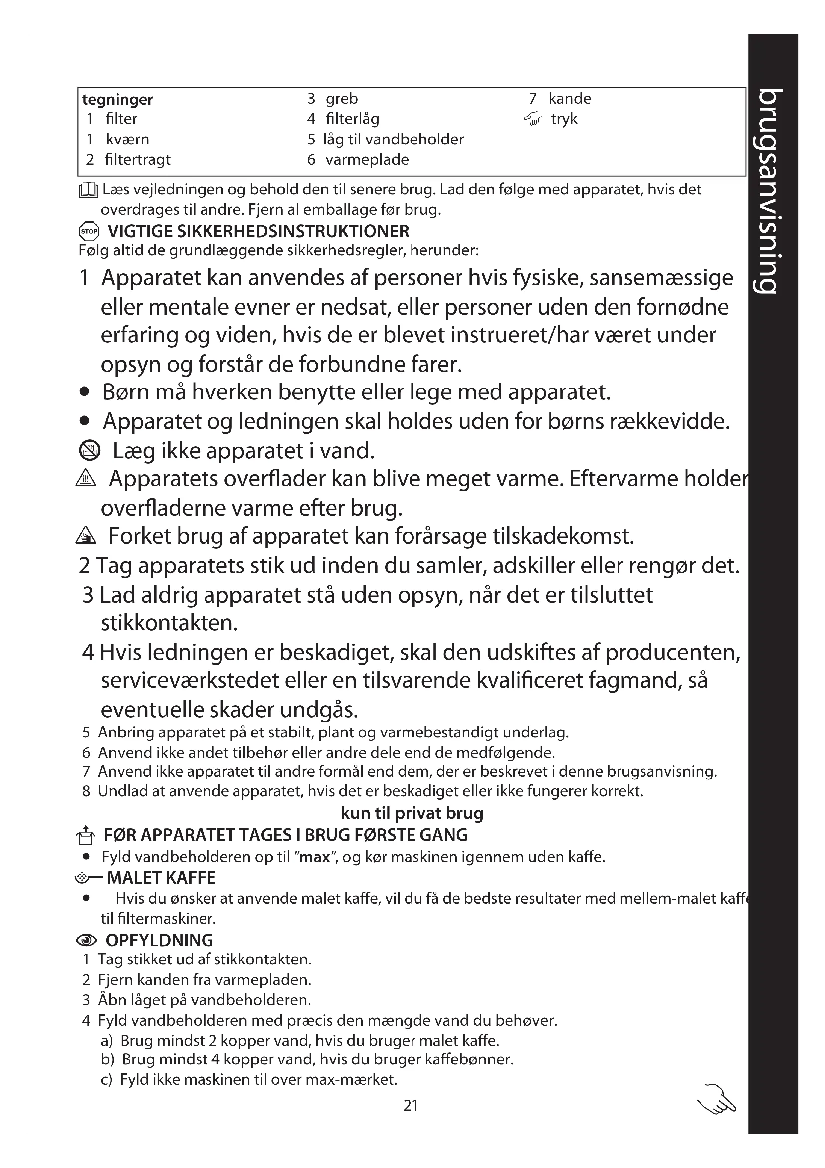 - Hvis du ønsker at anvende malet kaffe, vil du få de bedste resultater med mellem-malet kaffe til filtermaskiner. C OPFYLDNING 1 Tag stikket ud af stikkontakten. 2 Fjern kanden fra varmepladen. 3 Åbn låget på vandbeholderen. 4 Fyld vandbeholderen med præcis den mængde vand du behøver. a) Brug mindst 2 kopper vand, hvis du bruger malet kaffe. b) Brug mindst 4 kopper vand, hvis du bruger kaffebønner. c) Fyld ikke maskinen til over max-mærket. brugsanvisning tegninger 1 filter 1 kværn 2 filtertragt 3 greb 4 filterlåg 5 låg til vandbeholder 6 varmeplade 7 kande | tryk22 5 Luk vandbeholderens låg. 6 Pres grebet ind i kanten af filterlåget og åbn det helt op. 7 Kom den nøjagtigt afmålte mængde kaffe i filtret. a) Brug 1 strøget spiseskefuld malet kaffe for hver kop. b) Brug 1 toppet spiseskefuld hele kaffebønner for hver kop. c) Antallet af spiseskefulde kaffe skal svare til antallet af kopper vand. 8 Luk filterlåget, og tryk det ned, for at grebet får fat.