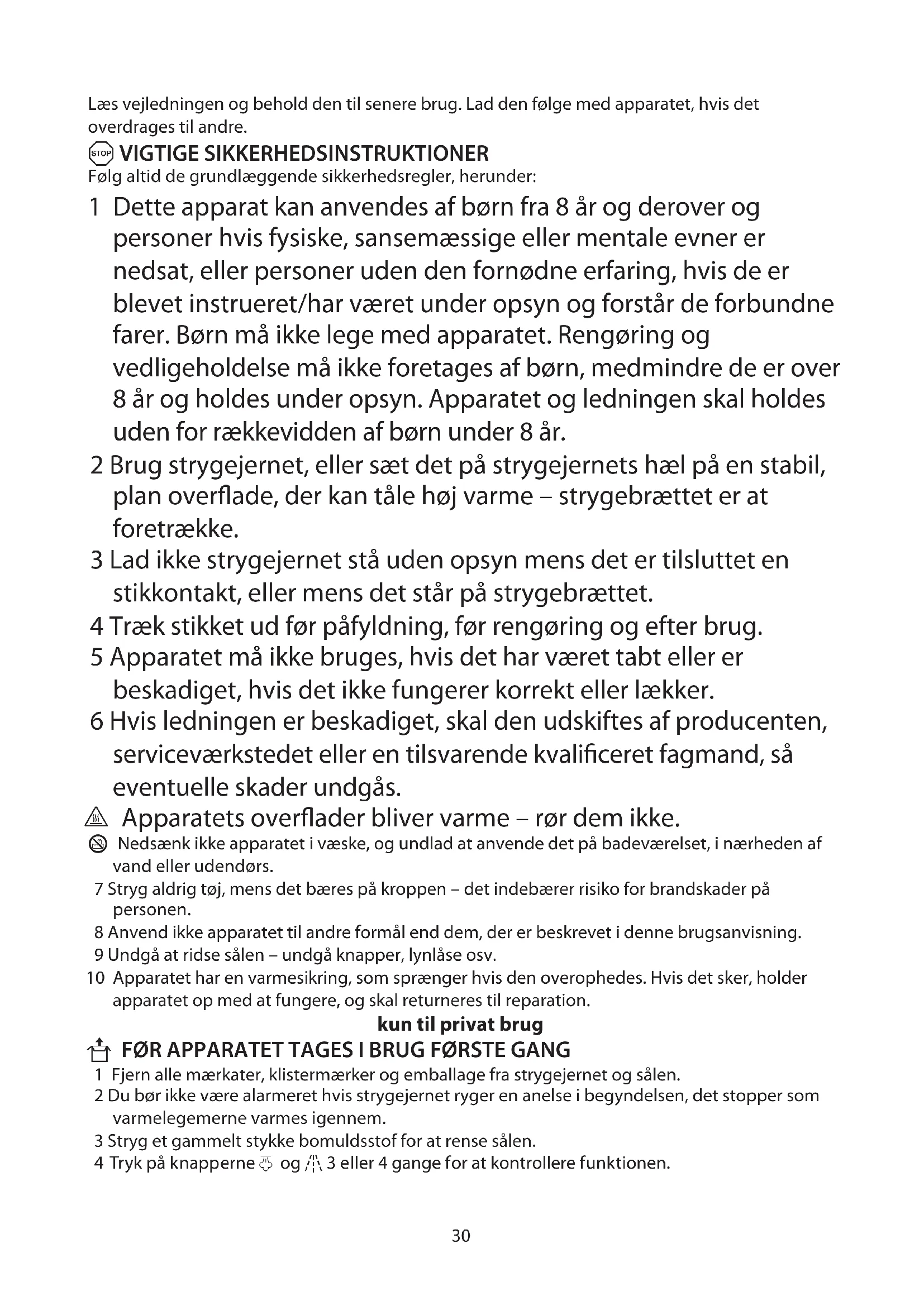 Følg altid de grundlæggende sikkerhedsregler, herunder: 1 Dette apparat kan anvendes af børn fra 8 år og derover og personer hvis fysiske, sansemæssige eller mentale evner er nedsat, eller personer uden den fornødne erfaring, hvis de er blevet instrueret/har været under opsyn og forstår de forbundne farer. Børn må ikke lege med apparatet. Rengøring og vedligeholdelse må ikke foretages af børn, medmindre de er over 8 år og holdes under opsyn. Apparatet og ledningen skal holdes uden for rækkevidden af børn under 8 år. 2 Brug strygejernet, eller sæt det på strygejernets hæl på en stabil, plan overflade, der kan tåle høj varme – strygebrættet er at foretrække. 3 Lad ikke strygejernet stå uden opsyn mens det er tilsluttet en stikkontakt, eller mens det står på strygebrættet. 4 Træk stikket ud før påfyldning, før rengøring og efter brug. 5 Apparatet må ikke bruges, hvis det har været tabt eller er beskadiget, hvis det ikke fungerer korrekt eller lækker. 6 Hvis ledningen er beskadiget, skal den udskiftes af producenten, serviceværkstedet eller en tilsvarende kvalificeret fagmand, så eventuelle skader undgås. ¬ Apparatets overflader bliver varme – rør dem ikke. H Nedsænk ikke apparatet i væske, og undlad at anvende det på badeværelset, i nærheden af vand eller udendørs. 7 Stryg aldrig tøj, mens det bæres på kroppen – det indebærer risiko for brandskader på personen. 8 Anvend ikke apparatet til andre formål end dem, der er beskrevet i denne brugsanvisning. 9 Undgå at ridse sålen – undgå knapper, lynlåse osv. 10 Apparatet har en varmesikring, som sprænger hvis den overophedes. Hvis det sker, holder apparatet op med at fungere, og skal returneres til reparation. kun til privat brug U FØR APPARATET TAGES I BRUG FØRSTE GANG 1 Fjern alle mærkater, klistermærker og emballage fra strygejernet og sålen. 2 Du bør ikke være alarmeret hvis strygejernet ryger en anelse i begyndelsen, det stopper som varmelegemerne varmes igennem. 3 Stryg et gammelt stykke bomuldsstof for at rense sålen. 4 Tryk på knapperne S og * 3 eller 4 gange for at kontrollere funktionen.31 brugsanvisning C FORBEREDELSE 5 Tjek tøjet for strygesymboler (i j k l). 6 Stryg først materialer der kræver lave temperaturer j, derefter de som kræver medium temperaturer k, og slut af med de der kræver høje temperaturer l.