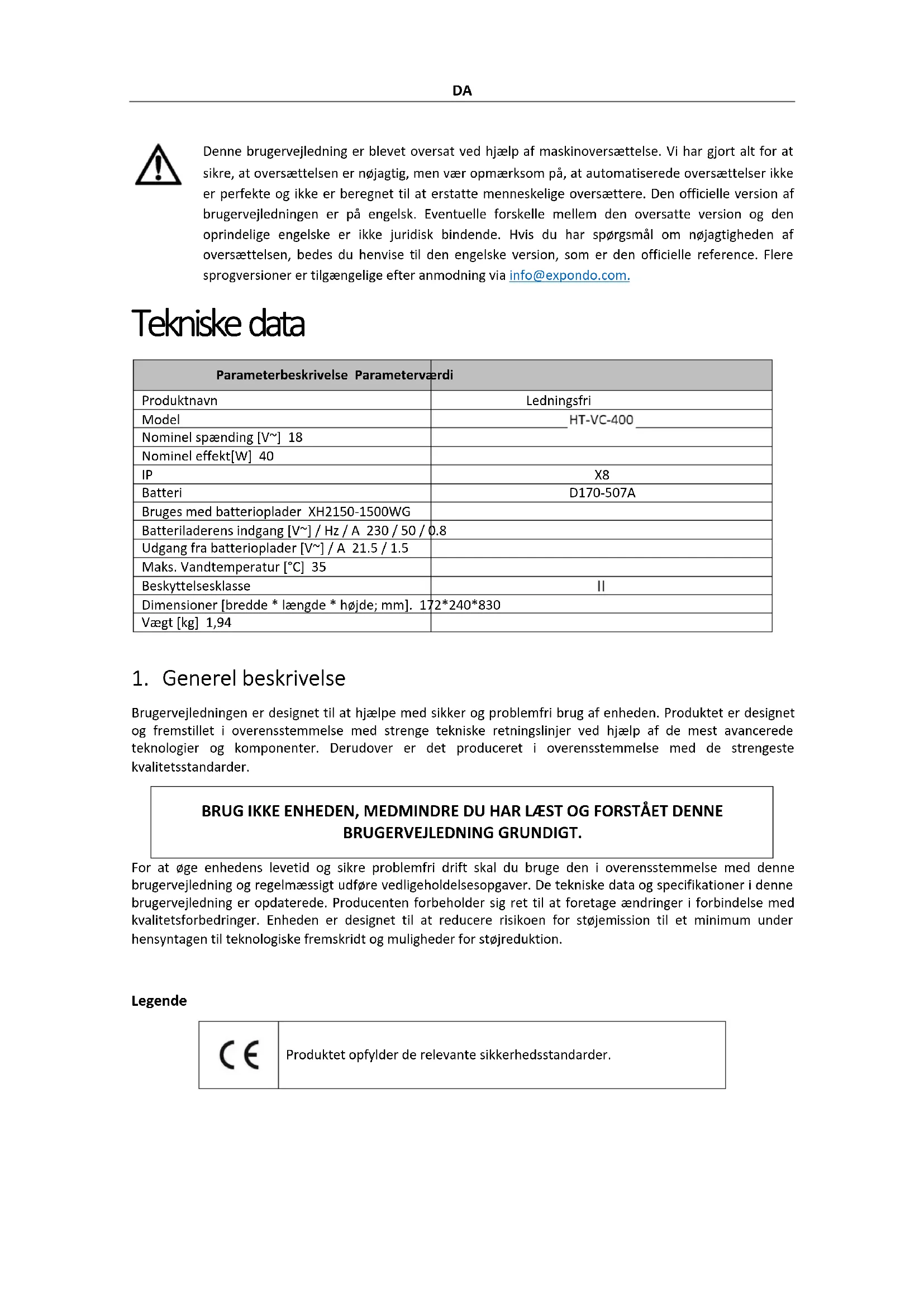 produktet. Bortskaffelse af brugte enheder Bortskaf ikke denne enhed i det kommunale affaldssystem. Aflever den på et genbrugs- og indsamlingssted for elektriske apparater. Tjek symbolet på produktet, brugsanvisningen og emballagen. Den plast, der bruges til at konstruere enheden, kan genbruges efter deres mærkning. Ved at vælge at genbruge yder du et væsentligt bidrag til beskyttelsen af vores miljø. Kontakt de lokale myndigheder for at få oplysninger om din lokale genbrugsstation. 2.5. Problemløsning I de fleste tilfælde vil du nemt kunne løse problemerne selv. Problem Mulig årsag Løsning Undlader at rengøre affaldet. Batteriet løber tør. Genoplad produktet, og det kan fungere i 50-60 minutter, når det er fuldt opladet. Pumpehjulet er Reparer eller udskift pumpehjulet.DA beskadiget. Pumpehjulet er blokeret. Sluk for produktet, og kontroller pumpehjulet. Filterposen er fuld. Rens affaldet i filterposen. Affald kommer ud fra de forreste dele. Kontrollér, om ventilen er beskadiget. Skift kontraventilen. Affald slipper ud af filternettet. Filternettet er beskadiget. Skift filternet. Håndtaget/forlængerstangen kan ikke forbindes. Den forbindende V-Cord er beskadiget. Skift V-ledningen. Produktet kan ikke oplades. Batteriet er beskadiget. Kontakt forhandleren for at få udskiftet batteriet. Advarsel! For at undgå at beskadige rengøringsmidlet skal du købe det originale litiumbatteri som erstatning. Opladeren er beskadiget. Udskift opladeren. Advarsel! For at undgå at beskadige produktet på grund af opladeren, skal du købe den originale oplader som erstatning.FI Tämä käyttöopas on käännetty konekäännöksellä. Olemme tehneet kaikkemme varmistaaksemme käännöksen tarkkuuden, mutta huomaa, että automaattiset käännökset eivät ole täydellisiä eivätkä ne ole tarkoitettu korvaamaan ihmiskääntäjiä. Käyttöoppaan virallinen versio on englanninkielinen. Erot käännetyn version ja alkuperäisen englanninkielisen version välillä eivät ole oikeudellisesti sitovia. Jos sinulla on kysyttävää käännöksen tarkkuudesta, katso englanninkielinen versio, joka on virallinen viite. Lisää kieliversioita on saatavilla pyynnöstä osoitteesta info@expondo.com . Tekniset tiedot Parametrin kuvaus Parametrin arvo Tuotteen nimi Langaton allaspölynimuri Malli Nimellisjännite [V~] 18 Nimellisteho [W] 40 IP X8 Akku D170-507A Käytetty akkulaturin kanssa XH2150-1500WG Akkulaturin tulo [V~] / Hz / A 230 / 50 / 0.8 Akkulaturin ulostulo [V~] / A 21.5 / 1.5 Maks. Veden lämpötila [°C] 35 Suojausluokka Mitat [leveys * pituus * korkeus; mm] 172*240*830 Paino [kg] 1,94