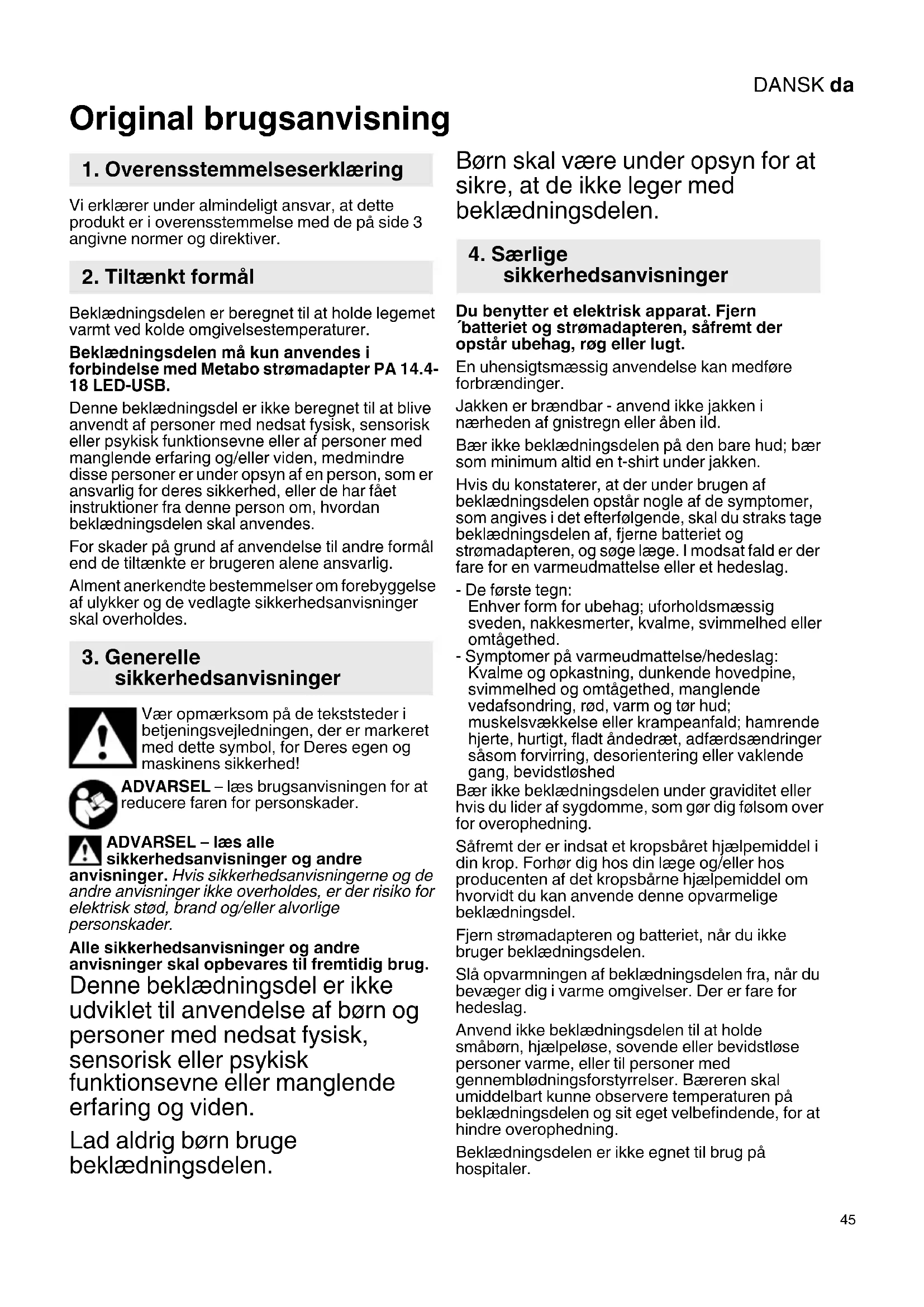Original brugsanvisning Vi erklærer under almindeligt ansvar, at dette produkt er i overensstemmelse med de på side 3 angivne normer og direktiver. Beklædningsdelen er beregnet til at holde legemet varmt ved kolde omgivelsestemperaturer. Beklædningsdelen må kun anvendes i forbindelse med Metabo strømadapter PA 14.4- 18 LED-USB. Denne beklædningsdel er ikke beregnet til at blive anvendt af personer med nedsat fysisk, sensorisk eller psykisk funktionsevne eller af personer med manglende erfaring og/eller viden, medmindre disse personer er under opsyn af en person, som er ansvarlig for deres sikkerhed, eller de har fået instruktioner fra denne person om, hvordan beklædningsdelen skal anvendes. For skader på grund af anvendelse til andre formål end de tiltænkte er brugeren alene ansvarlig. Alment anerkendte bestemmelser om forebyggelse af ulykker og de vedlagte sikkerhedsanvisninger skal overholdes. Vær opmærksom på de tekststeder i betjeningsvejledningen, der er markeret med dette symbol, for Deres egen og maskinens sikkerhed! ADVARSEL – læs brugsanvisningen for at reducere faren for personskader. ADVARSEL – læs alle sikkerhedsanvisninger og andre anvisninger. Hvis sikkerhedsanvisningerne og de andre anvisninger ikke overholdes, er der risiko for elektrisk stød, brand og/eller alvorlige personskader. Alle sikkerhedsanvisninger og andre anvisninger skal opbevares til fremtidig brug. Denne beklædningsdel er ikke udviklet til anvendelse af børn og personer med nedsat fysisk, sensorisk eller psykisk funktionsevne eller manglende erfaring og viden. Lad aldrig børn bruge beklædningsdelen. Børn skal være under opsyn for at sikre, at de ikke leger med beklædningsdelen. Du benytter et elektrisk apparat. Fjern ´batteriet og strømadapteren, såfremt der opstår ubehag, røg eller lugt. En uhensigtsmæssig anvendelse kan medføre forbrændinger. Jakken er brændbar - anvend ikke jakken i nærheden af gnistregn eller åben ild. Bær ikke beklædningsdelen på den bare hud; bær som minimum altid en t-shirt under jakken. Hvis du konstaterer, at der under brugen af beklædningsdelen opstår nogle af de symptomer, som angives i det efterfølgende, skal du straks tage beklædningsdelen af, fjerne batteriet og strømadapteren, og søge læge. I modsat fald er der fare for en varmeudmattelse eller et hedeslag. - De første tegn: Enhver form for ubehag; uforholdsmæssig sveden, nakkesmerter, kvalme, svimmelhed eller omtågethed. - Symptomer på varmeudmattelse/hedeslag: Kvalme og opkastning, dunkende hovedpine, svimmelhed og omtågethed, manglende vedafsondring, rød, varm og tør hud; muskelsvækkelse eller krampeanfald; hamrende hjerte, hurtigt, fladt åndedræt, adfærdsændringer såsom forvirring, desorientering eller vaklende gang, bevidstløshed Bær ikke beklædningsdelen under graviditet eller hvis du lider af sygdomme, som gør dig følsom over for overophedning. Såfremt der er indsat et kropsbåret hjælpemiddel i din krop. Forhør dig hos din læge og/eller hos producenten af det kropsbårne hjælpemiddel om hvorvidt du kan anvende denne opvarmelige beklædningsdel. Fjern strømadapteren og batteriet, når du ikke bruger beklædningsdelen. Slå opvarmningen af beklædningsdelen fra, når du bevæger dig i varme omgivelser. Der er fare for hedeslag. Anvend ikke beklædningsdelen til at holde småbørn, hjælpeløse, sovende eller bevidstløse personer varme, eller til personer med gennemblødningsforstyrrelser. Bæreren skal umiddelbart kunne observere temperaturen på beklædningsdelen og sit eget velbefindende, for at hindre overophedning. Beklædningsdelen er ikke egnet til brug på hospitaler.