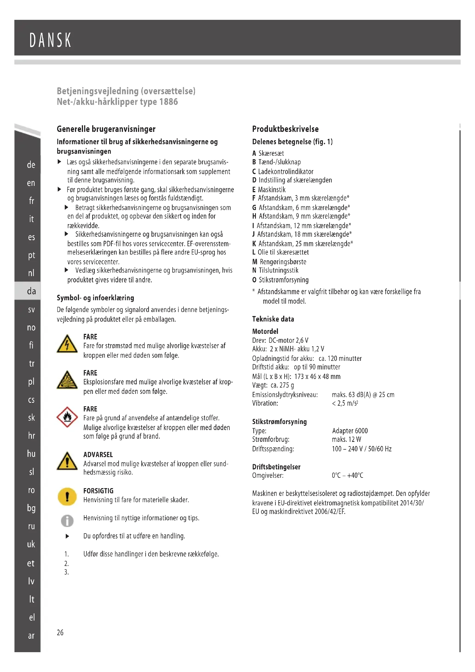 Betjeningsvejledning (oversættelse) Net-/akku-hårklipper type 1886 Generelle brugeranvisninger Informationer til brug af sikkerhedsanvisningerne og brugsanvisningen f Læs også sikkerhedsanvisningerne i den separate brugsanvis- ning samt alle medfølgende informationsark som supplement til denne brugsanvisning. f Før produktet bruges første gang, skal sikkerhedsanvisningerne og brugsanvisningen læses og forstås fuldstændigt. f Betragt sikkerhedsanvisningerne og brugsanvisningen som en del af produktet, og opbevar den sikkert og inden for rækkevidde. f Sikkerhedsanvisningerne og brugsanvisningen kan også bestilles som PDF-fil hos vores servicecenter. EF-overensstem- melseserklæringen kan bestilles på flere andre EU-sprog hos vores servicecenter. f Vedlæg sikkerhedsanvisningerne og brugsanvisningen, hvis produktet gives videre til andre. Symbol- og infoerklæring De følgende symboler og signalord anvendes i denne betjenings- vejledning på produktet eller på emballagen. FARE Fare for strømstød med mulige alvorlige kvæstelser af kroppen eller med døden som følge. FARE Eksplosionsfare med mulige alvorlige kvæstelser af krop- pen eller med døden som følge. FARE Fare på grund af anvendelse af antændelige stoffer. Mulige alvorlige kvæstelser af kroppen eller med døden som følge på grund af brand. ADVARSEL Advarsel mod mulige kvæstelser af kroppen eller sund- hedsmæssig risiko. FORSIGTIG Henvisning til fare for materielle skader. Henvisning til nyttige informationer og tips. Du opfordres til at udføre en handling. Udfør disse handlinger i den beskrevne rækkefølge.