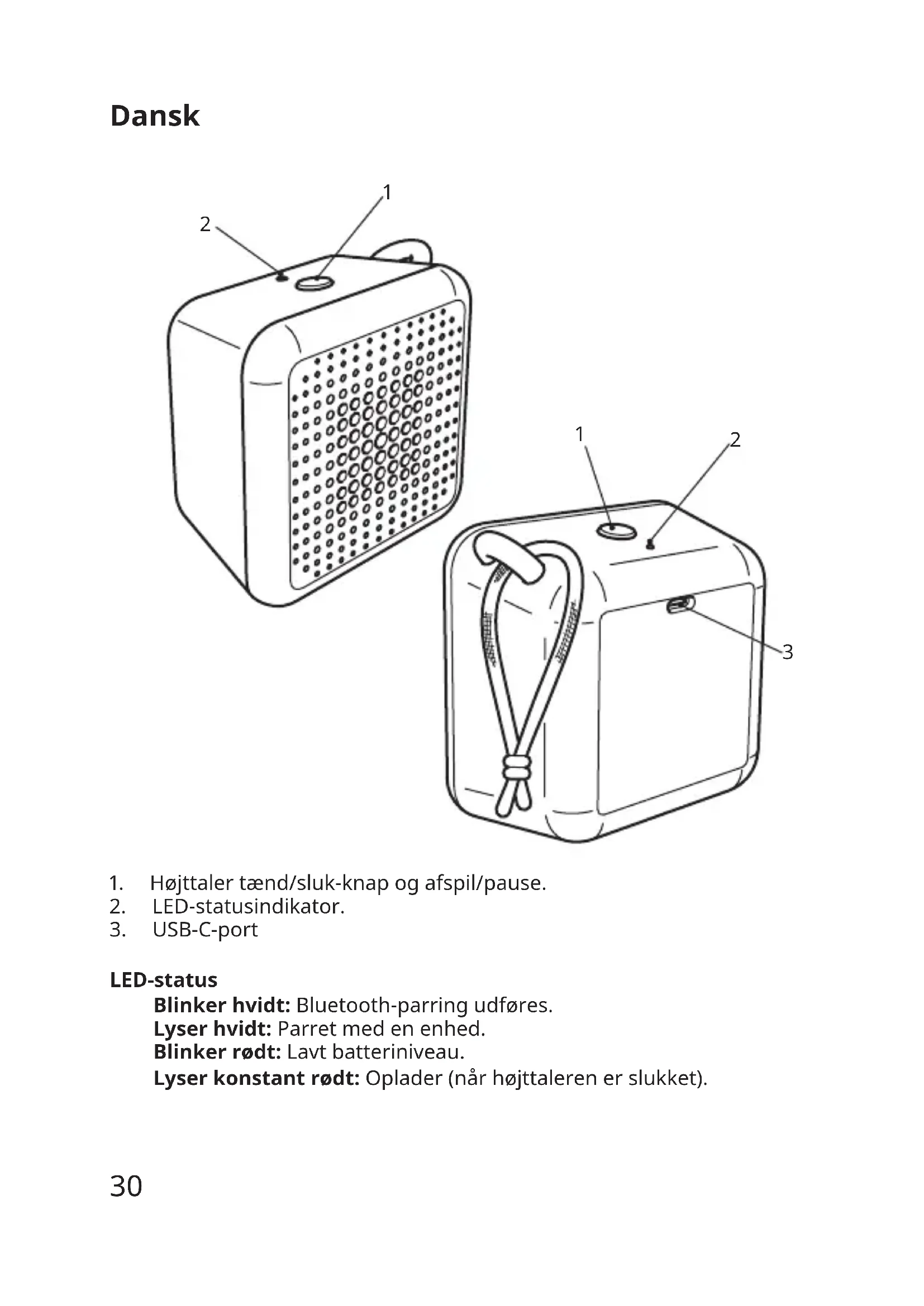 LED-status Blinker hvidt:Bluetooth-parringudføres. Lyserhvidt:Parretmedenenhed. Blinker rødt:Lavtbatteriniveau. Lyserkonstantrødt:Oplader(nårhøjttalerenerslukket). Dansk31 Sådan kommer du i gang TilslutetUSB-C-kabeltilindgangsportenogdenandenendetilen strømkilde(encomputerellerenstrømforsyning)foratopladedit produktførførstebrug,ognårLED'enblinkerrødtforatindikereetlavt batteriniveau.UnderopladninglyserLED-lampenkonstantrød,hvis højttalerenerslukket,ogholderopmedatlyse,nårbatterieterfuldt opladet. Anbefaletstrømforsyning: 5,0VDC,1,0A(medfølgerikke) Højttalerens funktioner Tænd/sluk Trykpåtænd/sluk-knappen(1),ogholddenindeforattænde/slukke forhøjttaleren. Afspil/Pause Etkorttrykpåtænd/sluk-knappenafspillerellersættermusikpå pause. Automatiskslukkefunktion Hvishøjttalerenikkeparresmedenenhed,slukkerdenautomatisk efter5minutter.Hvishøjttalerenparres,menderikkeafspillesmusik, slukkerdenautomatiskefter20minutter. Bluetooth-parring Foratparredinhøjttalermedenkildeenhedskalhøjttalerenværei Bluetooth-parringstilstand.ForatudføreparringskalduåbneBluetooth- indstillingenpådinkildeenhedogopretteforbindelsetil"VAPPEBY Portable". HøjttalerenskifterautomatisktilBluetooth-parringstilstandførstegang, dentændes,ognårentidligereparretenhedikkekanndes. Nulstillingtilfabriksindstillinger ForatfjernetidligereBluetooth-parringerskaldunulstillehøjttaleren vedattrykkepålydstyrkeknappen(1)ogholdedenindeimereend5 sekunder.Envellykketnulstillingtilfabriksindstillingernebekræftesved, atLED'enblinkerrødtogmedenhørbarlyd. AlternativtkandugåtilBluetooth-menuenpådinkildeenhedog annullereparringen.32 Stereo-parring: Tostk.VAPPEBYPortablekanstereo-parres: 1.Sørgfor,atbeggehøjttalereeriBluetooth-søgetilstand. 2.Tryktogangepåtænd/sluk-knappenpåenafhøjttalerne.Enlyd bekræftervellykketstereo-parring. 3.Opretforbindelsetilkildeenhedenvedatfølgeinstruktionernetil Bluetooth-parring. Nyttigviden