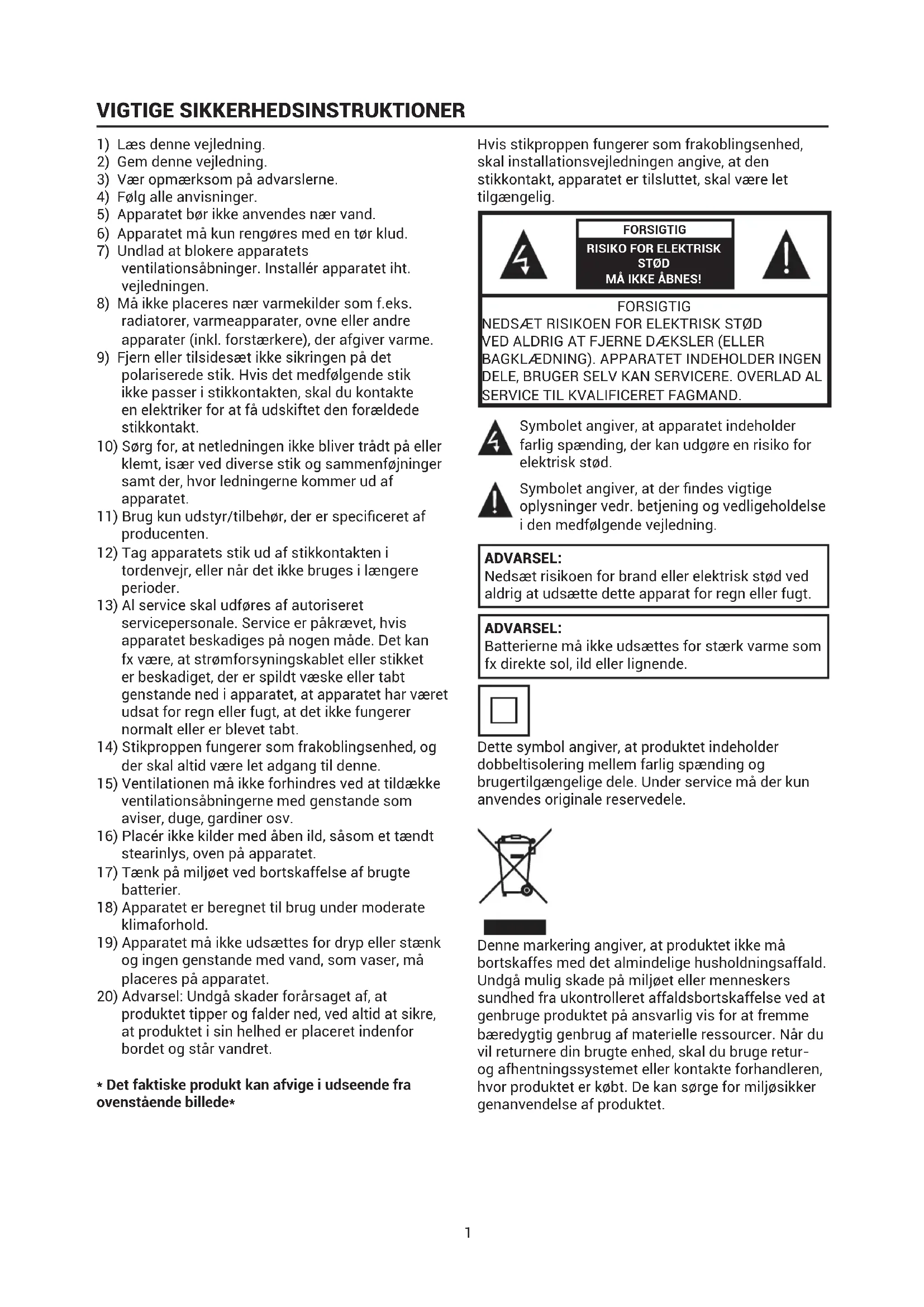 - For at undgå farlige situationer må der ikke placeres åben ild i form af fx tændte stearinlys på eller nær apparatet.