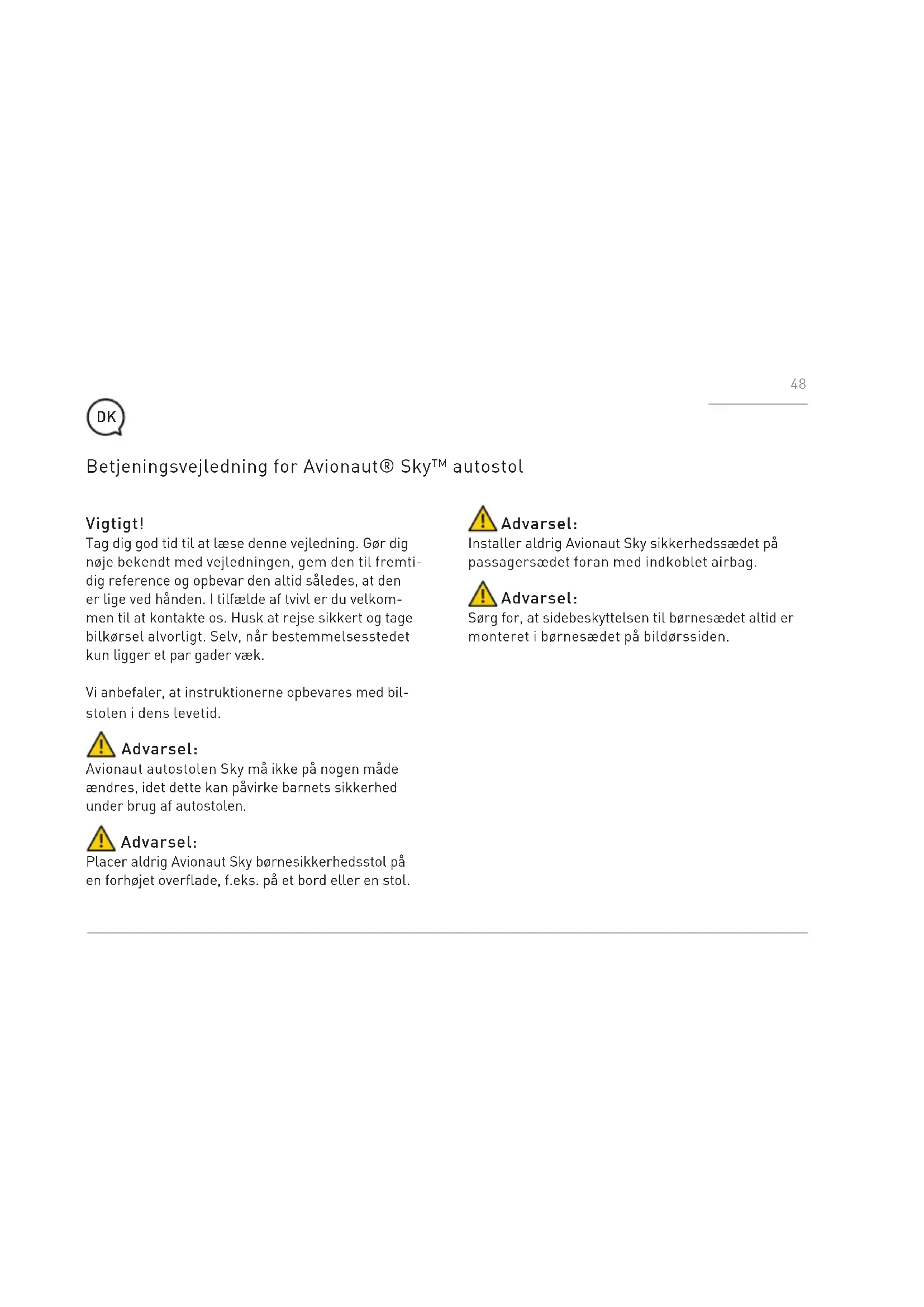 - Diese Garantie wurde von KARWALA, einem in Polen registrierten Unternehmen, erstellt. Die Adresse der Firma lautet: KARWALA Szarlejka, ul. Lukaszewicza 172 42-130 Wreczyca Wielka, Polska (1) Gekaufte Produkte mit entfernten oder geänderten Etiketten oder Identifikationsnummern gelten als nicht autorisiert. Da die Echtheit solcher Produkte nicht nachgewiesen werden kann, erstreckt sich die Garantie nicht auf sie. 47Vigtigt! Tag dig god tid til at læse denne vejledning. Gør dig nøje bekendt med vejledningen, gem den til fremti- dig reference og opbevar den altid således, at den er lige ved hånden. I tilfælde af tvivl er du velkom- men til at kontakte os. Husk at rejse sikkert og tage bilkørsel alvorligt. Selv, når bestemmelsesstedet kun ligger et par gader væk. Vi anbefaler, at instruktionerne opbevares med bil- stolen i dens levetid. Advarsel: Avionaut autostolen Sky må ikke på nogen måde ændres, idet dette kan påvirke barnets sikkerhed under brug af autostolen. Advarsel: Placer aldrig Avionaut Sky børnesikkerhedsstol på en forhøjet overflade, f.eks. på et bord eller en stol. Betjeningsvejledning for Avionaut® Sky™ autostol Advarsel: Installer aldrig Avionaut Sky sikkerhedssædet på passagersædet foran med indkoblet airbag. Advarsel: Sørg for, at sidebeskyttelsen til børnesædet altid er monteret i børnesædet på bildørssiden.