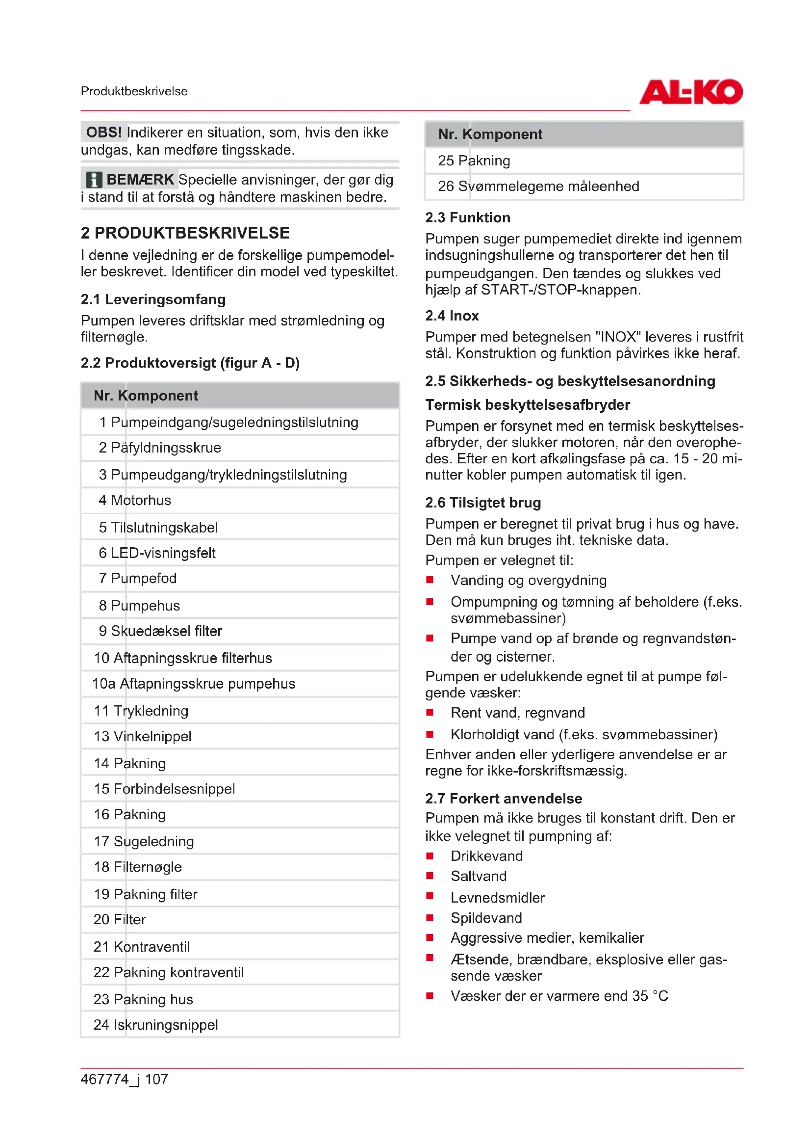 FARE! Indikerer en umiddelbar farlig situati- on, som, hvis den ikke undgås, er livsfarlig eller medfører alvorlige kvæstelser. ADVARSEL! Indikerer en potentiel farlig si- tuation, som, hvis den ikke undgås, kan være livsfarlig eller medføre alvorlige kvæstelser. FORSIGTIG! Indikerer en potentiel farlig si- tuation, som, hvis den ikke undgås, kan medføre mindre eller moderate kvæstelser.467774_j 107 Produktbeskrivelse OBS! Indikerer en situation, som, hvis den ikke undgås, kan medføre tingsskade. BEMÆRK Specielle anvisninger, der gør dig i stand til at forstå og håndtere maskinen bedre. 2 PRODUKTBESKRIVELSE I denne vejledning er de forskellige pumpemodel- ler beskrevet. Identificer din model ved typeskiltet.
