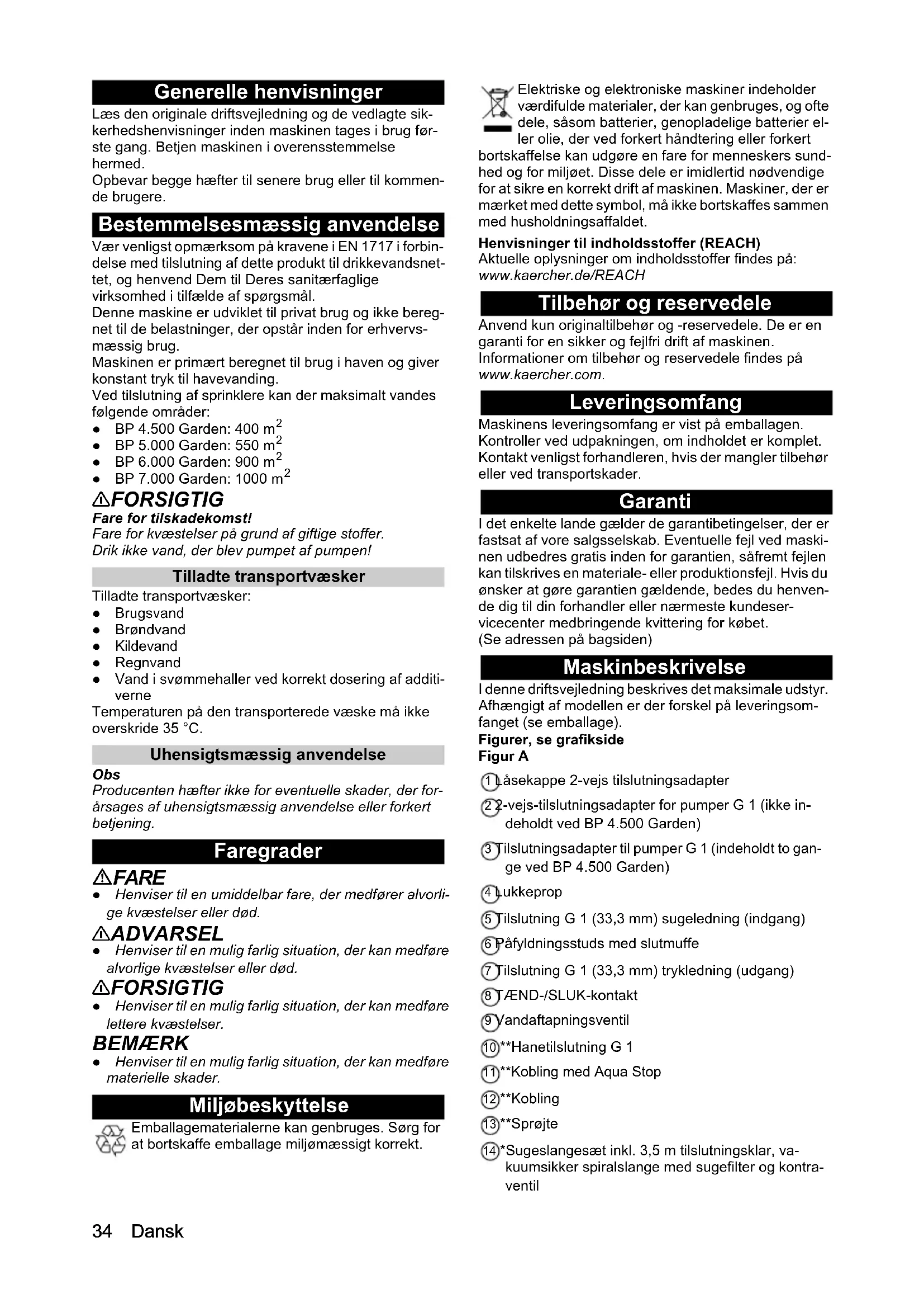 몇 FORSIGTIG Fare for tilskadekomst! Fare for kvæstelser på grund af giftige stoffer. Drik ikke vand, der blev pumpet af pumpen! Tilladte transportvæsker Tilladte transportvæsker: ● Brugsvand ● Brøndvand ● Kildevand ● Regnvand ● Vand i svømmehaller ved korrekt dosering af additi- verne Temperaturen på den transporterede væske må ikke overskride 35 °C. Uhensigtsmæssig anvendelse Obs Producenten hæfter ikke for eventuelle skader, der for- årsages af uhensigtsmæssig anvendelse eller forkert betjening. Faregrader FARE ● Henviser til en umiddelbar fare, der medfører alvorli- ge kvæstelser eller død. 몇 ADVARSEL ● Henviser til en mulig farlig situation, der kan medføre alvorlige kvæstelser eller død. 몇 FORSIGTIG ● Henviser til en mulig farlig situation, der kan medføre lettere kvæstelser. BEMÆRK ● Henviser til en mulig farlig situation, der kan medføre materielle skader. Miljøbeskyttelse Emballagematerialerne kan genbruges. Sørg for at bortskaffe emballage miljømæssigt korrekt. Elektriske og elektroniske maskiner indeholder værdifulde materialer, der kan genbruges, og ofte dele, såsom batterier, genopladelige batterier el- ler olie, der ved forkert håndtering eller forkert bortskaffelse kan udgøre en fare for menneskers sund- hed og for miljøet. Disse dele er imidlertid nødvendige for at sikre en korrekt drift af maskinen. Maskiner, der er mærket med dette symbol, må ikke bortskaffes sammen med husholdningsaffaldet. Henvisninger til indholdsstoffer (REACH) Aktuelle oplysninger om indholdsstoffer findes på: www.kaercher.de/REACH Tilbehør og reservedele Anvend kun originaltilbehør og -reservedele. De er en garanti for en sikker og fejlfri drift af maskinen. Informationer om tilbehør og reservedele findes på www.kaercher.com. Leveringsomfang Maskinens leveringsomfang er vist på emballagen. Kontroller ved udpakningen, om indholdet er komplet. Kontakt venligst forhandleren, hvis der mangler tilbehør eller ved transportskader. Garanti I det enkelte lande gælder de garantibetingelser, der er fastsat af vore salgsselskab. Eventuelle fejl ved maski- nen udbedres gratis inden for garantien, såfremt fejlen kan tilskrives en materiale- eller produktionsfejl. Hvis du ønsker at gøre garantien gældende, bedes du henven- de dig til din forhandler eller nærmeste kundeser- vicecenter medbringende kvittering for købet. (Se adressen på bagsiden) Maskinbeskrivelse I denne driftsvejledning beskrives det maksimale udstyr. Afhængigt af modellen er der forskel på leveringsom- fanget (se emballage). Figurer, se grafikside Figur A 1 Låsekappe 2-vejs tilslutningsadapter 2 2-vejs-tilslutningsadapter for pumper G 1 (ikke in- deholdt ved BP 4.500 Garden) 3 Tilslutningsadapter til pumper G 1 (indeholdt to gan- ge ved BP 4.500 Garden) 4 Lukkeprop 5 Tilslutning G 1 (33,3 mm) sugeledning (indgang) 6 Påfyldningsstuds med slutmuffe 7 Tilslutning G 1 (33,3 mm) trykledning (udgang) 8 TÆND-/SLUK-kontakt 9 Vandaftapningsventil 10 **Hanetilslutning G 1 11 **Kobling med Aqua Stop 12 **Kobling 13 **Sprøjte 14 *Sugeslangesæt inkl. 3,5 m tilslutningsklar, va- kuumsikker spiralslange med sugefilter og kontra- ventilDansk 35 15 **Haveslange 1/2″ 20 m 16 Nettilslutningskabel med stik