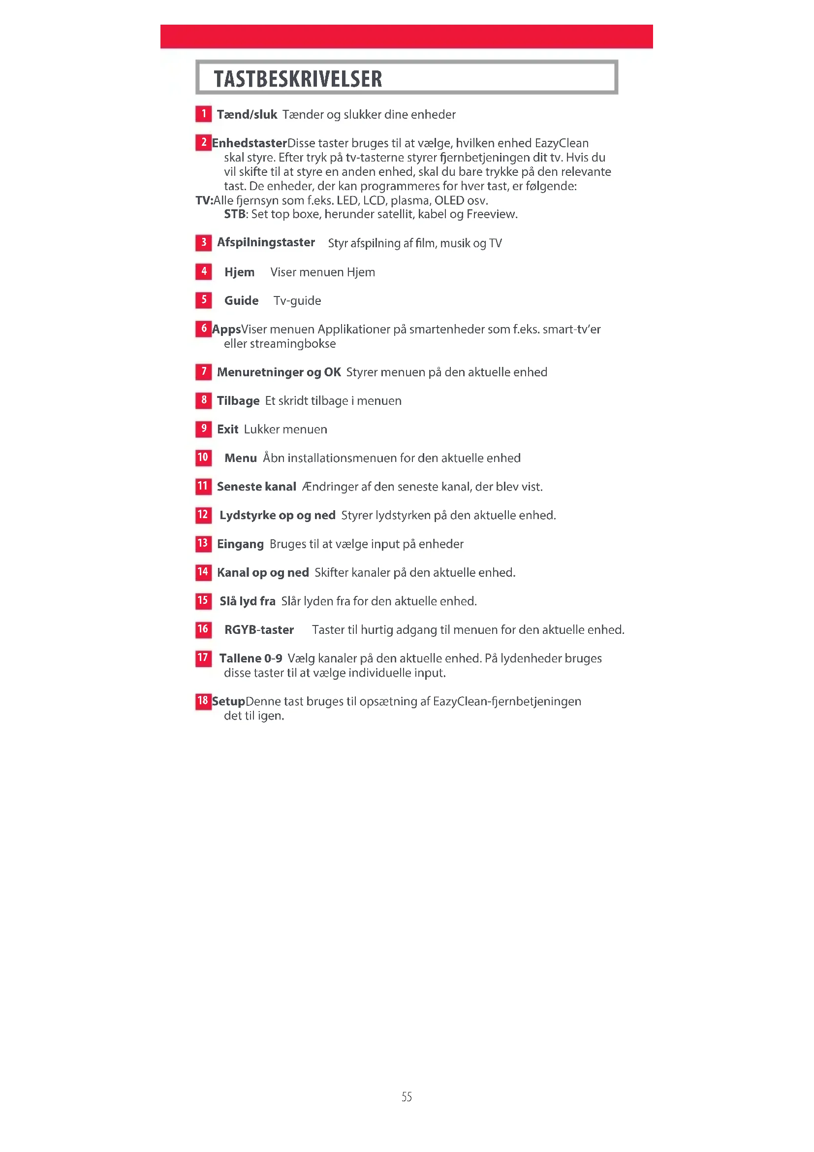Enhedstaster Disse taster bruges til at vælge, hvilken enhed EazyClean skal styre. Efter tryk på tv-tasterne styrer ernbetjeningen dit tv. Hvis du vil skifte til at styre en anden enhed, skal du bare trykke på den relevante tast. De enheder, der kan programmeres for hver tast, er følgende: TV: Alle ernsyn som f.eks. LED, LCD, plasma, OLED osv. STB: Set top boxe, herunder satellit, kabel og Freeview.