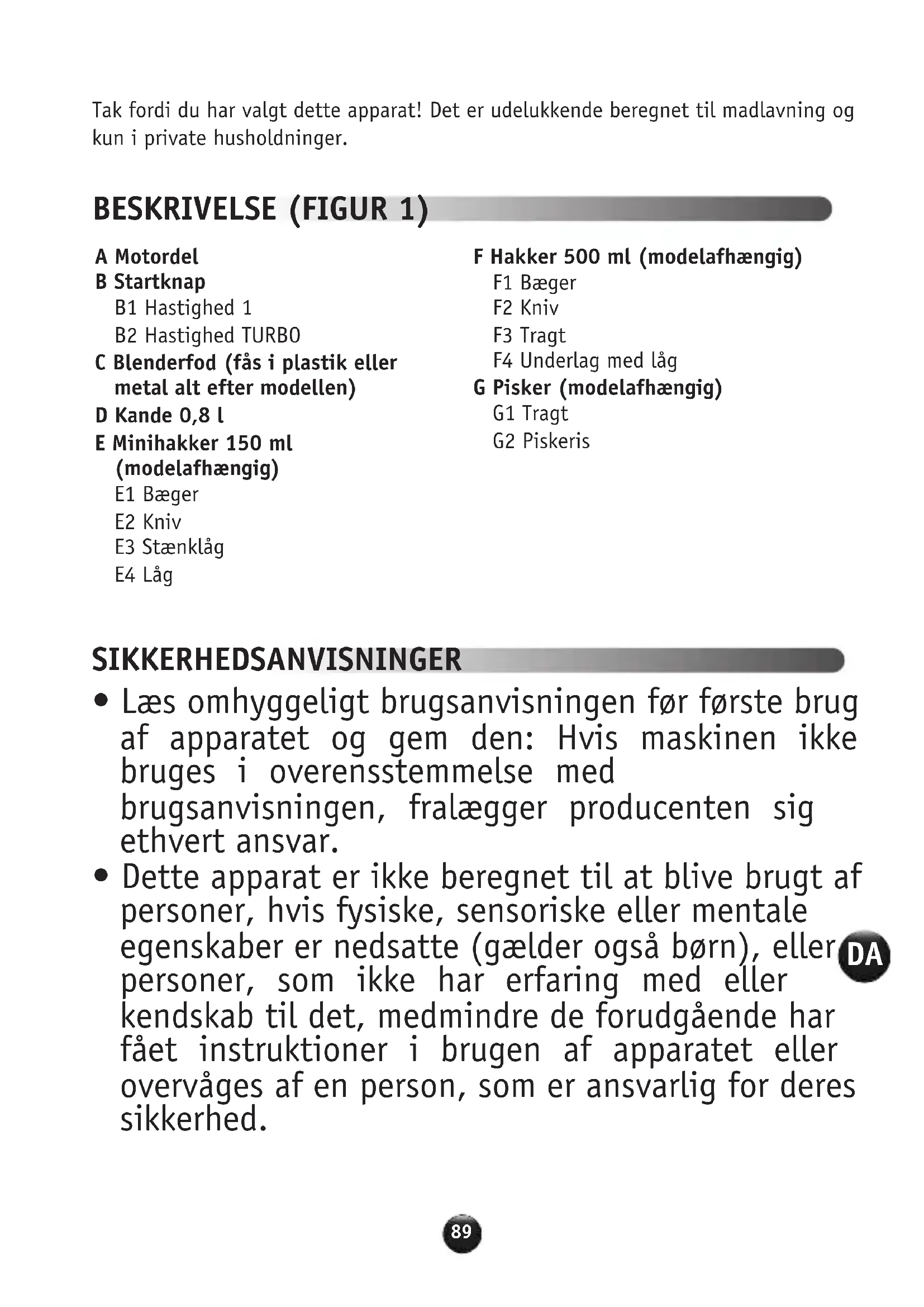 - Dette apparat er ikke beregnet til at blive brugt af personer, hvis fysiske, sensoriske eller mentale egenskaber er nedsatte (gælder også børn), eller personer, som ikke har erfaring med eller kendskab til det, medmindre de forudgående har fået instruktioner i brugen af apparatet eller overvåges af en person, som er ansvarlig for deres sikkerhed. A Motordel B Startknap B1 Hastighed 1 B2 Hastighed TURBO C Blenderfod (fås i plastik eller metal alt efter modellen) D Kande 0,8 l E Minihakker 150 ml (modelafhængig) E1 Bæger E2 Kniv E3 Stænklåg E4 Låg F Hakker 500 ml (modelafhængig) F1 Bæger F2 Kniv F3 Tragt F4 Underlag med låg G Pisker (modelafhængig) G1 Tragt G2 Piskeris• Børn skal være under opsyn, for at sikre, at de ikke leger med apparatet.