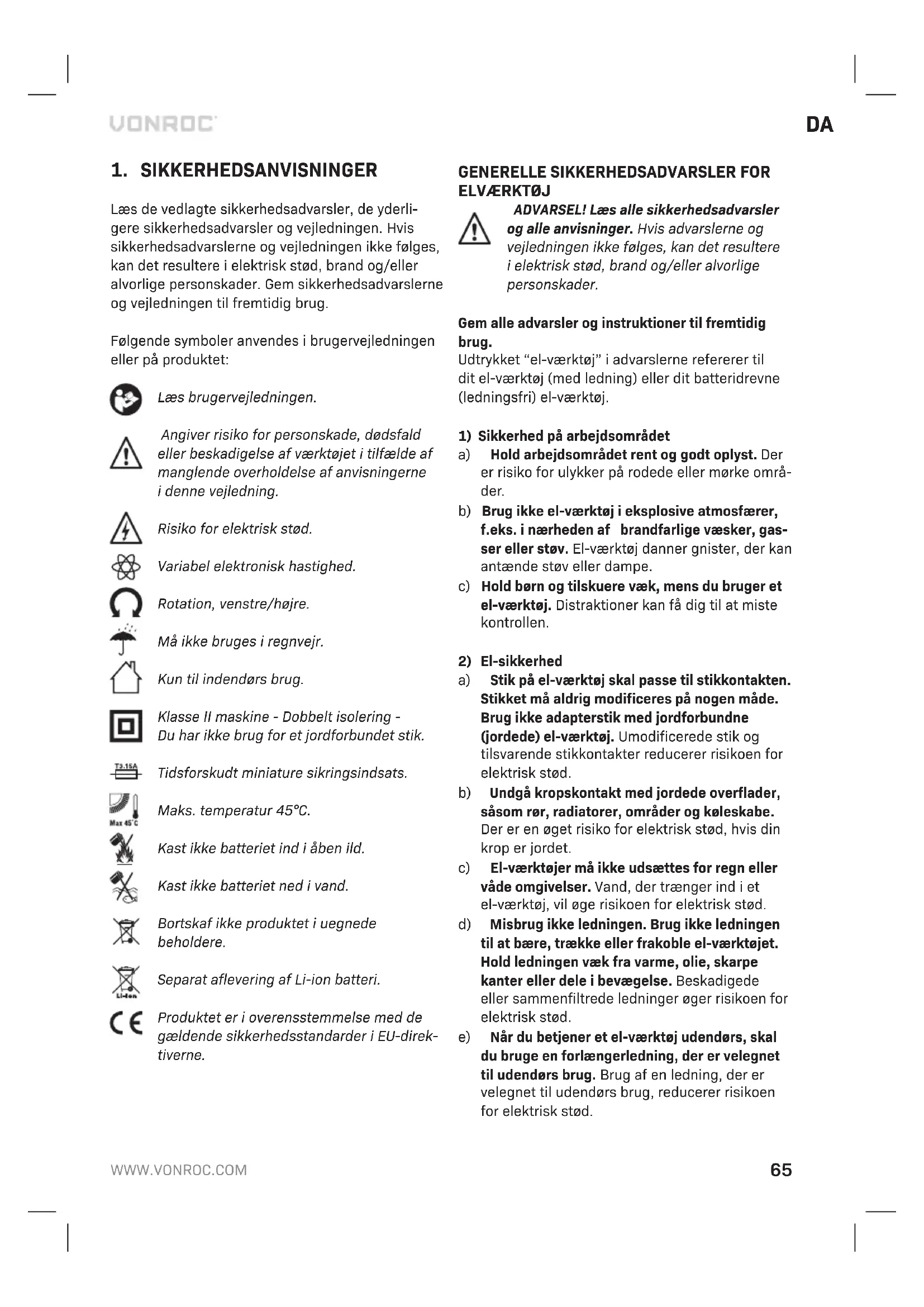 Før rengøring og vedligeholdelse skal du altid slukke for maskinen og fjerne batteripakken fra maskinen. Rengør maskinbeklædningerne regelmæssigt med en blød klud, helst efter hver anvendelse. Sørg for, at der ikke er støv eller snavs iventilationsåbnin- gerne. Fjern snavs, der sidder meget godt fast, med en blød klud, der er fugtet isæbevand. Brug ikke opløsningsmidler, som f.eks. benzin, sprit, ammoniak osv. Kemikalier som disse beskadiger de syntetiske komponenter. GARANTI VONROC-produkter er udviklet til de højeste kva- litetsstandarder og er garanteret fri for defekter ibåde materialer og udførelse iden periode, der er retsligt angivet fra datoen for det originale køb. Hvis produktet skulle udvikle fejl idenne periode på grund af defekt materiale og/eller udførelse, bedes du kontakte VONROC direkte. Følgende omstændigheder er udelukket fra denne garanti: