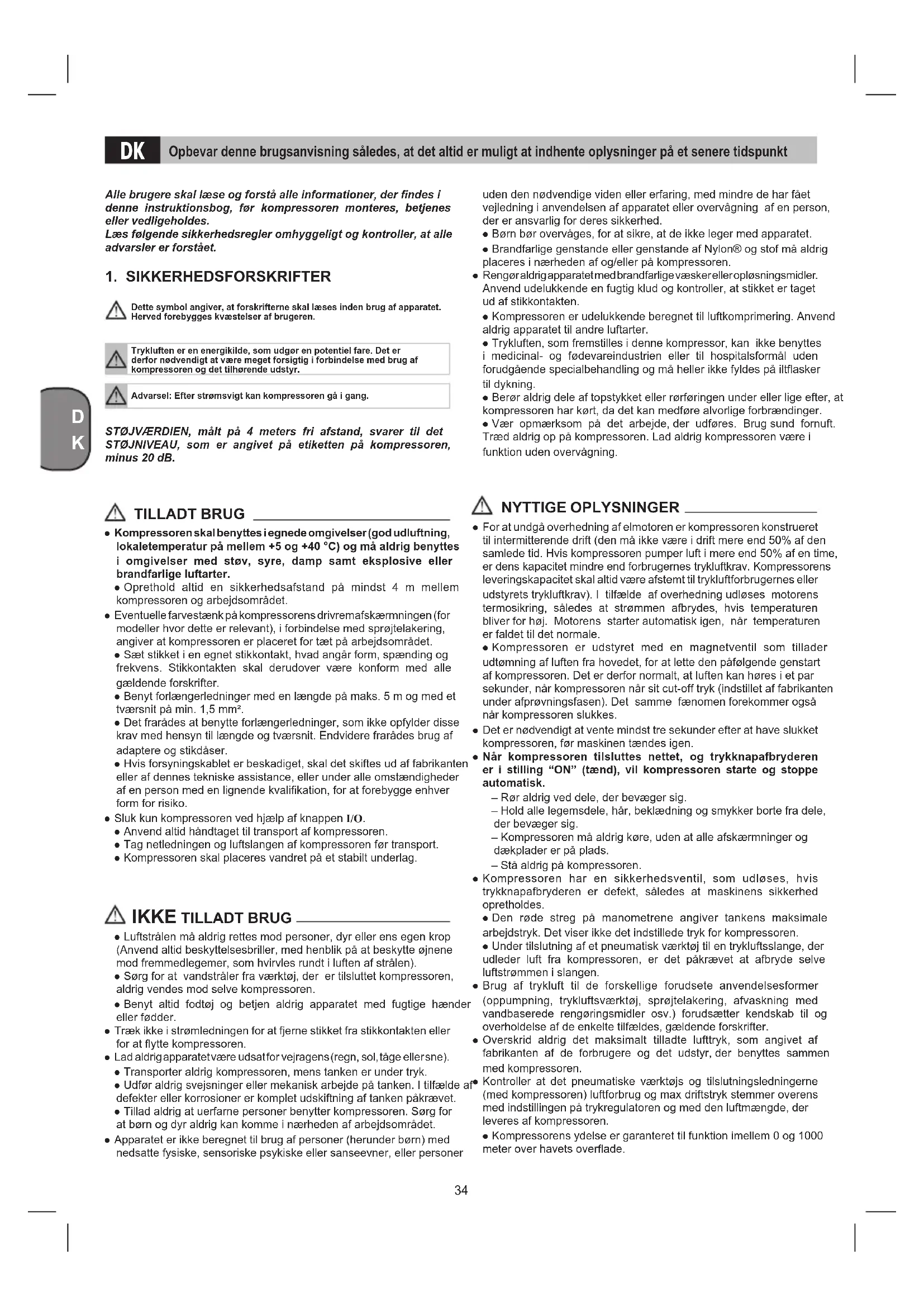 ● Luftstrålen må aldrig rettes mod personer, dyr eller ens egen krop (Anvend altid beskyttelsesbriller, med henblik på at beskytte øjnene mod fremmedlegemer, som hvirvles rundt i luften af strålen). ● Sørg for at vandstråler fra værktøj, der er tilsluttet kompressoren, aldrig vendes mod selve kompressoren. ● Benyt altid fodtøj og betjen aldrig apparatet med fugtige hænder eller fødder. ● Træk ikke i strømledningen for at fjerne stikket fra stikkontakten eller for at ytte kompressoren. ● Lad aldrig apparatet være udsat for vejragens (regn, sol, tåge eller sne). ● Transporter aldrig kompressoren, mens tanken er under tryk. ● Udfør aldrig svejsninger eller mekanisk arbejde på tanken. I tilfælde af defekter eller korrosioner er komplet udskiftning af tanken påkrævet. ● Tillad aldrig at uerfarne personer benytter kompressoren. Sørg for at børn og dyr aldrig kan komme i nærheden af arbejdsområdet. ● Apparatet er ikke beregnet til brug af personer (herunder børn) med nedsatte fysiske, sensoriske psykiske eller sanseevner, eller personer uden den nødvendige viden eller erfaring, med mindre de har fået vejledning i anvendelsen af apparatet eller overvågning af en person, der er ansvarlig for deres sikkerhed. ● Børn bør overvåges, for at sikre, at de ikke leger med apparatet. ● Brandfarlige genstande eller genstande af Nylon® og stof må aldrig placeres i nærheden af og/eller på kompressoren. ● Rengør aldrig apparatet med brandfarlige væsker eller opløsningsmidler. Anvend udelukkende en fugtig klud og kontroller, at stikket er taget ud af stikkontakten. ● Kompressoren er udelukkende beregnet til luftkomprimering. Anvend aldrig apparatet til andre luftarter. ● Trykluften, som fremstilles i denne kompressor, kan ikke benyttes i medicinal- og fødevareindustrien eller til hospitalsformål uden forudgående specialbehandling og må heller ikke fyldes på iltasker til dykning. ● Berør aldrig dele af topstykket eller rørføringen under eller lige efter, at kompressoren har kørt, da det kan medføre alvorlige forbrændinger. ● Vær opmærksom på det arbejde, der udføres. Brug sund fornuft. Træd aldrig op på kompressoren. Lad aldrig kompressoren være i funktion uden overvågning. NYTTIGE OPLYSNINGER ● For at undgå overhedning af elmotoren er kompressoren konstrueret til intermitterende drift (den må ikke være i drift mere end 50% af den samlede tid. Hvis kompressoren pumper luft i mere end 50% af en time, er dens kapacitet mindre end forbrugernes trykluftkrav. Kompressorens leveringskapacitet skal altid være afstemt til trykluftforbrugernes eller udstyrets trykluftkrav). I tilfælde af overhedning udløses motorens termosikring, således at strømmen afbrydes, hvis temperaturen bliver for høj. Motorens starter automatisk igen, når temperaturen er faldet til det normale. ● Kompressoren er udstyret med en magnetventil som tillader udtømning af luften fra hovedet, for at lette den påfølgende genstart af kompressoren. Det er derfor normalt, at luften kan høres i et par sekunder, når kompressoren når sit cut-off tryk (indstillet af fabrikanten under afprøvningsfasen). Det samme fænomen forekommer også når kompressoren slukkes. ● Det er nødvendigt at vente mindst tre sekunder efter at have slukket kompressoren, før maskinen tændes igen. ● Når kompressoren tilsluttes nettet, og trykknapafbryderen er i stilling “ON” (tænd), vil kompressoren starte og stoppe automatisk. – Rør aldrig ved dele, der bevæger sig. – Hold alle legemsdele, hår, beklædning og smykker borte fra dele, der bevæger sig. – Kompressoren må aldrig køre, uden at alle afskærmninger og dækplader er på plads. – Stå aldrig på kompressoren. ● Kompressoren har en sikkerhedsventil, som udløses, hvis trykknapafbryderen er defekt, således at maskinens sikkerhed opretholdes. ● Den røde streg på manometrene angiver tankens maksimale arbejdstryk. Det viser ikke det indstillede tryk for kompressoren. ● Under tilslutning af et pneumatisk værktøj til en trykluftsslange, der udleder luft fra kompressoren, er det påkrævet at afbryde selve luftstrømmen i slangen. ● Brug af trykluft til de forskellige forudsete anvendelsesformer (oppumpning, trykluftsværktøj, sprøjtelakering, afvaskning med vandbaserede rengøringsmidler osv.) forudsætter kendskab til og overholdelse af de enkelte tilfældes, gældende forskrifter. ● Overskrid aldrig det maksimalt tilladte lufttryk, som angivet af fabrikanten af de forbrugere og det udstyr, der benyttes sammen med kompressoren. ● Kontroller at det pneumatiske værktøjs og tilslutningsledningerne (med kompressoren) luftforbrug og max driftstryk stemmer overens med indstillingen på trykregulatoren og med den luftmængde, der leveres af kompressoren. ● Kompressorens ydelse er garanteret til funktion imellem 0 og 1000 meter over havets overade. Opbevar denne brugsanvisning således, at det altid er muligt at indhente oplysninger på et senere tidspunkt DK35