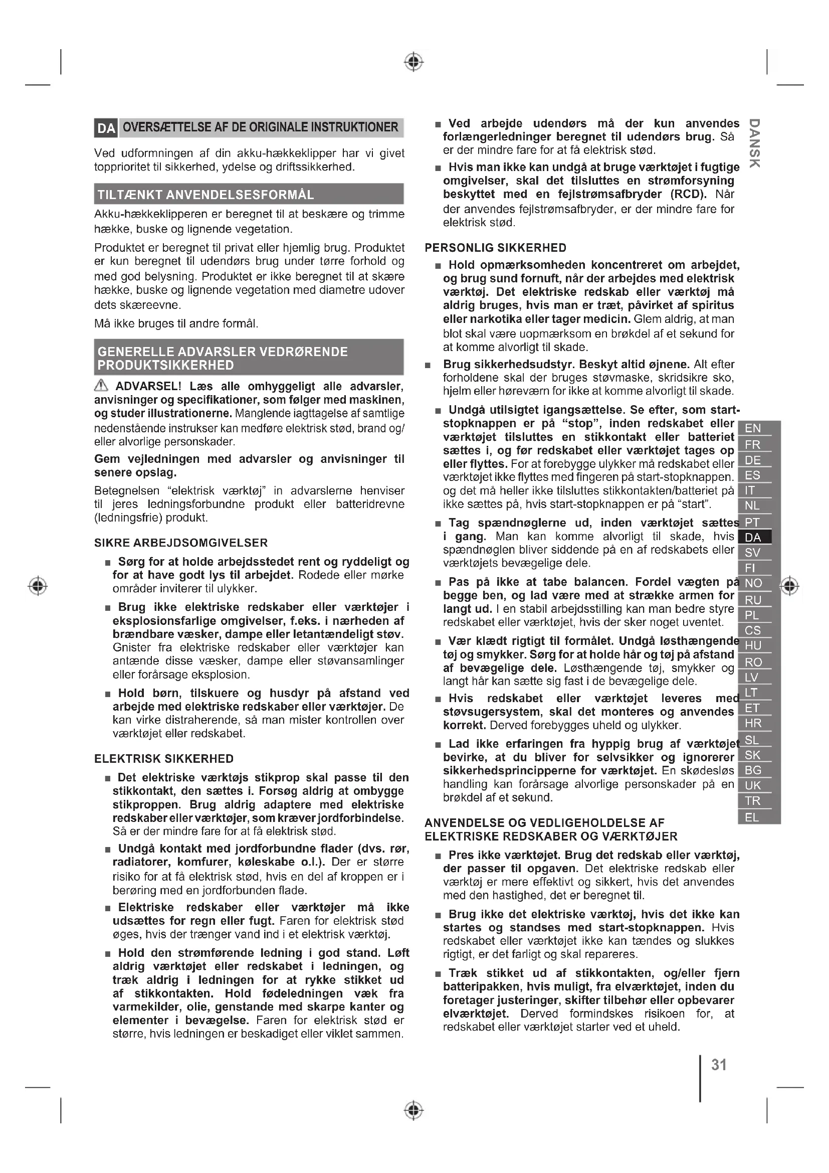 HÆKKEKLIPPEREN ■ Brug ikke hækkeklipperen under dårlige vejrforhold, især ikke når der er fare for lynnedslag. Dette mindsker risikoen for at blive ramt af lynet. ■ Hold alle netledninger og kabler væk fra skæreområdet. Netledninger eller kabler kan være skjult i hække eller buske og kan ved et uheld blive skåret over af klingen. ■ Bær høreværn. Det passende beskyttelsesudstyr vil reducere risikoen for høretab. ■ Hold kun på hækkeklipperen på de isolerede gribeflader, da knivene evt. kan komme i berøring med skjulte ledninger. Hvis knivene kommer i berøring en strømførende ledning, kan det gøre blottede metaldele på hækkeklipperen strømførende og give operatøren elektrisk stød. ■ Hold alle kropsdele på afstand af klingen. Forsøg ikke at fjerne afklippet materiale eller holde om materiale, der skal klippes, mens knivene er i bevægelse. Klinger fortsætter med at rotere efter slukning af motor. Et øjebliks uopmærksomhed under anvendelse af produktet kan medføre alvorlige personskader. ■ Ved udtagning af fastklemt materiale eller ved vedligeholdelse af hækkeklipperen skal alle tænd/sluk- knapper være slukkede, og batterienheden skal tages ud eller frakobles. Uventet aktivering af hækklipperen, under fjernelse af fastsiddende materiale eller servicering, kan medføre alvorlig personskade. ■ Bær hækkeklipperen i håndtaget med stoppet klinge, og pas på ikke at aktivere en afbryder. At bære hækkeklipperen på den korrekte måde reducerer risikoen for at starte den forårsage efterfølgende personskade med klingerne. ■ Når du transporterer eller opbevarer hækkeklipperen, skal du altid påmontere sværdbeskytteren. Korrekt håndtering af hækkeklipperen reducerer risikoen for personskade med knivene. EKSTRA SIKKERHEDSADVARSLER ■ Forsøg ikke at skære stammer eller kviste, der er større end den skærekapacitet, der er angivet i specifikationstabellen, eller som naturligvis er for store til at føres ind i klingen. Brug en manuel håndsav eller beskæringssav til klipning af lange stammer. ■ Når man bruger produktet, skal man altid holde det godt fast med hændene i de to håndtag. ■ Husk altid at inspicere maskinen inden brug. Kontrollér, at alle betjeningselementer fungerer fejlfrit. Kontrollér for løse fastgørelseselementer, brændstoflækage, mv. Kontrollér, at alle skærme, og håndtag er fastgjort ordentligt og sikkert. Udskift evt. beskadigede dele inden brug. Kontrollér for batterilækager.DANSK