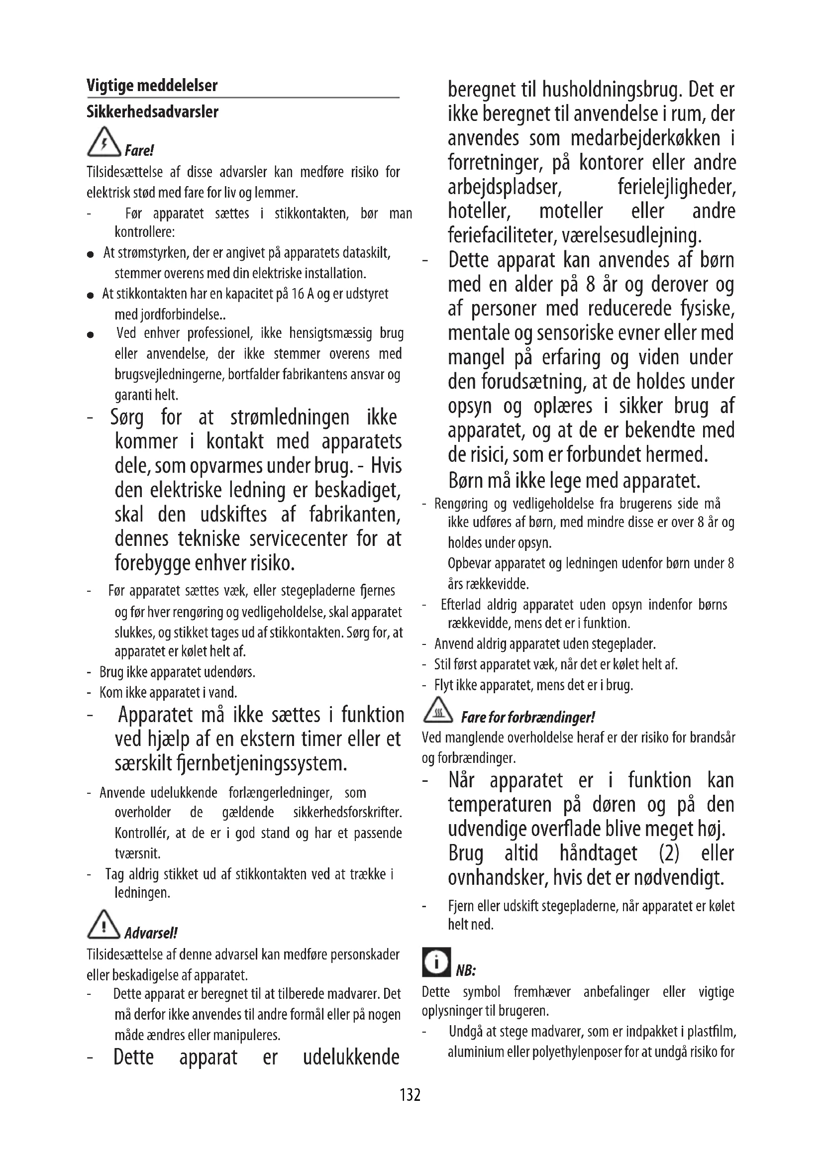 DOSIS VOOR: 8-10 wafels BEREIDING: 10 minuten BEREIDINGSTIJD: 15 minuten INGREDIËNTEN: - 2 koppen/460 gram bloem - 1 theelepel zout - 1 theelepel/3 gram gist - 170 gram suiker - 2 eieren - 1,5 kop/345 ml lauwe melk - 80 gram boter - 1 theelepel vanille-extract - 140 gram donkere chocolade - 60 gram cacaopoeder - 6 gram kaneelpoeder BEREIDING: Doe de chocolade en de boter in een magnetronkom en warm op in de magnetron met het maximale vermogen gedurende 30 seconden. Roer tot de chocolade en de boter volledig gesmolten zijn en het mengsel glad is. Laat iets afkoelen. Meng met een garde de eieren, de melk en de vanille in een grote kom en schep hierdoor zorgvuldig het boter- chocolademengsel. Zeef de bloem, suiker, cacaopoeder, kaneelpoeder, gist en zout samen in een grote kom. Voeg het mengsel van bloem en andere ingrediënten bij de eieren en meng alles met een garde tot het mengsel glad genoeg is. Verwarm de wafelplaat. Boter, wanneer het display het opschrift READY toont, de plaat in of breng een anti-aanbak spray aan, schenk vervolgens een maatschepje in elk vormpje van de plaat (eventueel met behulp van een lepel indien nodig); strijk het beslag uit met een spatel. Bak de wafels tot ze goudgekleurd en knapperig zijn (5 minuten). Ga door totdat het beslag op is. Serveer onmiddellijk.132 Vigtige meddelelser Sikkerhedsadvarsler Fare! Tilsidesættelse af disse advarsler kan medføre risiko for elektrisk stød med fare for liv og lemmer. - Før apparatet sættes i stikkontakten, bør man kontrollere: ● At strømstyrken, der er angivet på apparatets dataskilt, stemmer overens med din elektriske installation. ● At stikkontakten har en kapacitet på 16 A og er udstyret med jordforbindelse.. ● Ved enhver professionel, ikke hensigtsmæssig brug eller anvendelse, der ikke stemmer overens med brugsvejledningerne, bortfalder fabrikantens ansvar og garanti helt. - Sørg for at strømledningen ikke kommer i kontakt med apparatets dele, som opvarmes under brug. - Hvis den elektriske ledning er beskadiget, skal den udskiftes af fabrikanten, dennes tekniske servicecenter for at forebygge enhver risiko. - Før apparatet sættes væk, eller stegepladerne ernes og før hver rengøring og vedligeholdelse, skal apparatet slukkes, og stikket tages ud af stikkontakten. Sørg for, at apparatet er kølet helt af. - Brug ikke apparatet udendørs. - Kom ikke apparatet i vand. - Apparatet må ikke sættes i funktion ved hjælp af en ekstern timer eller et særskilt ernbetjeningssystem. - Anvende udelukkende forlængerledninger, som overholder de gældende sikkerhedsforskrifter. Kontrollér, at de er i god stand og har et passende tværsnit. - Tag aldrig stikket ud af stikkontakten ved at trække i ledningen. Advarsel! Tilsidesættelse af denne advarsel kan medføre personskader eller beskadigelse af apparatet. - Dette apparat er beregnet til at tilberede madvarer. Det må derfor ikke anvendes til andre formål eller på nogen måde ændres eller manipuleres. - Dette apparat er udelukkende beregnet til husholdningsbrug. Det er ikke beregnet til anvendelse i rum, der anvendes som medarbejderkøkken i forretninger, på kontorer eller andre arbejdspladser, ferielejligheder, hoteller, moteller eller andre feriefaciliteter, værelsesudlejning. - Dette apparat kan anvendes af børn med en alder på 8 år og derover og af personer med reducerede fysiske, mentale og sensoriske evner eller med mangel på erfaring og viden under den forudsætning, at de holdes under opsyn og oplæres i sikker brug af apparatet, og at de er bekendte med de risici, som er forbundet hermed. Børn må ikke lege med apparatet. - Rengøring og vedligeholdelse fra brugerens side må ikke udføres af børn, med mindre disse er over 8 år og holdes under opsyn. Opbevar apparatet og ledningen udenfor børn under 8 års rækkevidde. - Efterlad aldrig apparatet uden opsyn indenfor børns rækkevidde, mens det er i funktion. - Anvend aldrig apparatet uden stegeplader. - Stil først apparatet væk, når det er kølet helt af. - Flyt ikke apparatet, mens det er i brug. Fare for forbrændinger! Ved manglende overholdelse heraf er der risiko for brandsår og forbrændinger. - Når apparatet er i funktion kan temperaturen på døren og på den udvendige overade blive meget høj. Brug altid håndtaget (2) eller ovnhandsker, hvis det er nødvendigt. - Fjern eller udskift stegepladerne, når apparatet er kølet helt ned. NB: Dette symbol fremhæver anbefalinger eller vigtige oplysninger til brugeren. - Undgå at stege madvarer, som er indpakket i plastlm, aluminium eller polyethylenposer for at undgå risiko for133 brand. Dette produkt er fremstillet i overensstemmelse med EF-forordning 1935/2004 vedrørende materialer og genstande, som er beregnet til kontakt med fødevarer. Bortskaelse af apparatet Apparatet ikke bortskaes sammen med husholdningsaaldet, men skal derimod aeveres til et godkendt indsamlingscenter. BESKRIVELSE