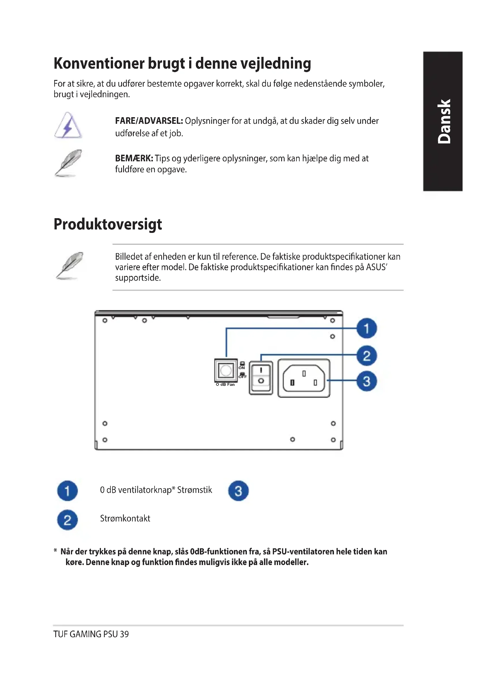 - V případě nedodržení pokynů výrobce a bezpečnostních pokynů ihned propadají veškeré záruky a jistoty.TUF GAMING PSU 39 Dansk Dansk Konventioner brugt i denne vejledning For at sikre, at du udfører bestemte opgaver korrekt, skal du følge nedenstående symboler, brugt i vejledningen. FARE/ADVARSEL: Oplysninger for at undgå, at du skader dig selv under udførelse af et job. BEMÆRK: Tips og yderligere oplysninger, som kan hjælpe dig med at fuldføre en opgave. Produktoversigt 0 dB ventilatorknap* Strømstik Strømkontakt