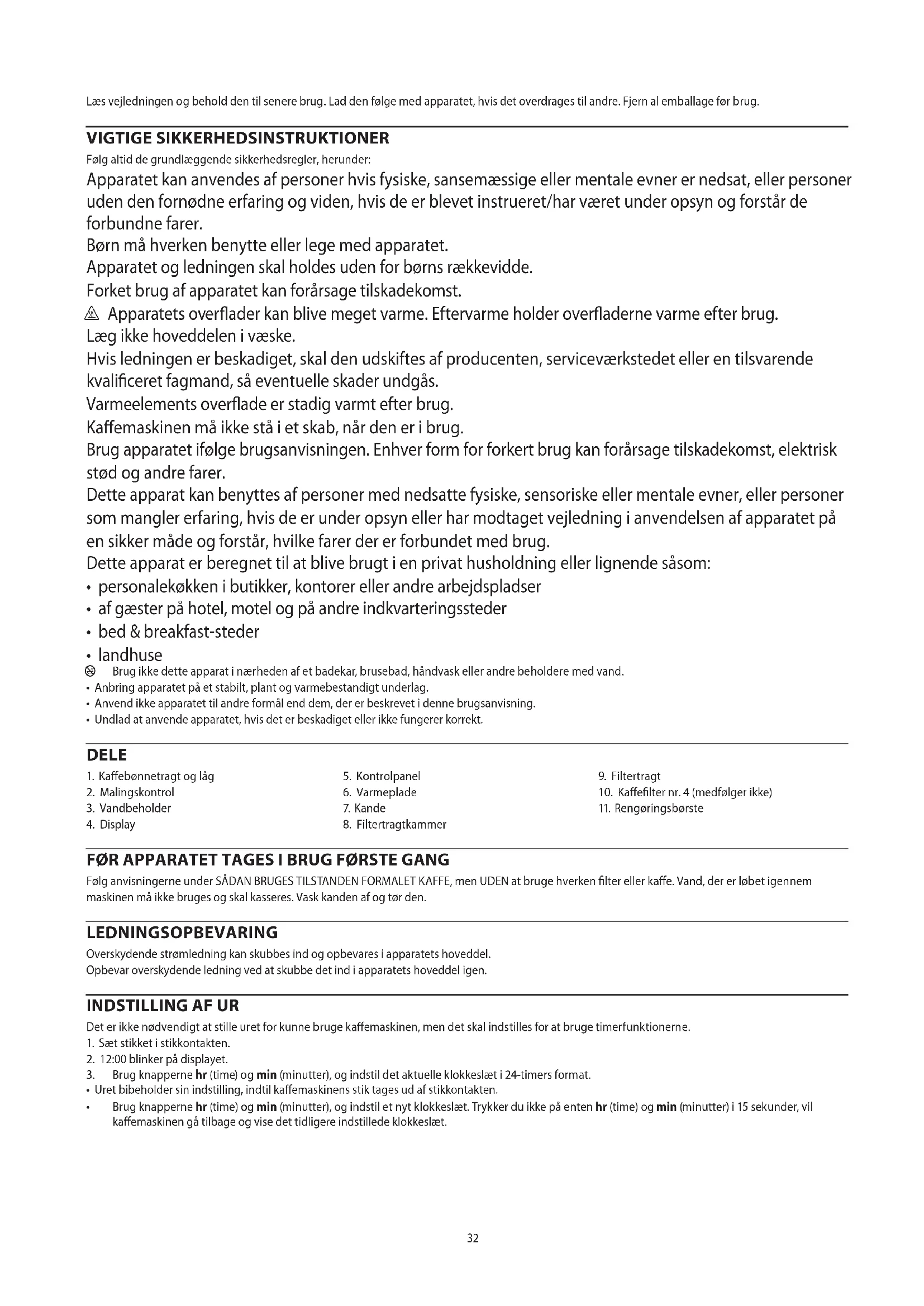 AE32 Læs vejledningen og behold den til senere brug. Lad den følge med apparatet, hvis det overdrages til andre. Fjern al emballage før brug. VIGTIGE SIKKERHEDSINSTRUKTIONER Følg altid de grundlæggende sikkerhedsregler, herunder: Apparatet kan anvendes af personer hvis fysiske, sansemæssige eller mentale evner er nedsat, eller personer uden den fornødne erfaring og viden, hvis de er blevet instrueret/har været under opsyn og forstår de forbundne farer. Børn må hverken benytte eller lege med apparatet. Apparatet og ledningen skal holdes uden for børns rækkevidde. Forket brug af apparatet kan forårsage tilskadekomst. h Apparatets overader kan blive meget varme. Eftervarme holder overaderne varme efter brug. Læg ikke hoveddelen i væske. Hvis ledningen er beskadiget, skal den udskiftes af producenten, serviceværkstedet eller en tilsvarende kvaliceret fagmand, så eventuelle skader undgås. Varmeelements overade er stadig varmt efter brug. Kaemaskinen må ikke stå i et skab, når den er i brug. Brug apparatet ifølge brugsanvisningen. Enhver form for forkert brug kan forårsage tilskadekomst, elektrisk stød og andre farer. Dette apparat kan benyttes af personer med nedsatte fysiske, sensoriske eller mentale evner, eller personer som mangler erfaring, hvis de er under opsyn eller har modtaget vejledning i anvendelsen af apparatet på en sikker måde og forstår, hvilke farer der er forbundet med brug. Dette apparat er beregnet til at blive brugt i en privat husholdning eller lignende såsom:
