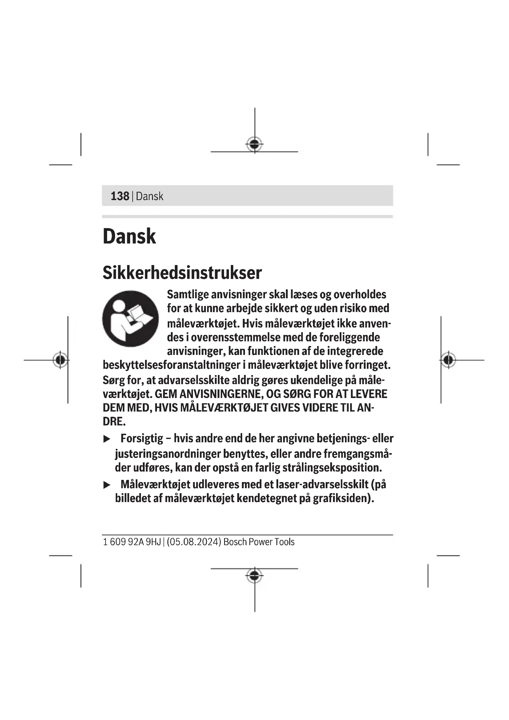 ved 20–25°C D) De angivne værdier forudsætter normale til gunstige omgivelsesbetin- gelser (f.eks. ingen vibration, ingen tåge, ingen røg, ingen direkte sol- lys). Efter kraftige temperatursvingninger kan der forekommer nøj- agtighedsafvigelser. E) Der forekommer kun en ikke-ledende tilsmudsning, idet der dog lejlig- hedsvis må forventes en midlertidig ledeevne forårsaget af tildugning. F) Vægt med vægholder og uden batterier/akkuer Serienummeret (11) på typeskiltet bruges til entydig identifikation af måle- værktøjet. Bosch Power Tools 1 609 92A 9HJ | (05.08.2024)146 | Dansk Energiforsyning måleværktøj Isætning/skift af batterier Det anbefales at bruge alkaliske manganbatterier eller akkuer til måleværktøjet. For at åbne batteridækslet(8) skal du trykke på låsen(7) og tage batteridækslet af. Indsæt batterierne eller akkuerne. Sørg i den forbindelse for, at polerne vender rigtigt som vist på in- dersiden af batterirummet. Udskift altid alle batterier eller akkuer samtidigt. Brug kun batteri- er eller akkuer fra en og samme producent og med samme kapaci- tet. u Tag batterierne eller akkuerne ud af måleværktøjet, hvis de ikke skal bruges i længere tid. Batterierne og akkuerne kan korrodere og aflade sig selv, hvis det sidder i måleværktø- jet i længere tid. 1 609 92A 9HJ | (05.08.2024) Bosch Power ToolsDansk | 147 Brug Ibrugtagning u Beskyt måleværktøjet mod fugt og direkte sollys. u Udsæt ikke måleværktøjet for ekstreme temperaturer eller temperatursvingninger. Lad det f.eks. ikke ligge i længere tid i bilen. Ved større temperatursvingninger skal måleværktøjets temperatur tilpasse sig, før det tages i brug. Ved ekstreme temperaturer eller temperatursvingninger kan måleværktøjets præcision påvirkes. u Undgå, at måleværktøjet udsættes for kraftige stød eller tabes. Hvis måleværktøjet bliver beskadiget, kan det resultere i unøjagtige målinger. Hvis det alligevel udsættes for et kraftigt stød eller tabes, skal laserlinjen efterfølgende kontrolleres ved at sammenligne den med en kendt vandret eller lodret referen- celinje. u Brug altid kun laserpunktets/laserlinjens midte til marke- ring. Laserpunktets størrelse og laserlinjens bredde ændres i takt med afstanden. Bosch Power Tools 1 609 92A 9HJ | (05.08.2024)148 | Dansk Tænd/sluk Måleværktøjet tændes ipunktdrift ved at skubbe tænd/sluk- knappen(2) et trin i retning af laserudgangsåbningerne (kontakt- position ●). Måleværktøjet tændes ilinjedrift ved at skubbe tænd/sluk- knappen(2) i retning af laserudgangsåbningerne, indtil den ikke kan komme længere (kontaktposition —). Måleværktøjet sender straks efter tændingen og afhængigt af den valgte driftstilstand en laserstråle ud af udgangsåbningen(6) (punktdrift) eller(1) (linjedrift). u Ret ikke laserstrålen mod personer eller dyr og ret ikke blikket ind i laserstrålen, heller ikke fra stor afstand. Måleværktøjet slukkes ved at skubbe tænd/sluk-knappen(2) i retningen OFF, indtil den ikke kan komme længere. u Lad ikke det tændte måleværktøj være uden opsyn, og sluk måleværktøjet efter brug. Andre personer kan blive blændet af laserstrålen. 1 609 92A 9HJ | (05.08.2024) Bosch Power ToolsDansk | 149 Placering af måleværktøj(sebilledeA) Den angivne nivelleringsnøjagtighed nås kun, hvis måleværktøjet positioneres rigtigt: – Ved den vandrette justering vha. libellen til vandret justering(4) skal kontaktfladen af aluminium(12) på måle- værktøjet pege nedad. – Ved den lodrette positionering vha. libelle til lodret positionering(5) skal laserudgangsåbningerne(6) og (1) pege opad, og måleværktøjets aluminium-kontaktflade(12) skal pe- ge mod venstre. Anvendelsesmuligheder Positionering vha. laserlinje (linjefunktion) Ved linjedrift kan du for eksempel justere genstande på vægge: – vandret ved siden af hinanden (måleværktøj placeret vandret) – lodret over hinanden (måleværktøj placeret lodret) – i en vilkårlig vinkel (måleværktøj justeret med drejeskiven(14) på holderen). Sæt måleværktøjet direkte på en lodret magnetisk flade ved hjælp af magneten(9), eller brug holderen(13). Bosch Power Tools 1 609 92A 9HJ | (05.08.2024)150 | Dansk Holderen(13) kan fastgøres på væggen på 2måder: – Med stifter (se billedeB): Sæt holderen(13) på væggen. Sæt de medfølgende stifter(18) gennem udsparingerne i holderen i væggen (afhængigt af væggens beskaffenhed lodret eller i en vinkel på 45°). – Ophængning: Sæt holderen (13) med udsparingen på bagsi- den på en skrue eller etsøm, der rager en smule ud fra væg- gen. Bagsiden af holderen skal ligge an mod væggen. Sørg for, at holderen(13) er sikkert fastgjort til væggen. Anbring måleværktøjet med magneten(9) på magnetholderen(15) på holderen. Bemærk! Vandret positionering vha. laserlinjen er kun mulig på den væg, som måleværktøjet blev fastgjort til. Selvom laserlinjen er synlig på tilstødende vægge, løber den ikke nødvendigvis van- dret på disse vægge. Positionering i vilkårlige vinkler (se billedeC): Placer måle- værktøjet vandret på holderen. Drej derefterdrejeskiven (14) på holderen, så markeringen 0° ligger under positionsviseren(3) til måleværktøjet. Drej kun måleværktøjet, så positionsviseren(3) peger mod den ønskede vinkel på drejeski- ven. 1 609 92A 9HJ | (05.08.2024) Bosch Power ToolsDansk | 151 Overførsel/kontrol af højder vha. laserpunkt (punktdrift) (sebilledeD) Sæt holderen(13) med 1/4"-stativholderen(17) på stativets(16) gevind eller på et almindeligt fotostativs gevind. Skru holderen fast igen med stativets låseskrue. Placer stativho- vedet vandret. Anbring måleværktøjet med magneten(9) på magnetholderen(15) på holderen, og juster den vandret. Ved hjælp af laserpunktet kan du for eksempel positionere stik- kontakter på forskellige vægge eller hænge knager i en garderobe i samme højde. Drej i den forbindelse stativhovedet med den mont