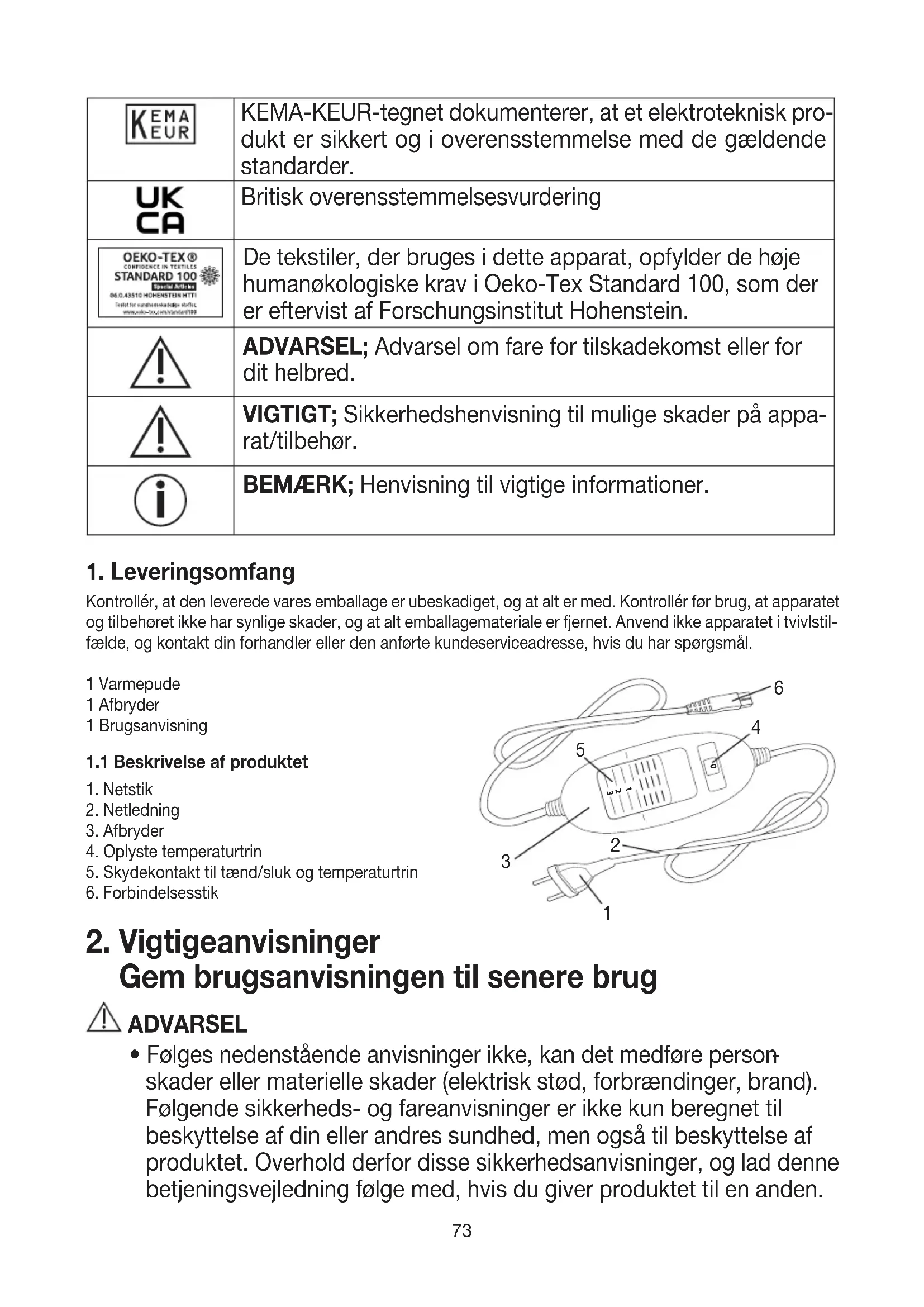 Kontrollér, at den leverede vares emballage er ubeskadiget, og at alt er med. Kontrollér før brug, at apparatet og tilbehøret ikke har synlige skader, og at alt emballagemateriale er fjernet. Anvend ikke apparatet i tvivlstil- fælde, og kontakt din forhandler eller den anførte kundeserviceadresse, hvis du har spørgsmål. 1 Varmepude 1 Afbryder 1 Brugsanvisning