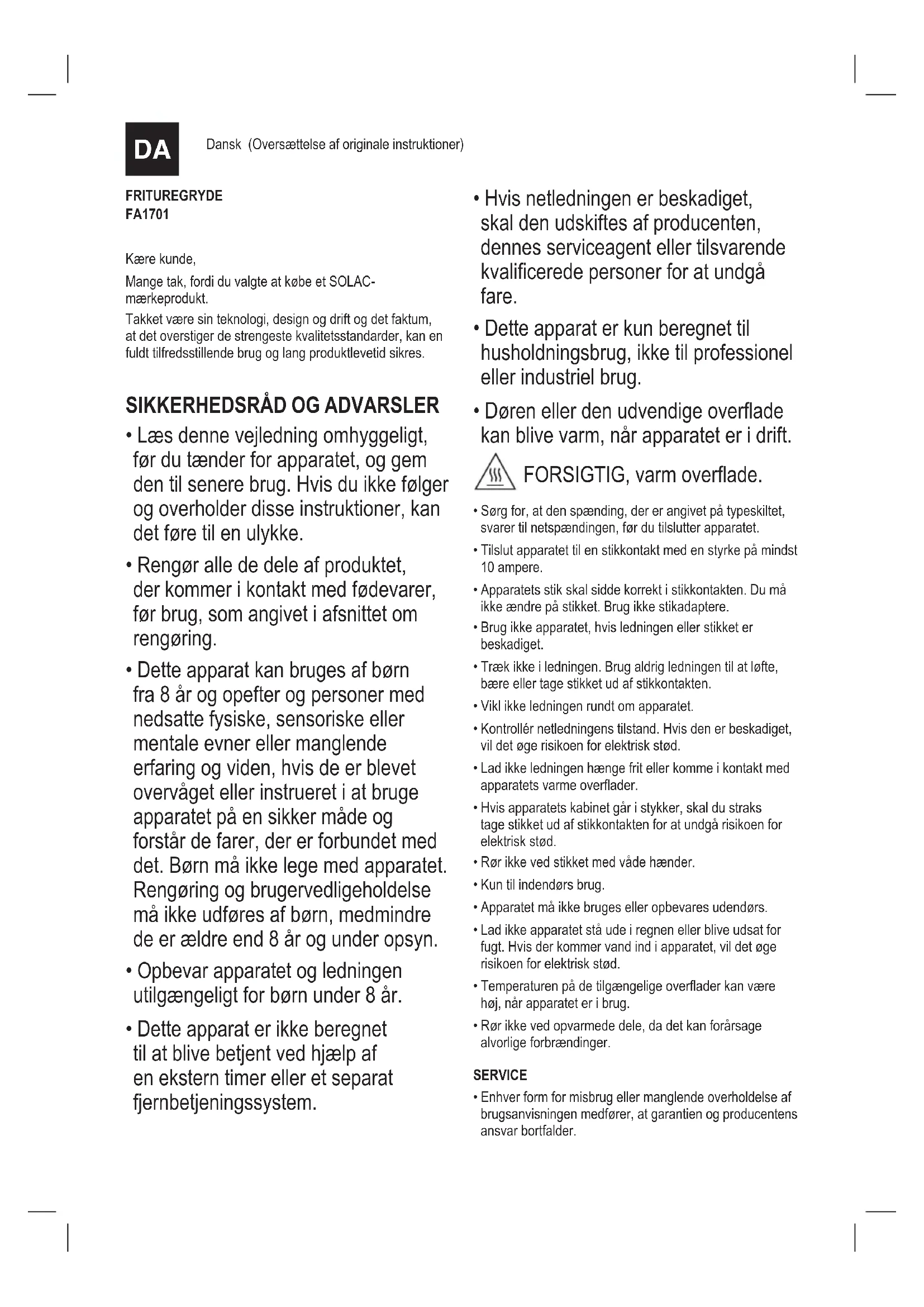 FRITUREGRYDE FA1701 Kære kunde, Mange tak, fordi du valgte at købe et SOLAC- mærkeprodukt. Takket være sin teknologi, design og drift og det faktum, at det overstiger de strengeste kvalitetsstandarder, kan en fuldt tilfredsstillende brug og lang produktlevetid sikres.