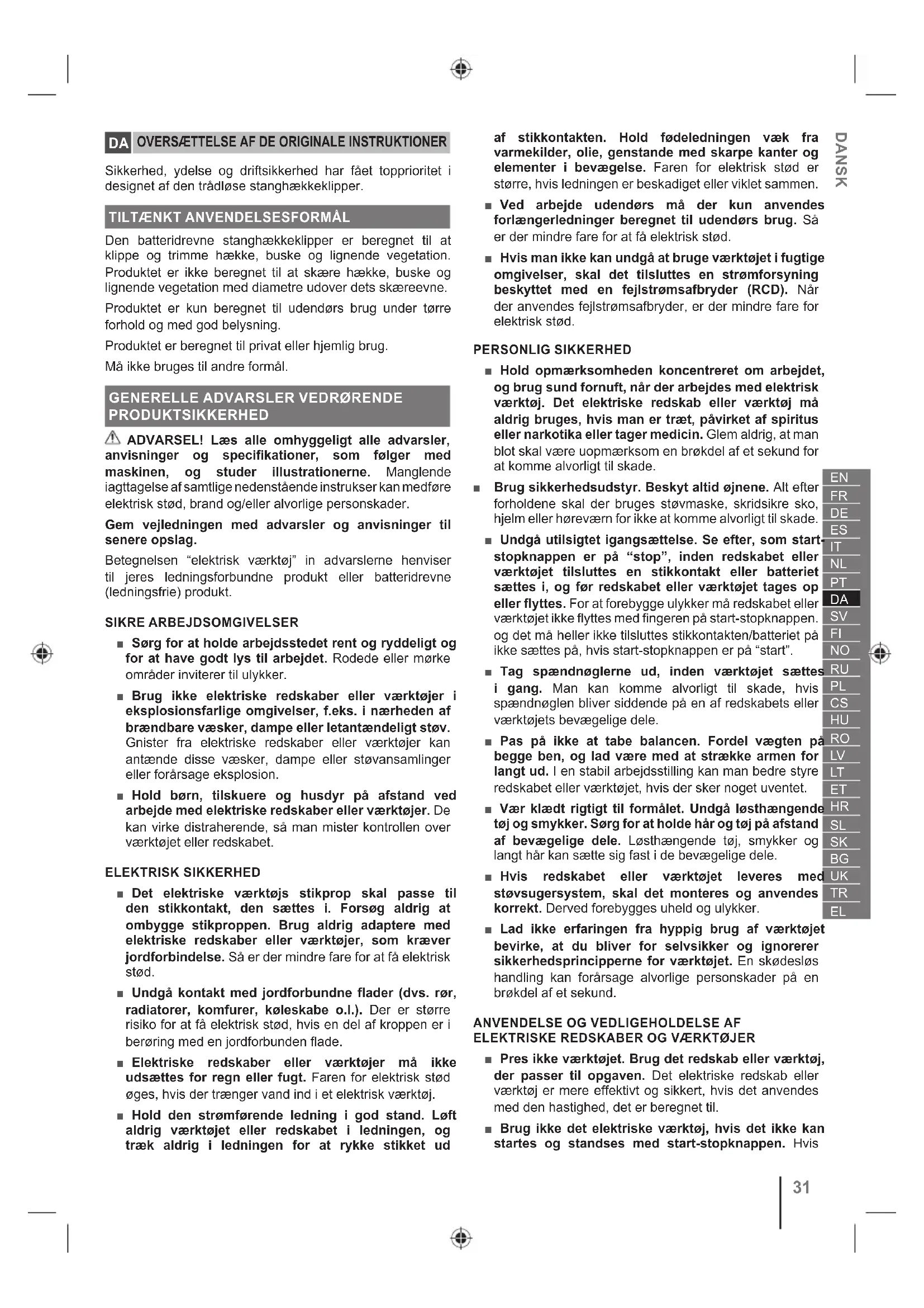 ■ Oplad kun redskabets eller værktøjets batteri med den af fabrikanten anførte oplader. En oplader beregnet til en bestemt type batteri kan forårsage brand, hvis den anvendes til en anden type batteri. ■ Der må kun anvendes en bestemt type batteri til det batteridrevne redskab eller værktøj. Hvis der anvendes andre batterier, kan der opstå brand. ■ Når batteriet ikke er i brug, må det ikke komme i berøring med metalgenstande som papirklemmer, mønter, nøgler, skruer, søm eller andre genstande, der kan skabe forbindelse mellem batterikontakterne. Kortslutning af batteriets kontakter kan forårsage forbrændinger eller brand. ■ Undgå berøring med batterivæsken, hvis den siver ud efter fejlagtig håndtering. Hvis det skulle ske, skylles det berørte område grundigt med rent vand. Hvis man har fået væske i øjnene, søges også læge. Væskestænk fra et batteri kan forårsage irritation eller forbrændinger. ■ Undlad at bruge en batteripakke, som er blevet beskadiget eller ændret. Beskadigede eller ændrede batteripakker kan opføre sig på en uventet måde, som kan resultere i brand, eksplosion eller personskader. ■ Undlad at udsætte batteripakken eller værktøjet for brand eller høje temperaturer. Eksponering for brand eller temperaturer over 130 °C kan forårsage eksplosion. ■ Følg alle ladeinstrukser, og undlad at oplade batteripakken eller værktøjet uden for det temperaturområde, der er angivet i brugsanvisningen. Forkert opladning eller opladning ved temperaturer uden for det angivne område kan ødelægge batteriet og øge risikoen for brand. VEDLIGEHOLDELSE ■ Reparationer skal overlades til en fagmand, som udelukkende anvender originale reservedele. Derefter kan det elektriske redskab eller værktøj igen bruges sikkert. ■ Forsøg aldrig selv at reparere beskadigede batteripakker. Batteripakker må kun repareres af producenten eller af autoriserede serviceudbydere. SIKKERHEDSADVARSLER FOR STANGHÆKKEKLIPPER ■ Brug ikke hækkeklipperen under dårlige vejrforhold, især ikke når der er fare for lynnedslag. Dette mindsker risikoen for at blive ramt af lynet. ■ Hold alle netledninger og kabler væk fra skæreområdet. Netledninger eller kabler kan være skjult i hække eller buske og kan ved et uheld blive skåret over af klingen. ■ Bær høreværn. Det passende beskyttelsesudstyr vil reducere risikoen for høretab. ■ Hold kun på hækkeklipperen på de isolerede gribeflader, da knivene evt. kan komme i berøring med skjulte ledninger. Hvis knivene kommer i berøring en strømførende ledning, kan det gøre blottede metaldele på hækkeklipperen strømførende og give operatøren elektrisk stød. ■ Hold alle kropsdele på afstand af klingen. Forsøg ikke at fjerne afklippet materiale eller holde om materiale, der skal klippes, mens knivene er i bevægelse. Klinger fortsætter med at rotere efter slukning af motor. Et øjebliks uopmærksomhed under anvendelse af produktet kan medføre alvorlige personskader. ■ Ved udtagning af fastklemt materiale eller ved vedligeholdelse af hækkeklipperen skal alle tænd/ sluk-knapper være slukkede, og batterienheden skal tages ud eller frakobles. Uventet aktivering af hækklipperen, under fjernelse af fastsiddende materiale eller servicering, kan medføre alvorlig personskade. ■ Bær hækkeklipperen i håndtaget med stoppet klinge, og pas på ikke at aktivere en afbryder. At bære hækkeklipperen på den korrekte måde reducerer risikoen for at starte den forårsage efterfølgende personskade med klingerne. ■ Når du transporterer eller opbevarer hækkeklipperen, skal du altid påmontere sværdbeskytteren. Korrekt håndtering af hækkeklipperen reducerer risikoen for personskade med knivene. ■ Brug altid hovedværn, når du bruger stanghækkeklipperen over hovedet. Faldende grene og ting kan resultere i alvorlig personskade.DANSK