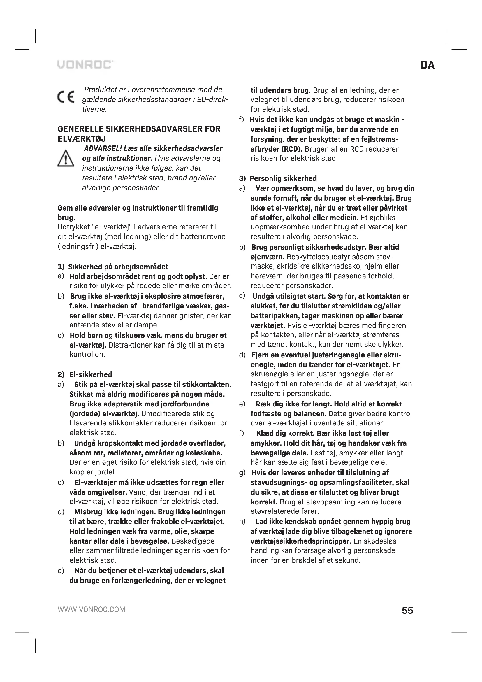 Før rengøring og vedligeholdelse skal du altid slukke for maskinen og fjerne batteripakken fra maskinen. Rengør maskinbeklædningerne regelmæssigt med en blød klud, helst efter hver anvendelse. Sørg for, at der ikke er støv eller snavs i ventilationsåbningerne. Fjern snavs, der sidder meget godt fast, med en blød klud, der er fugtet i sæbevand. Brug ikke opløsningsmidler, som f.eks. benzin, sprit, ammoniak osv. Kemikalier som disse beskadiger de syntetiske komponenter. GARANTI VONROC-produkter er udviklet til de højeste kva- litetsstandarder og er garanteret fri for defekter i både materialer og udførelse i den periode, der er retsligt angivet fra datoen for det originale køb. Hvis produktet skulle udvikle fejl i denne periode på grund af defekt materiale og/eller udførelse, bedes du kontakte VONROC direkte. Følgende omstændigheder er udelukket fra denne garanti: