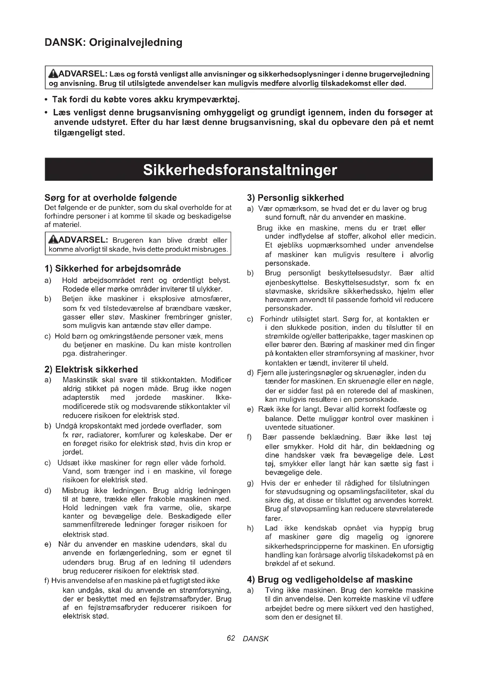 a) Maskinstik skal svare til stikkontakten. Modicer aldrig stikket på nogen måde. Brug ikke nogen adapterstik med jordede maskiner. Ikke- modicerede stik og modsvarende stikkontakter vil reducere risikoen for elektrisk stød. b) Undgå kropskontakt med jordede overader, som fx rør, radiatorer, komfurer og køleskabe. Der er en forøget risiko for elektrisk stød, hvis din krop er jordet. c) Udsæt ikke maskiner for regn eller våde forhold. Vand, som trænger ind i en maskine, vil forøge risikoen for elektrisk stød. d) Misbrug ikke ledningen. Brug aldrig ledningen til at bære, trække eller frakoble maskinen med. Hold ledningen væk fra varme, olie, skarpe kanter og bevægelige dele. Beskadigede eller sammenltrerede ledninger forøger risikoen for elektrisk stød. e) Når du anvender en maskine udendørs, skal du anvende en forlængerledning, som er egnet til udendørs brug. Brug af en ledning til udendørs brug reducerer risikoen for elektrisk stød. f) Hvis anvendelse af en maskine på et fugtigt sted ikke kan undgås, skal du anvende en strømforsyning, der er beskyttet med en fejlstrømsafbryder. Brug af en fejlstrømsafbryder reducerer risikoen for elektrisk stød.