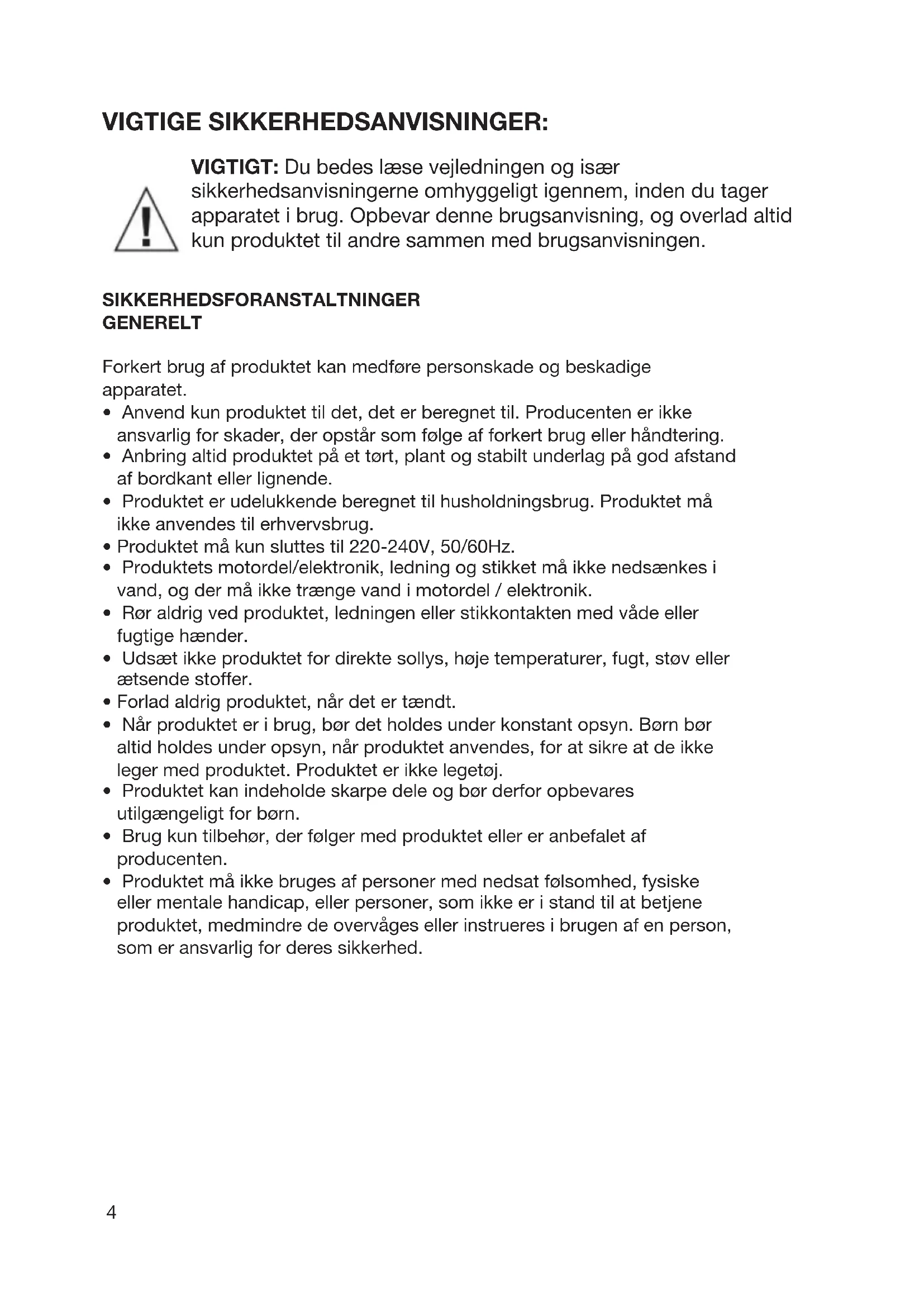 - Produktet er udelukkende beregnet til husholdningsbrug. Produktet må ikke anvendes til erhvervsbrug.