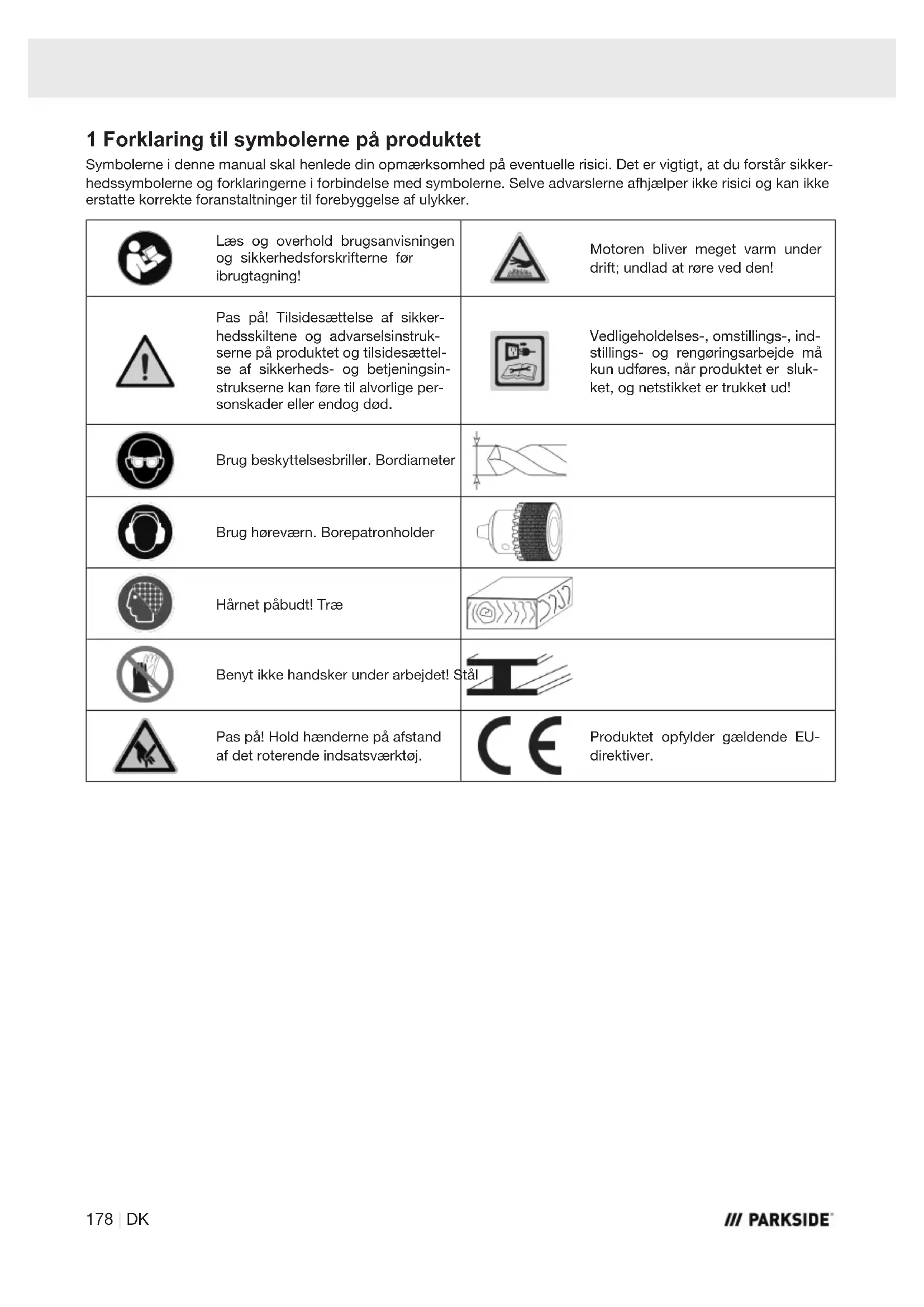 A. 1 x Unbrakonøgle 4 mm B. 1 x Unbrakonøgle 5 mm 1 x Bænkboremaskine 1 x Brugsanvisning DK | 1795 Tilsigtet brug Bænkboremaskinen er beregnet til boring i metal, træ, kunststof (plast) og fliser. Der kan anvendes skaftbor med en bordiameter på 1,5 mm til 13 mm. Produktet må kun bruges som tilsigtet. Enhver anden form for brug falder uden for tilsigtet brug. Brugeren, ikke producenten, bærer ansvaret for materielle skader eller personskader af enhver art, der måtte opstå som følge heraf. Tilsigtet anvendelse omfatter også overholdelse af sik- kerhedsforskrifterne og monteringsvejledningen samt driftsanvisningerne i brugsanvisningen. Personer, der anvender og vedligeholder produktet, skal være fortrolige med dette og være informeret om mulige farer. Hvis der foretages ændringer ved produktet, bortfalder producentens ansvar for deraf følgende skader. Produktet må kun bruges med originale dele og origi- nalt tilbehør fra producenten. Producentens forskrifter vedrørende sikkerhed, ar- bejdsmåde og vedligeholdelse samt målene, som er angivet i de tekniske data, skal overholdes. Vær opmærksom på, at vores produkter ikke er kon- strueret til erhvervsmæssig, håndværksmæssig eller in- dustriel brug. Vi fraskriver os ansvaret, hvis produktet bruges i erhvervs-, håndværks- eller industrivirksomhe- der samt til lignende arbejde. Forklaring til signalord i brugsanvisningen FARE Signalord til angivelse af en overhængende farlig situation, som, hvis den ikke undgås, vil medføre død eller alvorlig personskade. ADVARSEL Signalord til angivelse af en potentielt farlig situation, som, hvis den ikke undgås, kan medføre død eller alvorlig personskade. FORSIGTIG Signalord til angivelse af en potentielt farlig situation, som, hvis den ikke undgås, kan medføre mindre eller moderat personskade. PAS PÅ Signalord til angivelse af en potentielt farlig situation, som, hvis den ikke undgås, kan medføre materielle skader på produktet el- ler ejendom/besiddelse. 6 Sikkerhedsforskrifter Generelle sikkerhedsforskrifter for elværktøj Opbevar alle sikkerhedsforskrifter og anvisninger til fremtidig brug. Udtrykket "elværktøj", der er anvendt i sikkerhedsfor- skrifterne, henviser til strømnet-drevne elværktøjer (med strømnetkabel) eller til batteridrevne elværktøjer (uden strømnetkabel). ADVARSEL Læs alle sikkerhedsforskrifter, anvisninger, illustrationer og tekniske data, der følger med dette elværktøj. Følges de følgende instruktioner ikke nøje som be- skrevet, kan dette føre til elektrisk stød, brand og/el- ler alvorlige personskader.