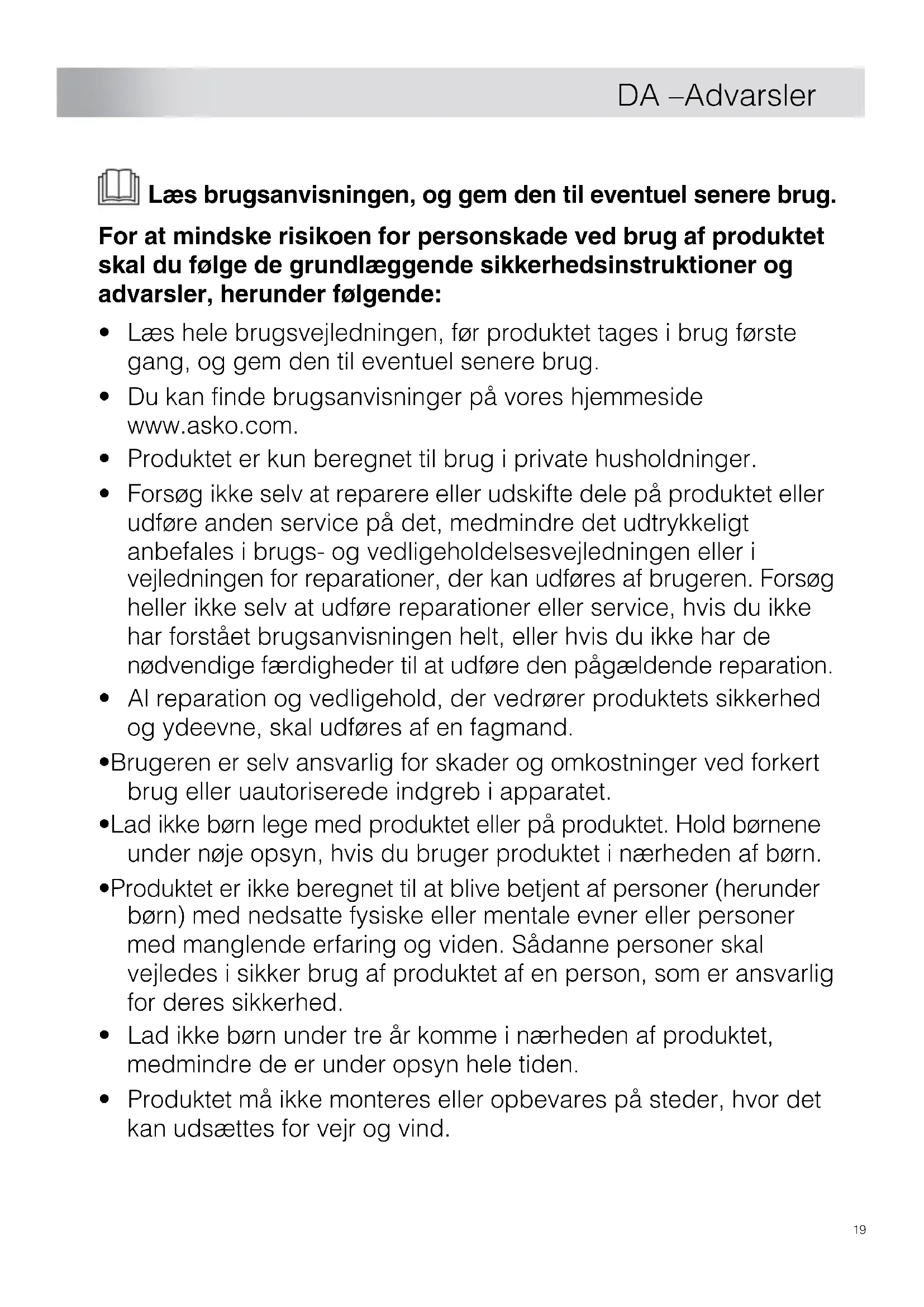 - Du kan finde brugsanvisninger på vores hjemmeside www.asko.com.