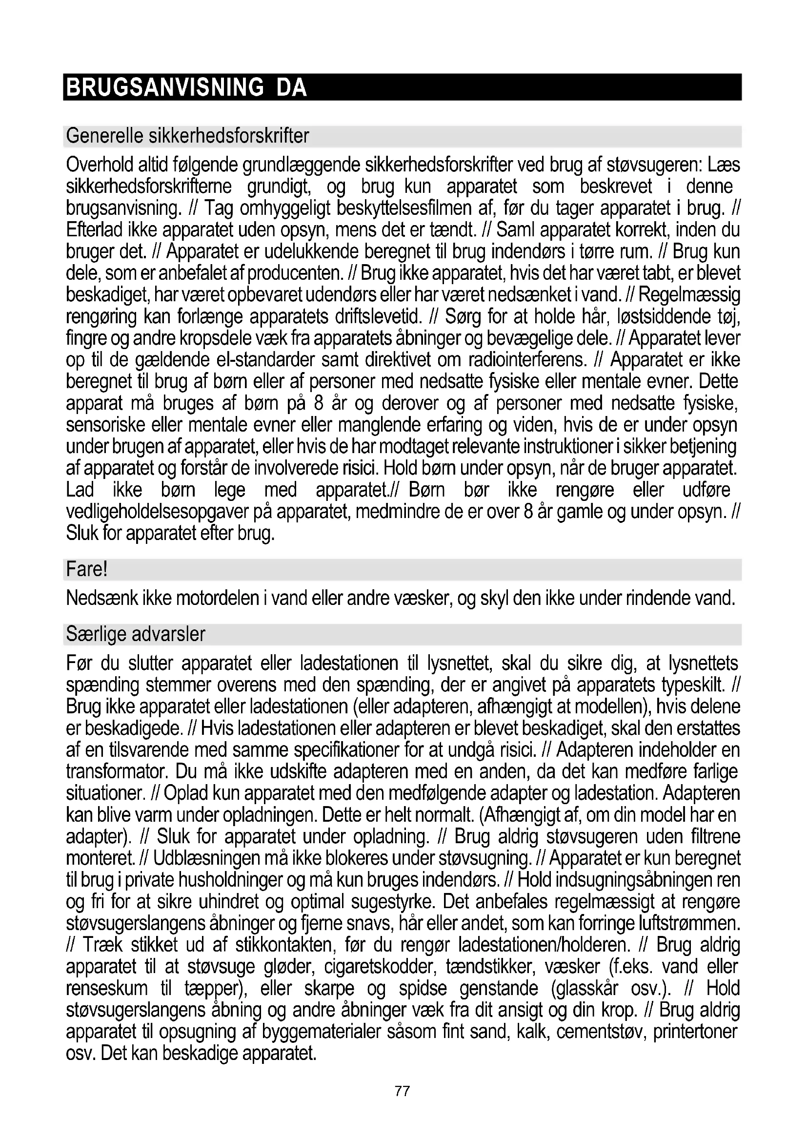 Työnnä puhdistettu tela takaisin harjaan. Paina osan kapea pää aukkoon ja aseta ”kahvallinen” osa takaisin harjan alkuperäiseen osaan... tela on oikealla paikallaan, kun kuulet vaimean napsahduksen. Tarkista ennen pölysäiliön kokoamista, että kaikki osat ovat täysin kuivat. Kosteat osat voivat aiheuttaa imuriin toimintahäiriön. // Työnnä suodatinkehikko säiliöön ja kiinnitä se kiertämällä vastakkaiseen suuntaan kuin irrotettaessa. Kun se on asettunut oikein, kuuluu napsahdus. // Sulje säiliön pohja. Voit tarkistaa suodatinkehikon oikean asennon myös varmistamalla, että säiliön alaosa sulkeutuu helposti ja ettei sen avaamiseen tarvita voimaa. // Säiliön pohjan kiinni pakottaminen voi vahingoittaa sitä. // Aseta yläosassa suodatin asianmukaisesti kehikkoonsa ja säiliöön. // Suodatin on asennettu oikein, kun suodattimen ja suodatinkehikon nuolet ovat kohdakkain. Myös suodattimen ”kahvan” on oltava turvallisesti kiinnitettynä säiliöön. Säiliön asettaminen oikein moottoriosaan // Säiliön etuosa, johon sisältyy letkun liitoskohta, on työnnettävä moottoriosassa oleviin uriin. Vasta sen jälkeen voit työntää säiliön takaosan moottoriosan salpaan. // Jos suodatin on asennettu säiliöön oikein ja säiliö on salvattu uriin oikein, voit liittää säiliön moottoriosaan helposti. // Muussa tapauksessa toista työvaiheet. SUODATTIMEN VAIHTAMINEN Laitteen käyttöiän pidentämiseksi on suositeltava puhdistaa suodatin säännöllisesti jokaisen käyttökerran jälkeen ja vaihtaa se säännöllisessä käytössä 6 kuukauden välein. 76BRUGSANVISNING DA Generelle sikkerhedsforskrifter Overhold altid følgende grundlæggende sikkerhedsforskrifter ved brug af støvsugeren: Læs sikkerhedsforskrifterne grundigt, og brug kun apparatet som beskrevet i denne brugsanvisning. // Tag omhyggeligt beskyttelsesfilmen af, før du tager apparatet i brug. // Efterlad ikke apparatet uden opsyn, mens det er tændt. // Saml apparatet korrekt, inden du bruger det. // Apparatet er udelukkende beregnet til brug indendørs i tørre rum. // Brug kun dele, som er anbefalet af producenten. // Brug ikke apparatet, hvis det har været tabt, er blevet beskadiget, har været opbevaret udendørs eller har været nedsænket i vand. // Regelmæssig rengøring kan forlænge apparatets driftslevetid. // Sørg for at holde hår, løstsiddende tøj, fingre og andre kropsdele væk fra apparatets åbninger og bevægelige dele. // Apparatet lever op til de gældende el-standarder samt direktivet om radiointerferens. // Apparatet er ikke beregnet til brug af børn eller af personer med nedsatte fysiske eller mentale evner. Dette apparat må bruges af børn på 8 år og derover og af personer med nedsatte fysiske, sensoriske eller mentale evner eller manglende erfaring og viden, hvis de er under opsyn under brugen af apparatet, eller hvis de har modtaget relevante instruktioner i sikker betjening af apparatet og forstår de involverede risici. Hold børn under opsyn, når de bruger apparatet. Lad ikke børn lege med apparatet.// Børn bør ikke rengøre eller udføre vedligeholdelsesopgaver på apparatet, medmindre de er over 8 år gamle og under opsyn. // Sluk for apparatet efter brug. Fare! Nedsænk ikke motordelen i vand eller andre væsker, og skyl den ikke under rindende vand. Særlige advarsler Før du slutter apparatet eller ladestationen til lysnettet, skal du sikre dig, at lysnettets spænding stemmer overens med den spænding, der er angivet på apparatets typeskilt. // Brug ikke apparatet eller ladestationen (eller adapteren, afhængigt at modellen), hvis delene er beskadigede. // Hvis ladestationen eller adapteren er blevet beskadiget, skal den erstattes af en tilsvarende med samme specifikationer for at undgå risici. // Adapteren indeholder en transformator. Du må ikke udskifte adapteren med en anden, da det kan medføre farlige situationer. // Oplad kun apparatet med den medfølgende adapter og ladestation. Adapteren kan blive varm under opladningen. Dette er helt normalt. (Afhængigt af, om din model har en adapter). // Sluk for apparatet under opladning. // Brug aldrig støvsugeren uden filtrene monteret. // Udblæsningen må ikke blokeres under støvsugning. // Apparatet er kun beregnet til brug i private husholdninger og må kun bruges indendørs. // Hold indsugningsåbningen ren og fri for at sikre uhindret og optimal sugestyrke. Det anbefales regelmæssigt at rengøre støvsugerslangens åbninger og fjerne snavs, hår eller andet, som kan forringe luftstrømmen. // Træk stikket ud af stikkontakten, før du rengør ladestationen/holderen. // Brug aldrig apparatet til at støvsuge gløder, cigaretskodder, tændstikker, væsker (f.eks. vand eller renseskum til tæpper), eller skarpe og spidse genstande (glasskår osv.). // Hold støvsugerslangens åbning og andre åbninger væk fra dit ansigt og din krop. // Brug aldrig apparatet til opsugning af byggematerialer såsom fint sand, kalk, cementstøv, printertoner osv. Det kan beskadige apparatet. 77Problemer og løsninger Problem Mulig årsag Løsning Fungerer ikke. Batteriet er fladt. Håndstøvsugeren er ikke samlet korrekt. Oplad. Saml håndstøvsugeren korrekt. Sugeevnen er reduceret. Støvbeholderen er fuld.filteret er blokeret. Indsugningsstudsen eller den elektriske børste er blokeret. Hæld støvet ud. Rengør eller udskift filteret. Rengør den elektriske børste. Håndstøvsugeren oplades ikke. Adapteren er ikke sat i en stikkontakt. Stikket fra opladeren er ikke sat i stikket på ladestationen. Håndstøvsugeren er ikke sat sammen med støvsugerkabinettet. Sæt opladeren I en stikkontakt. Sæt opladerens stik I ladestationen. Sæt håndstøvsugeren i støvsugerkabinettet. Brug den meget kort tid efter opladning. Har ikke ladet op længe nok. Batteriet er ved at være udtjent. Oplad jfr. brugsanvisningen. Udskift batteriet. Beskyttelse af miljøet Når apparatet er udtjent, må det ikke bortskaffes sam
