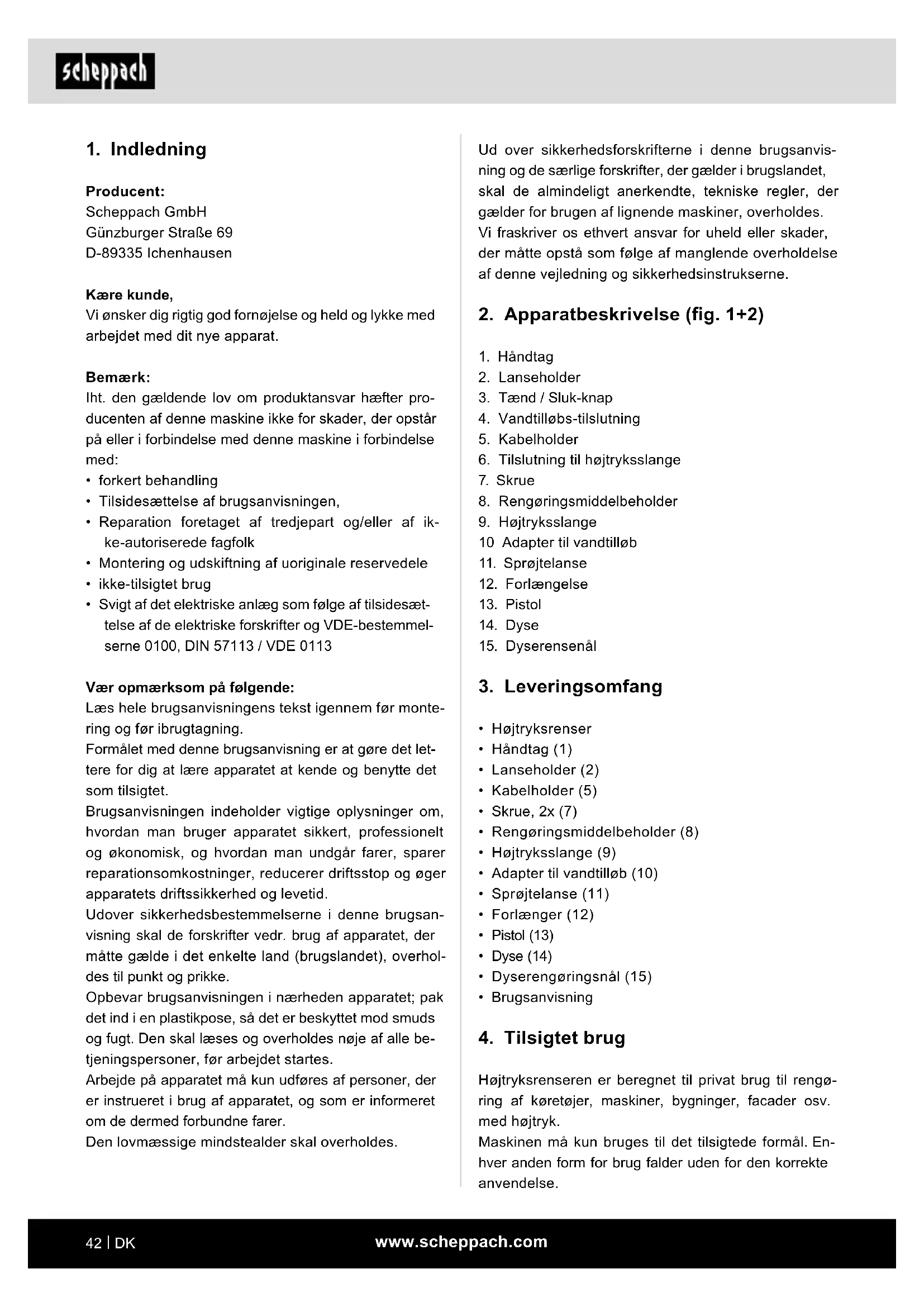 Producent: Scheppach GmbH Günzburger Straße 69 D-89335 Ichenhausen Kære kunde, Vi ønsker dig rigtig god fornøjelse og held og lykke med arbejdet med dit nye apparat. Bemærk: Iht. den gældende lov om produktansvar hæfter pro- ducenten af denne maskine ikke for skader, der opstår på eller i forbindelse med denne maskine i forbindelse med:
