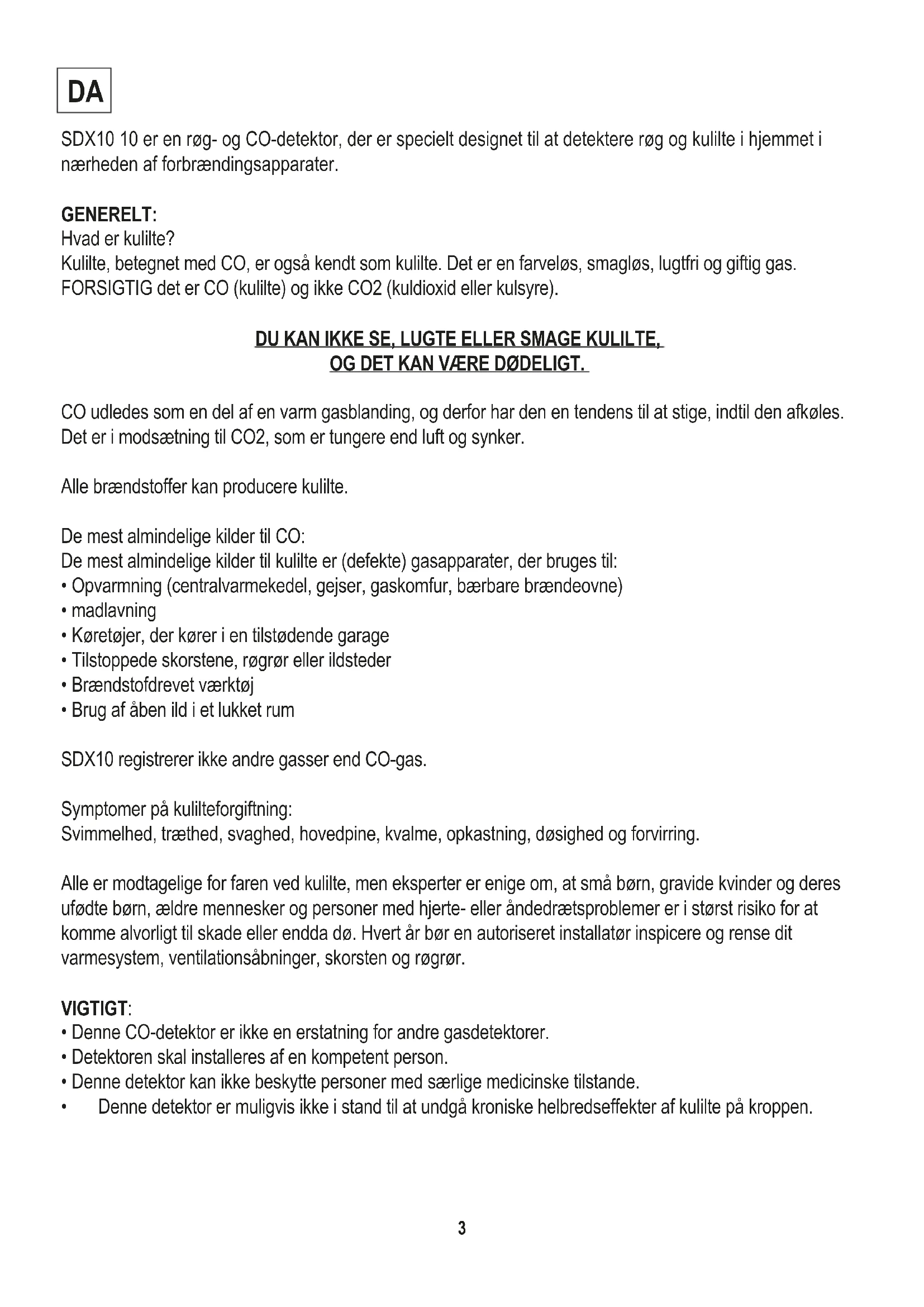 SDX10 10 er en røg- og CO-detektor, der er specielt designet til at detektere røg og kulilte i hjemmet i nærheden af forbrændingsapparater. GENERELT: Hvad er kulilte? Kulilte, betegnet med CO, er også kendt som kulilte. Det er en farveløs, smagløs, lugtfri og giftig gas. FORSIGTIG det er CO (kulilte) og ikke CO2 (kuldioxid eller kulsyre). DU KAN IKKE SE, LUGTE ELLER SMAGE KULILTE, OG DET KAN VÆRE DØDELIGT. CO udledes som en del af en varm gasblanding, og derfor har den en tendens til at stige, indtil den afkøles. Det er i modsætning til CO2, som er tungere end luft og synker. Alle brændstoffer kan producere kulilte. De mest almindelige kilder til CO: De mest almindelige kilder til kulilte er (defekte) gasapparater, der bruges til: