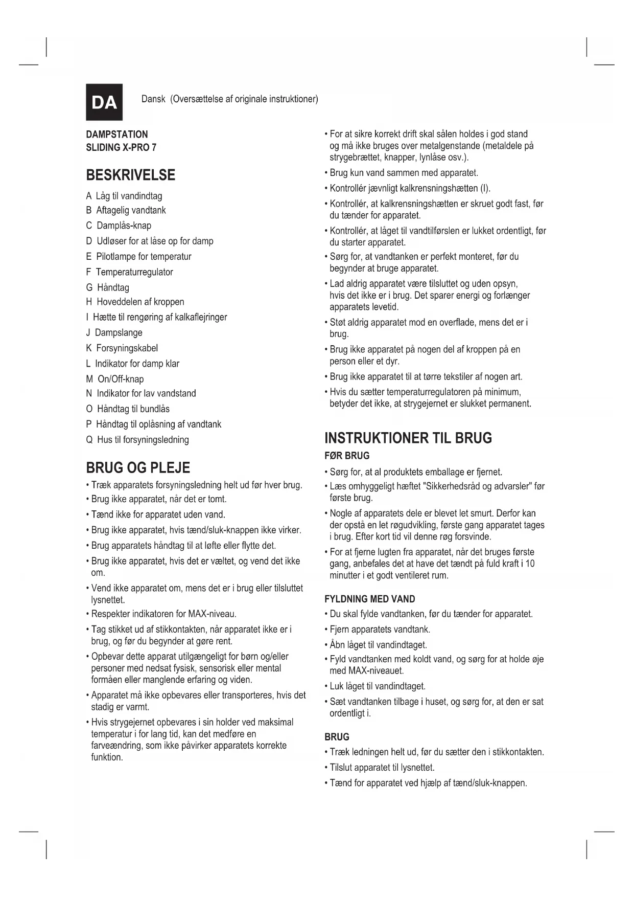 DAMPSTATION SLIDING X-PRO 7 BESKRIVELSE A Låg til vandindtag B Aftagelig vandtank C Damplås-knap D Udløser for at låse op for damp E Pilotlampe for temperatur F Temperaturregulator G Håndtag H Hoveddelen af kroppen I Hætte til rengøring af kalkaejringer J Dampslange K Forsyningskabel L Indikator for damp klar M On/Off-knap N Indikator for lav vandstand O Håndtag til bundlås P Håndtag til oplåsning af vandtank Q Hus til forsyningsledning