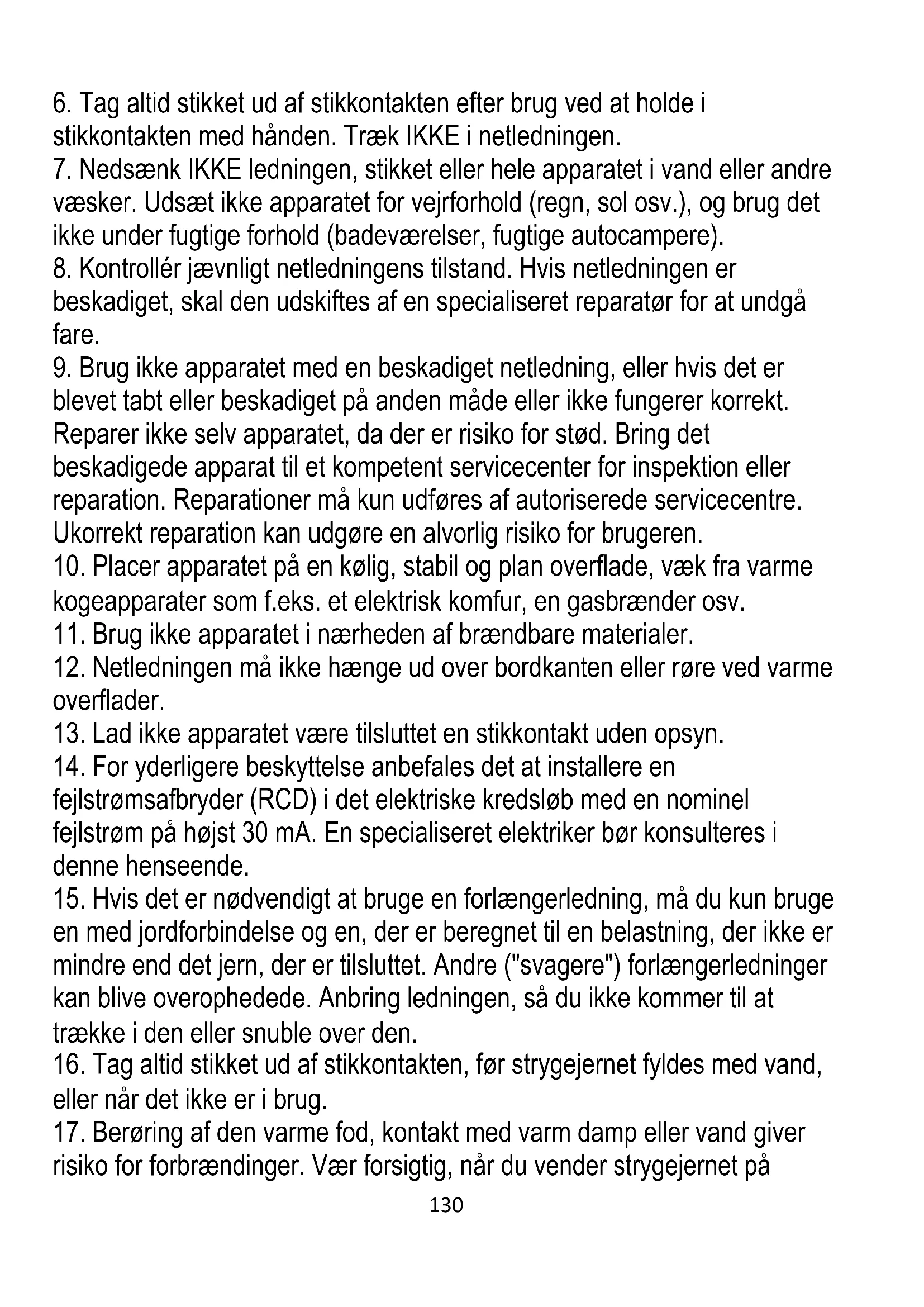 nedsat fysisk, sensorisk eller mental kapacitet eller personer uden erfaring eller kendskab til udstyret, hvis det sker under opsyn af en person, der er ansvarlig for deres sikkerhed, eller hvis de har fået instruktioner om sikker brug af udstyret og er klar over de farer, der er forbundet med brugen af det. Børn må ikke lege med udstyret. Rengøring og vedligeholdelse af udstyret bør ikke udføres af børn, medmindre de er over 8 år, og aktiviteten udføres under opsyn.130