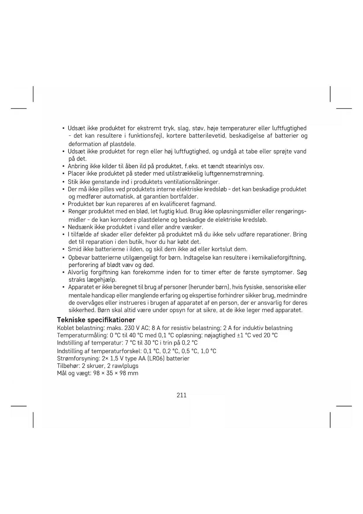 - Placer ikke produktet på steder, der er udsat for vibrationer og stød - det kan forårsage skader.211