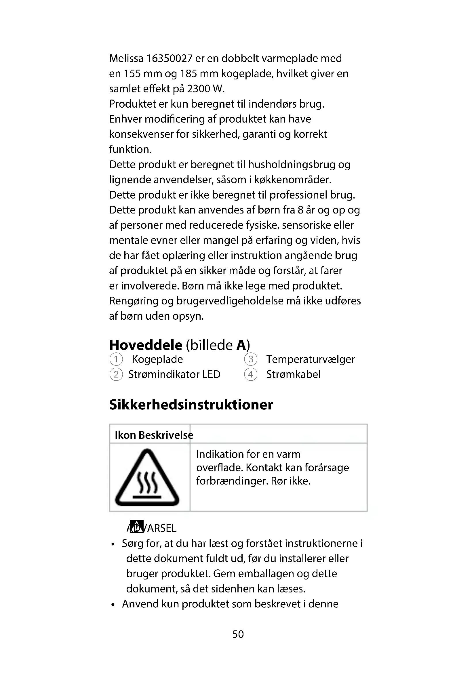 Vejledning til hurtig start Dobbelt varmeplade 16350027Yderligere oplysninger ndes i den udvidede manual online. Tilsigtet brug50 Melissa 16350027 er en dobbelt varmeplade med en 155 mm og 185 mm kogeplade, hvilket giver en samlet eekt på 2300 W. Produktet er kun beregnet til indendørs brug. Enhver modicering af produktet kan have konsekvenser for sikkerhed, garanti og korrekt funktion. Dette produkt er beregnet til husholdningsbrug og lignende anvendelser, såsom i køkkenområder. Dette produkt er ikke beregnet til professionel brug. Dette produkt kan anvendes af børn fra 8 år og op og af personer med reducerede fysiske, sensoriske eller mentale evner eller mangel på erfaring og viden, hvis de har fået oplæring eller instruktion angående brug af produktet på en sikker måde og forstår, at farer er involverede. Børn må ikke lege med produktet. Rengøring og brugervedligeholdelse må ikke udføres af børn uden opsyn. Hoveddele (billede A) 1 Kogeplade 2 Strømindikator LED 3 Temperaturvælger 4 Strømkabel Sikkerhedsinstruktioner Ikon Beskrivelse Indikation for en varm overade. Kontakt kan forårsage forbrændinger. Rør ikke.