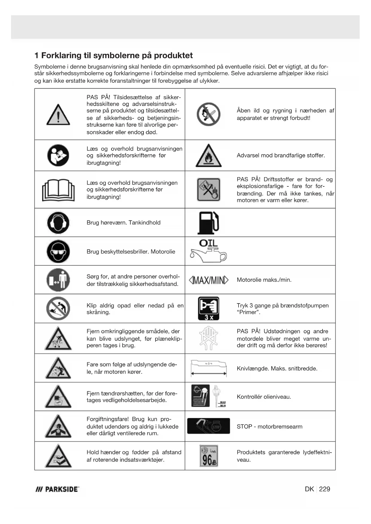 11a. 1 x Ramme 1 x Brugsanvisning 5 Tilsigtet brug Den benzindrevne plæneklipper er egnet til brug i al- mindelige private haver. Med plæneklippere til almin- delige private haver forstås maskiner, der normalt ikke bruges mere end 50 timer om året, og som især bru- ges til plejning af græsarealer eller græsplæner, men ikke til offentlige anlæg, parker, idrætsanlæg samt land- og skovbrug. Produktet må kun bruges som tilsigtet. Enhver anden form for brug falder uden for tilsigtet brug. Brugeren, og ikke producenten, bærer ansvaret for materielle skader eller personskader af enhver art, der måtte op- stå som følge heraf. Tilsigtet brug omfatter også overholdelse af sikker- hedsforskrifterne og monteringsvejledningen samt driftsanvisningerne i brugsanvisningen. Personer, der anvender og vedligeholder produktet, skal være fortrolige med dette og være informeret om mulige farer. Hvis der foretages ændringer ved produktet, bortfalder producentens ansvar for deraf følgende skader. DK | 231Produktet må kun bruges med originale dele og origi- nalt tilbehør fra producenten. Producentens forskrifter vedrørende sikkerhed, ar- bejdsmåde og vedligeholdelse samt målene, som er angivet i de tekniske data, skal overholdes. ADVARSEL Læs for din egen sikkerheds skyld denne brugsan- visning og de generelle sikkerhedsforskrifter grundigt igennem inden ibrugtagning af produktet. Gives pro- duktet videre til tredjemand, skal du sørge for, at brugsanvisningen følger med. 6 Utilsigtet brug Vær opmærksom på, at vores produkter ikke er kon- strueret til erhvervsmæssig, håndværksmæssig eller in- dustriel brug. Vi fraskriver os ethvert ansvar, hvis pro- duktet bruges i erhvervs-, håndværks- eller industri- øjemed eller lignende arbejde. ADVARSEL På grund af den fysiske fare for brugeren må plæneklipperen ikke anvendes til føl- gende arbejde (ufuldstændig liste): – til trimning af buske, hække og strå, – til klipning af klatreplanter, – til plænepleje på tagbeplantninger og i altankas- ser, – til flisning og findeling af træ- og hækafklip, – til rengøring af fortove (støvsugning, bortblæs- ning), – til udjævning af jordhøjder som f.eks. muldvarpe- skud, – til transport af skæremateriale, undtagen i den medfølgende græsfangspose. Forklaring til signalord i brugsanvisningen FARE Signalord til angivelse af en overhængende farlig situation, som, hvis den ikke undgås, vil medføre død eller alvorlig personskade. ADVARSEL Signalord til angivelse af en potentielt farlig situation, som, hvis den ikke undgås, kan medføre død eller alvorlig personskade. FORSIGTIG Signalord til angivelse af en potentielt farlig situation, som, hvis den ikke undgås, kan medføre mindre eller moderat personska- de. PAS PÅ Signalord til angivelse af en potentielt farlig situation, som, hvis den ikke undgås, kan medføre materielle skader på produktet el- ler ejendom/besiddelse. 7 Sikkerhedsforskrifter Opbevar alle sikkerhedsforskrifter og anvisninger til fremtidig brug! ADVARSEL Læs alle sikkerhedshenvisninger, anvisnin- ger, illustrationer og tekniske data, der føl- ger med dette produkt. Forsømmelighed ved iagttagelse af følgende anvis- ningerne kan forårsage alvorlige personskader. ADVARSEL Gør dig fortrolig med alle betjeningsdele, før du ar- bejder med produktet. – Øv dig i håndteringen af produktet, og få funkti- on, virkemåde og arbejdsteknikker forklaret af en erfaren bruger eller en fagmand. – Forvis dig om, at du kan slukke for produktet med det samme i nødsituationer. – Ukorrekt brug af produktet kan medføre alvorlige personskader. – Hvis der opstår ulykker eller funktionsfejl under brug, skal produktet straks slukkes. Sørg for at behandle tilskadekomne omhyggeligt, og kontakt læge. Produktet må ikke benyttes af: