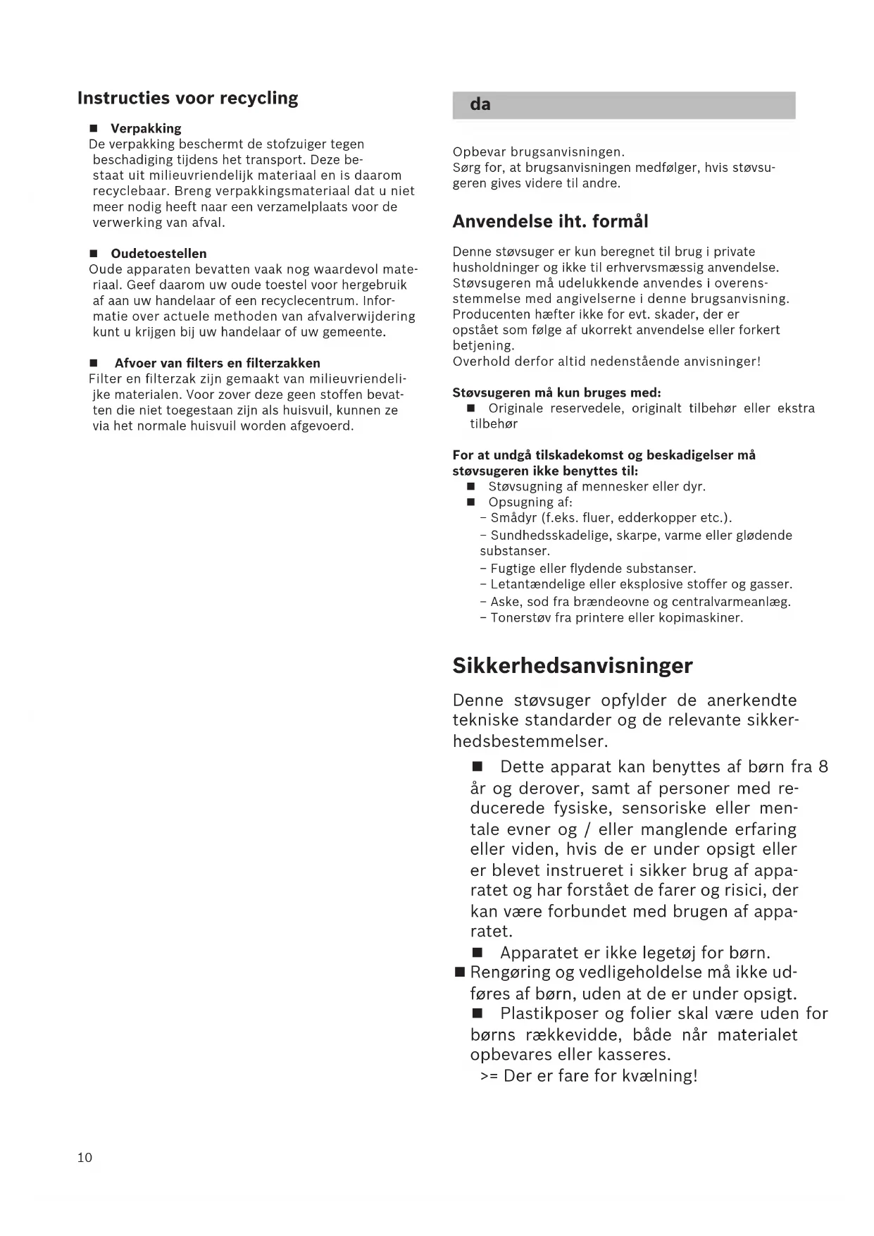 Let op Als de zekering in de meterkast bij het inschakelen van het toestel wordt geactiveerd, dan kan dit wor- den veroorzaakt doordat er tegelijkertijd meerdere elektrische apparaten met hoge aansluitwaarde op hetzelfde stroomcircuit zijn aangesloten. De zekering wordt onvermijdelijk geactiveerd wan- neer u alvorens het toestel aan te zetten de laagste stand instelt en pas daarna een hogere stand kiest. nl10 Instructies voor recycling Verpakking De verpakking beschermt de stofzuiger tegen beschadiging tijdens het transport. Deze be- staat uit milieuvriendelijk materiaal en is daarom recyclebaar. Breng verpakkingsmateriaal dat u niet meer nodig heeft naar een verzamelplaats voor de verwerking van afval. Oude toestellen Oude apparaten bevatten vaak nog waardevol mate- riaal. Geef daarom uw oude toestel voor hergebruik af aan uw handelaar of een recyclecentrum. Infor- matie over actuele methoden van afvalverwijdering kunt u krijgen bij uw handelaar of uw gemeente. Afvoer van filters en filterzakken Filter en filterzak zijn gemaakt van milieuvriendeli- jke materialen. Voor zover deze geen stoffen bevat- ten die niet toegestaan zijn als huisvuil, kunnen ze via het normale huisvuil worden afgevoerd. Opbevar brugsanvisningen. Sørg for, at brugsanvisningen medfølger, hvis støvsu- geren gives videre til andre. Anvendelse iht. formål Denne støvsuger er kun beregnet til brug i private husholdninger og ikke til erhvervsmæssig anvendelse. Støvsugeren må udelukkende anvendes i overens- stemmelse med angivelserne i denne brugsanvisning. Producenten hæfter ikke for evt. skader, der er opstået som følge af ukorrekt anvendelse eller forkert betjening. Overhold derfor altid nedenstående anvisninger! Støvsugeren må kun bruges med: Originale reservedele, originalt tilbehør eller ekstra tilbehør For at undgå tilskadekomst og beskadigelser må støvsugeren ikke benyttes til: Støvsugning af mennesker eller dyr. Opsugning af: − Smådyr (f.eks. fluer, edderkopper etc.). − Sundhedsskadelige, skarpe, varme eller glødende substanser. − Fugtige eller flydende substanser. − Letantændelige eller eksplosive stoffer og gasser. − Aske, sod fra brændeovne og centralvarmeanlæg. − Tonerstøv fra printere eller kopimaskiner. Sikkerhedsanvisninger Denne støvsuger opfylder de anerkendte tekniske standarder og de relevante sikker- hedsbestemmelser. Dette apparat kan benyttes af børn fra 8 år og derover, samt af personer med re- ducerede fysiske, sensoriske eller men- tale evner og / eller manglende erfaring eller viden, hvis de er under opsigt eller er blevet instrueret i sikker brug af appa- ratet og har forstået de farer og risici, der kan være forbundet med brugen af appa- ratet. Apparatet er ikke legetøj for børn. Rengøring og vedligeholdelse må ikke ud- føres af børn, uden at de er under opsigt. Plastikposer og folier skal være uden for børns rækkevidde, både når materialet opbevares eller kasseres. >= Der er fare for kvælning! da11 Korrekt anvendelse Støvsugeren må kun tilsluttes og anvendes iht. types- kiltet. Der må aldrig støvsuges uden filterpose hhv. støvbe- holder, motorbeskyttelses- og udblæsningsfilter. >= Apparatet kan blive beskadiget! Undgå at støvsuge med mundstykke eller rør i nærhe- den af hovedet. >= Der er fare for tilskadekomst! Ved støvsugning af trapper, skal apparatet altid være placeret lavere end brugeren. Benyt ikke nettilslutningsledningen eller slangen til at bære / transportere støvsugeren med. Hvis apparatets nettilslutningsledning er beskadiget, skal den udskiftes af fabrikanten, fabrikantens kunde- service eller lignende kvalificeret person for at undgå fare. Hvis støvsugeren anvendes uafbrudt i flere timer, skal nettilslutningsledningen rulles helt ud. Træk ikke i tilslutningsledningen men i stikket for at tage stikket ud af stikkontakten. Undlad at trække netledningen hen over skarpe kan- ter, og sørg for, at den ikke kommer i klemme. Træk altid netstikket ud af kontakten, inden der foreta- ges nogen form for arbejde på støvsugeren. Støvsugeren må ikke anvendes, hvis den er beskadi- get. Træk netstikket ud af kontakten i tilfælde af en funktionsfejl. For at undgå fare må reparationer af støvsugeren og udskiftning af reservedele kun udføres af et autorise- ret serviceværksted. Støvsugeren skal beskyttes mod fugt, vejr og vind samt påvirkning fra varmekilder. Hæld ikke brændbare eller alkoholholdige substanser på filtrene (filterpose, motorbeskyttelsesfilter, ud- blæsningsfilter etc.). Støvsugeren er ikke beregnet til anvendelse på bygge- pladser. >= Opsugning af byggeaffald kan beskadige appara- tet. Sluk for apparatet, når der ikke støvsuges. Kasserede apparater skal gøres ubrugelige med det samme og herefter bortskaffes efter forskrifterne.