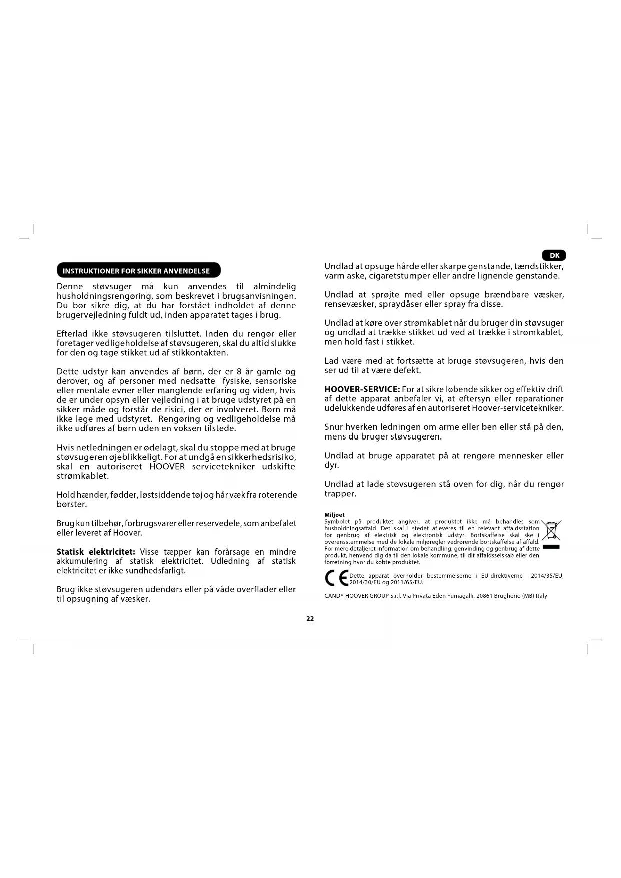 Denne støvsuger må kun anvendes til almindelig husholdningsrengøring, som beskrevet i brugsanvisningen. Du bør sikre dig, at du har forstået indholdet af denne brugervejledning fuldt ud, inden apparatet tages i brug. Efterlad ikke støvsugeren tilsluttet. Inden du rengør eller foretager vedligeholdelse af støvsugeren, skal du altid slukke for den og tage stikket ud af stikkontakten. Dette udstyr kan anvendes af børn, der er 8 år gamle og derover, og af personer med nedsatte fysiske, sensoriske eller mentale evner eller manglende erfaring og viden, hvis de er under opsyn eller vejledning i at bruge udstyret på en sikker måde og forstår de risici, der er involveret. Børn må ikke lege med udstyret. Rengøring og vedligeholdelse må ikke udføres af børn uden en voksen tilstede. Hvis netledningen er ødelagt, skal du stoppe med at bruge støvsugeren øjeblikkeligt. For at undgå en sikkerhedsrisiko, skal en autoriseret HOOVER servicetekniker udskifte strømkablet. Hold hænder, fødder, løstsiddende tøj og hår væk fra roterende børster. Brug kun tilbehør, forbrugsvarer eller reservedele, som anbefalet eller leveret af Hoover. Statisk elektricitet: Visse tæpper kan forårsage en mindre akkumulering af statisk elektricitet. Udledning af statisk elektricitet er ikke sundhedsfarligt. Brug ikke støvsugeren udendørs eller på våde overflader eller til opsugning af væsker. Undlad at opsuge hårde eller skarpe genstande, tændstikker, varm aske, cigaretstumper eller andre lignende genstande. Undlad at sprøjte med eller opsuge brændbare væsker, rensevæsker, spraydåser eller spray fra disse. Undlad at køre over strømkablet når du bruger din støvsuger og undlad at trække stikket ud ved at trække i strømkablet, men hold fast i stikket. Lad være med at fortsætte at bruge støvsugeren, hvis den ser ud til at være defekt. HOOVER-SERVICE: For at sikre løbende sikker og effektiv drift af dette apparat anbefaler vi, at eftersyn eller reparationer udelukkende udføres af en autoriseret Hoover-servicetekniker. Snur hverken ledningen om arme eller ben eller stå på den, mens du bruger støvsugeren. Undlad at bruge apparatet på at rengøre mennesker eller dyr. Undlad at lade støvsugeren stå oven for dig, når du rengør trapper. Miljøet Symbolet på produktet angiver, at produktet ikke må behandles som husholdningsaffald. Det skal i stedet afleveres til en relevant affaldsstation for genbrug af elektrisk og elektronisk udstyr. Bortskaffelse skal ske i overensstemmelse med de lokale miljøregler vedrørende bortskaffelse af affald. For mere detaljeret information om behandling, genvinding og genbrug af dette produkt, henvend dig da til den lokale kommune, til dit affaldsselskab eller den forretning hvor du købte produktet. Dette apparat overholder bestemmelserne i EU-direktiverne 2014/35/EU, 2014/30/EU og 2011/65/EU. CANDY HOOVER GROUP S.r.l. Via Privata Eden Fumagalli, 20861 Brugherio (MB) Italy DK23