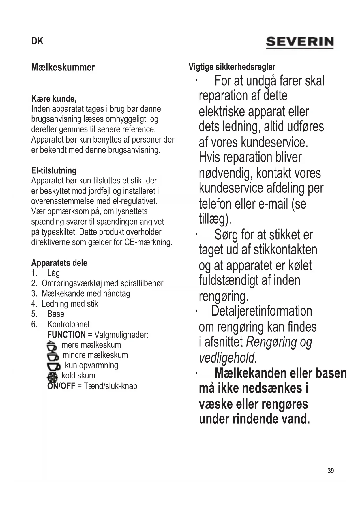 FUNCTION = Valgmuligheder: mere mælkeskum mindre mælkeskum kun opvarmning kold skum ON/OFF = Tænd/sluk-knap Vigtige sikkerhedsregler ∙ For at undgå farer skal reparation af dette elektriske apparat eller dets ledning, altid udføres af vores kundeservice. Hvis reparation bliver nødvendig, kontakt vores kundeservice afdeling per telefon eller e-mail (se tillæg). ∙ Sørg for at stikket er taget ud af stikkontakten og at apparatet er kølet fuldstændigt af inden rengøring. ∙ Detaljeret information omrengøringkanndes i afsnittet Rengøring og vedligehold. ∙ Mælkekanden eller basen må ikke nedsænkes i væske eller rengøres under rindende vand. DK40 104 x 142 mm ∙ Advarsel: Det elektriske kontaktpunkt i basen skal til enhver tid beskyttes mod mulig spild af væsker. ∙ Mælkeskummeren må kun benyttes sammen med den tilhørende base. ∙ Advarsel: Misbrug kan forårsage alvorlig personskade. ∙ Brug altid mælkekandens håndtag,daoveradenkan være meget varm under og efter brug. ∙ Dette apparat er beregnet til privat brug eller i tilsvarende omgivelser, såsom - i tekøkkener, kontorer eller andre mindre virksomheder, - landbrugsvirksomheder, - af kunder på hoteller, moteller m.m. og tilsvarende foretagender, - B&B pensionater. ∙ Dette apparat kan benyttes af børn (som er mindst 8 år) og af personer med reducerede fysiske, sensoriske eller mentale evner, eller mangel på erfaring eller viden, såfremt de har fået vejledning og instruktion i brugen af dette apparat og fuldt ud forstår alle farer og forholdsregler vedrørende sikkerheden som brug af apparatet medfører. ∙ Børn må aldrig få lov til at lege med apparatet. ∙ Børn må aldrig få lov til at udføre rengørings- eller vedligeholdelsesarbejde på dette apparat, medmindre de er under opsyn og mindst 8 år gamle. ∙ Apparatet og dets ledning må altid holdes væk fra børn som er yngre en 8 år.104 x 142 mm